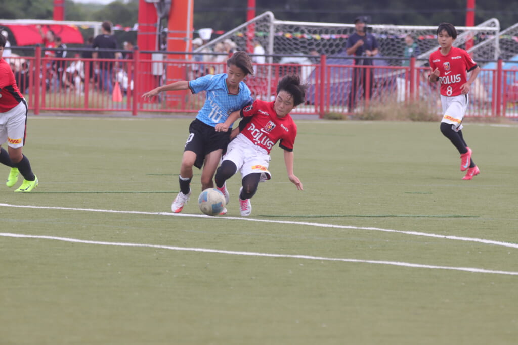 中央へ持ち込んだ新堀に対しては、レッズ、秦が粘り強く寄せ、左サイドへ展開。しかし、サイドを変え右サイド、楠本が前に持ち込もうとするところで新堀が体を入れ、マイボールに。