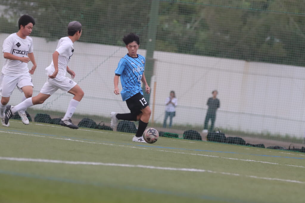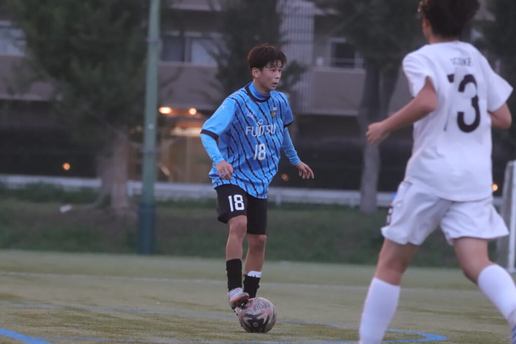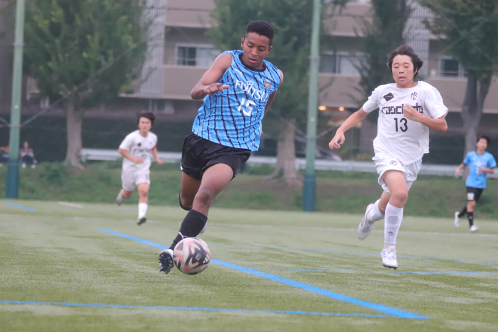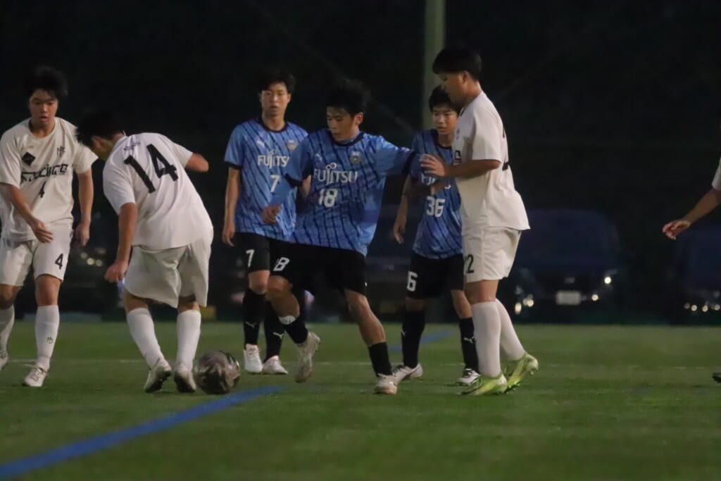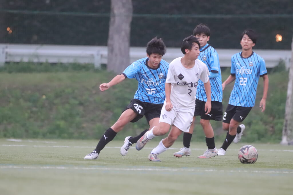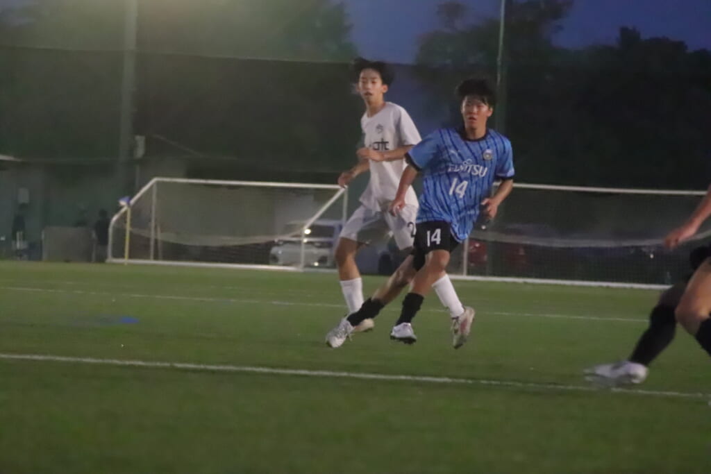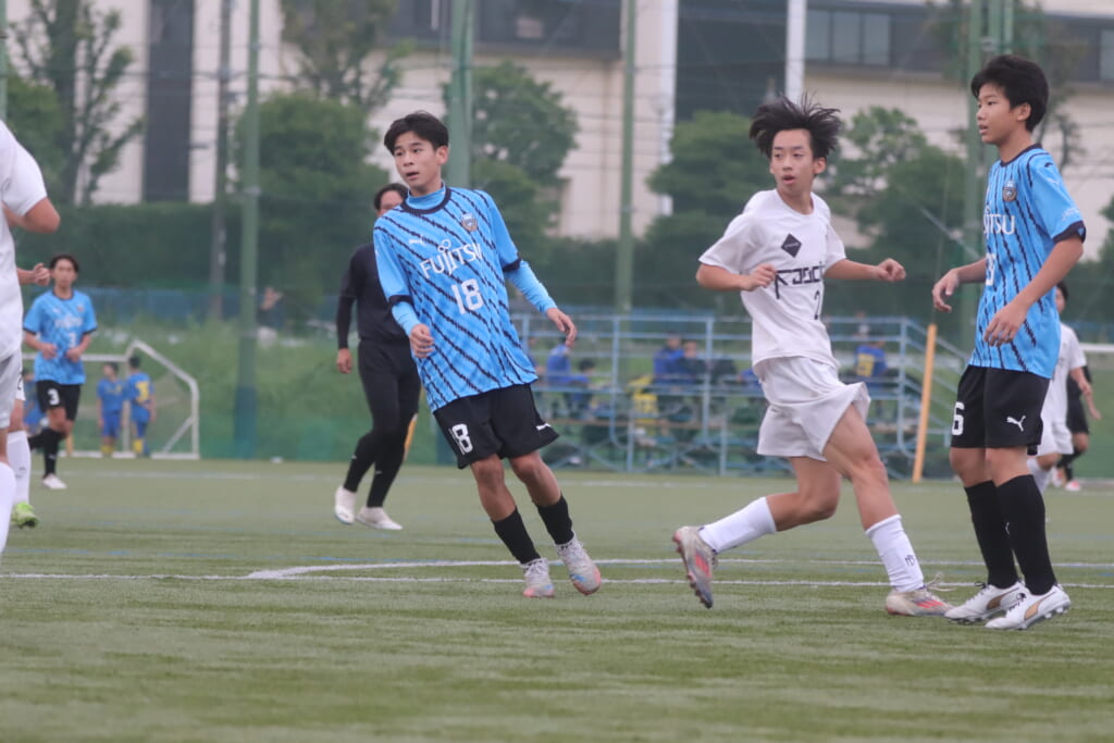 さらにフロンターレ等々力は、中央で遠山煌斗がうまく体を入れ、ボールをものにしていきますが、ファサネイトも粘り強く奪い返す場面をつくり、19分には2がパス交換からエリア正面へ。しかし、それをしのいだフロンターレ等々力は、下がり目でオガーが受けキープを図りますが、オフサイドに。