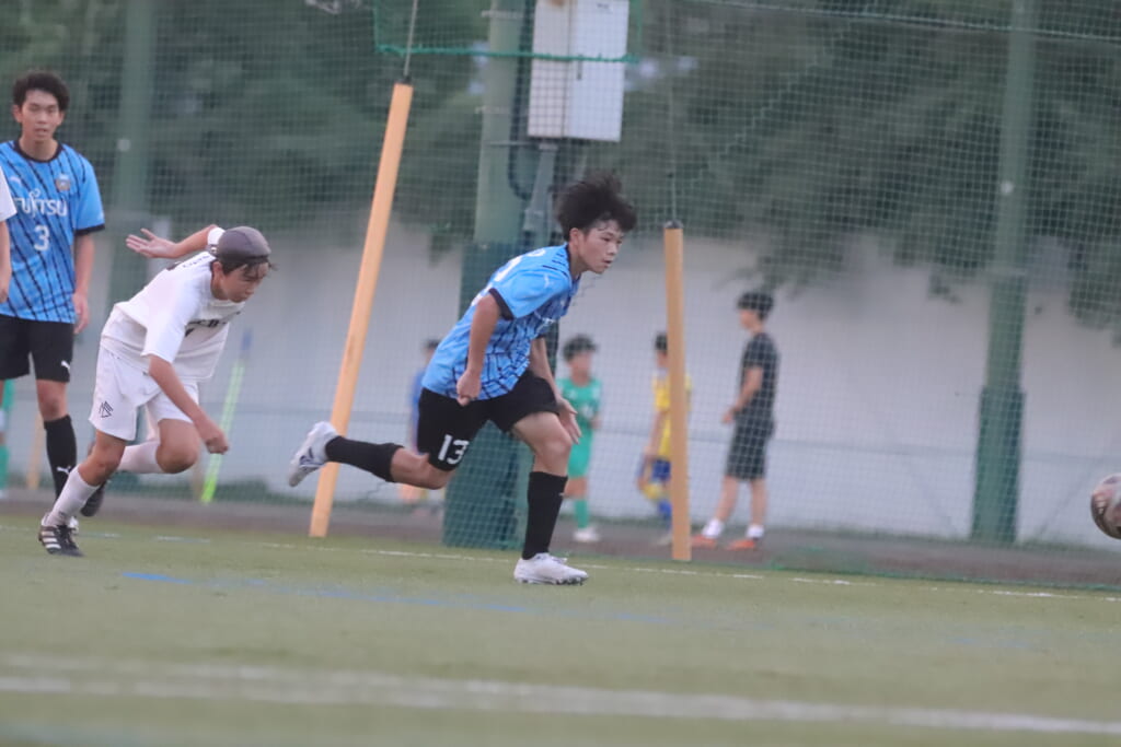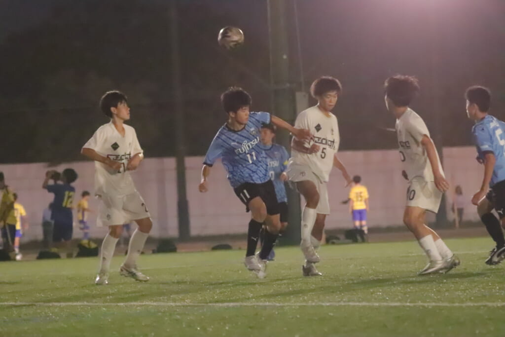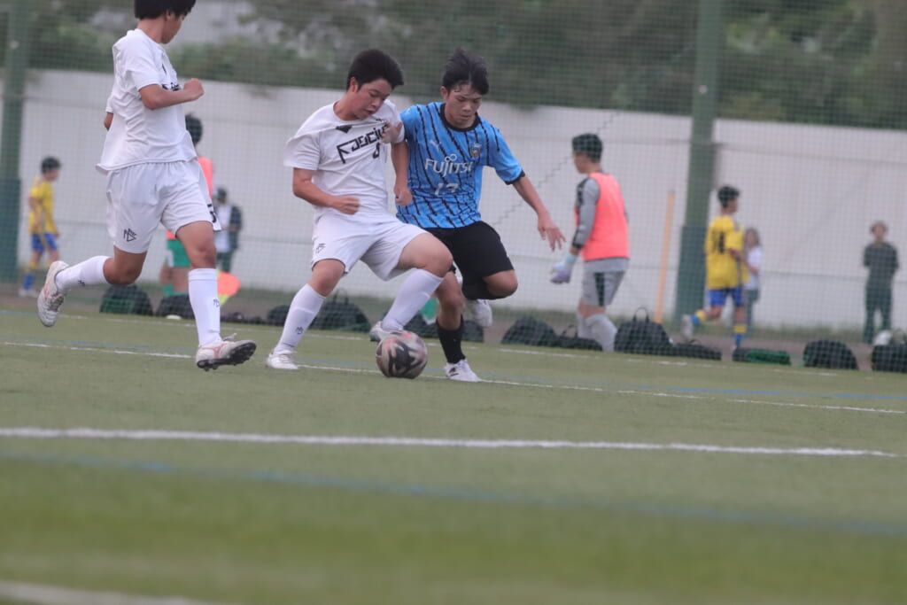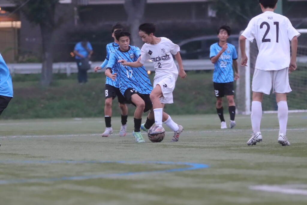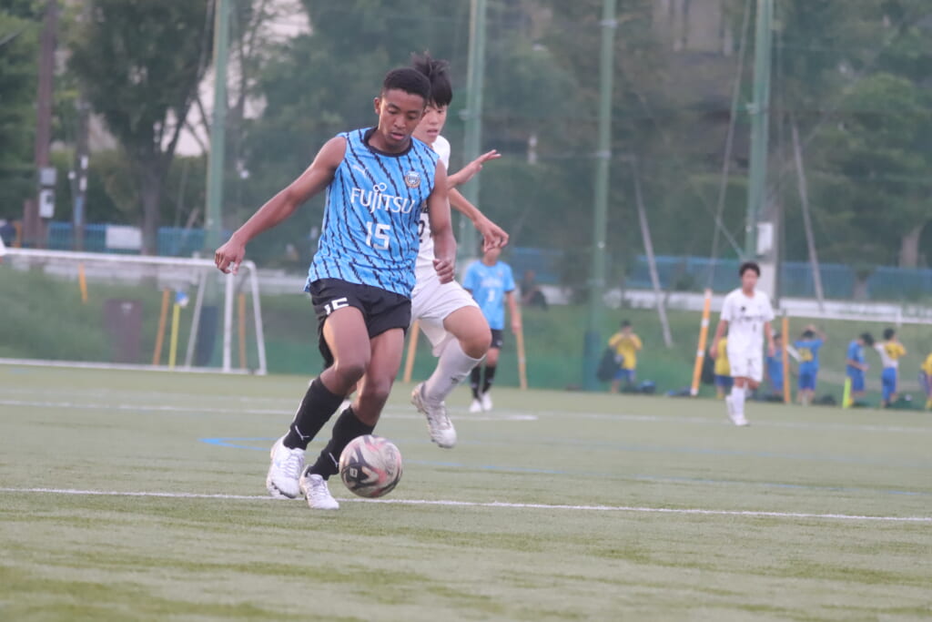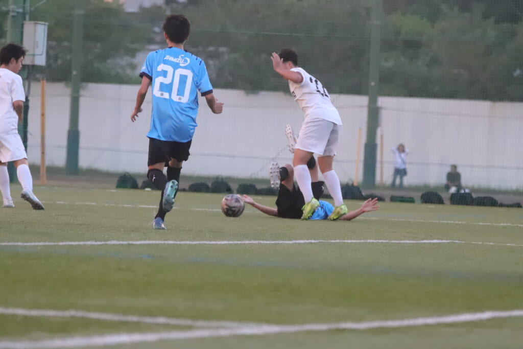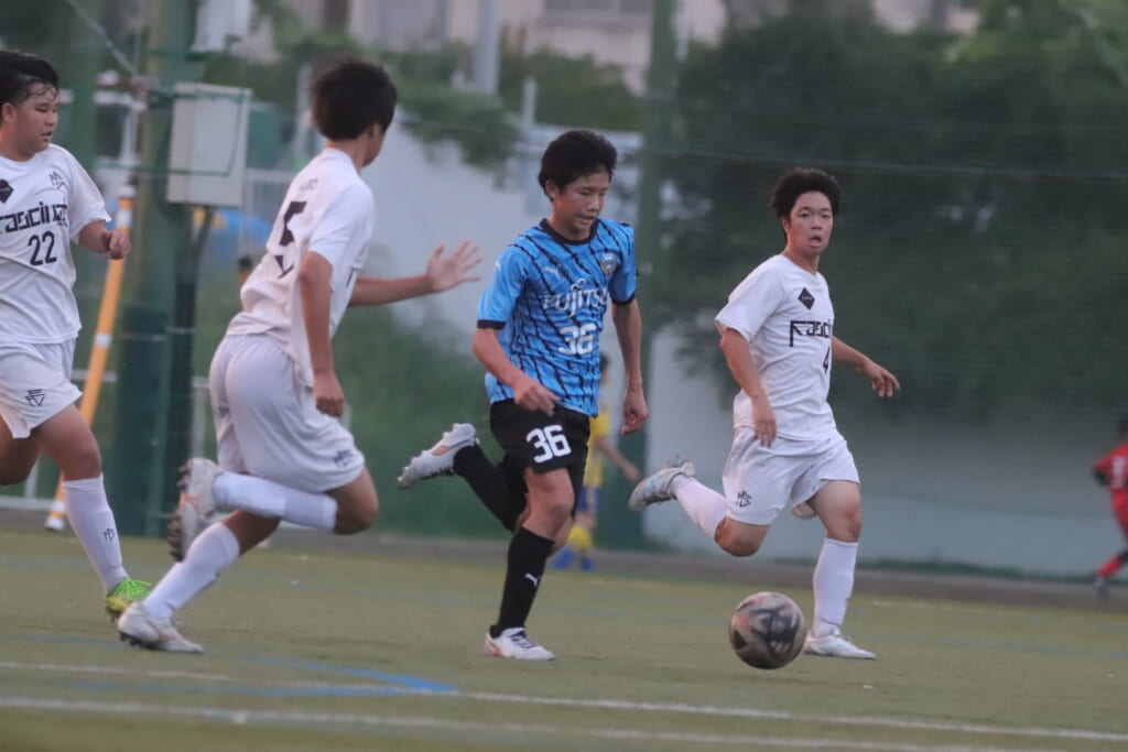 さらにフロンターレ等々力は、中央で遠山煌斗がうまく体を入れ、ボールをものにしていきますが、ファサネイトも粘り強く奪い返す場面をつくり、19分には2がパス交換からエリア正面へ。しかし、それをしのいだフロンターレ等々力は、下がり目でオガーが受けキープを図りますが、オフサイドに。