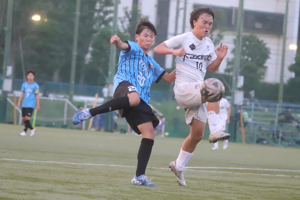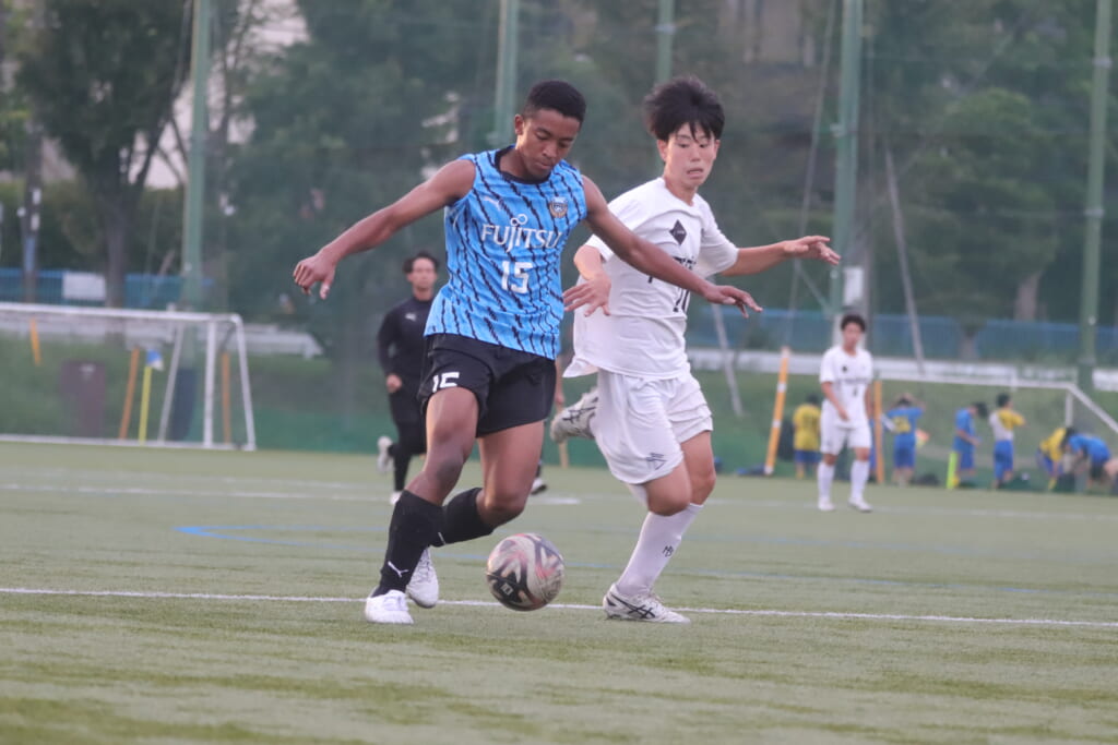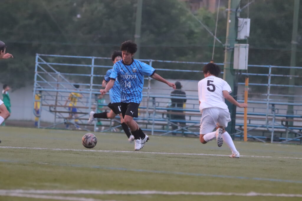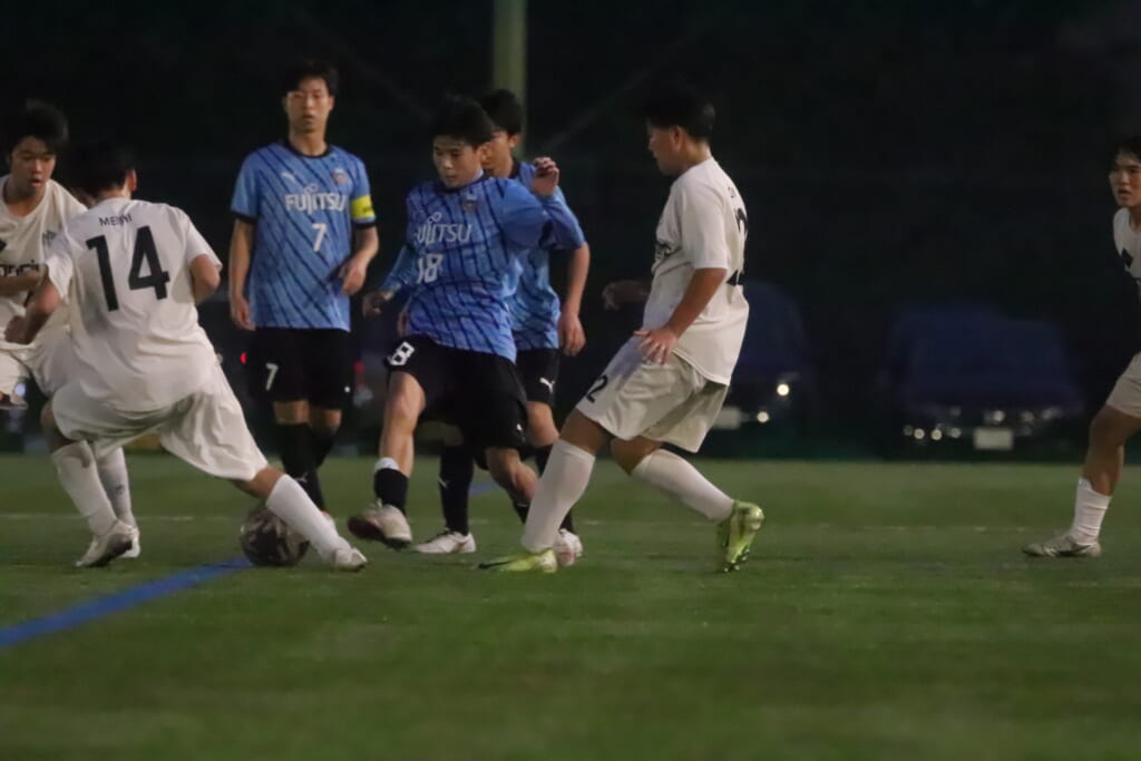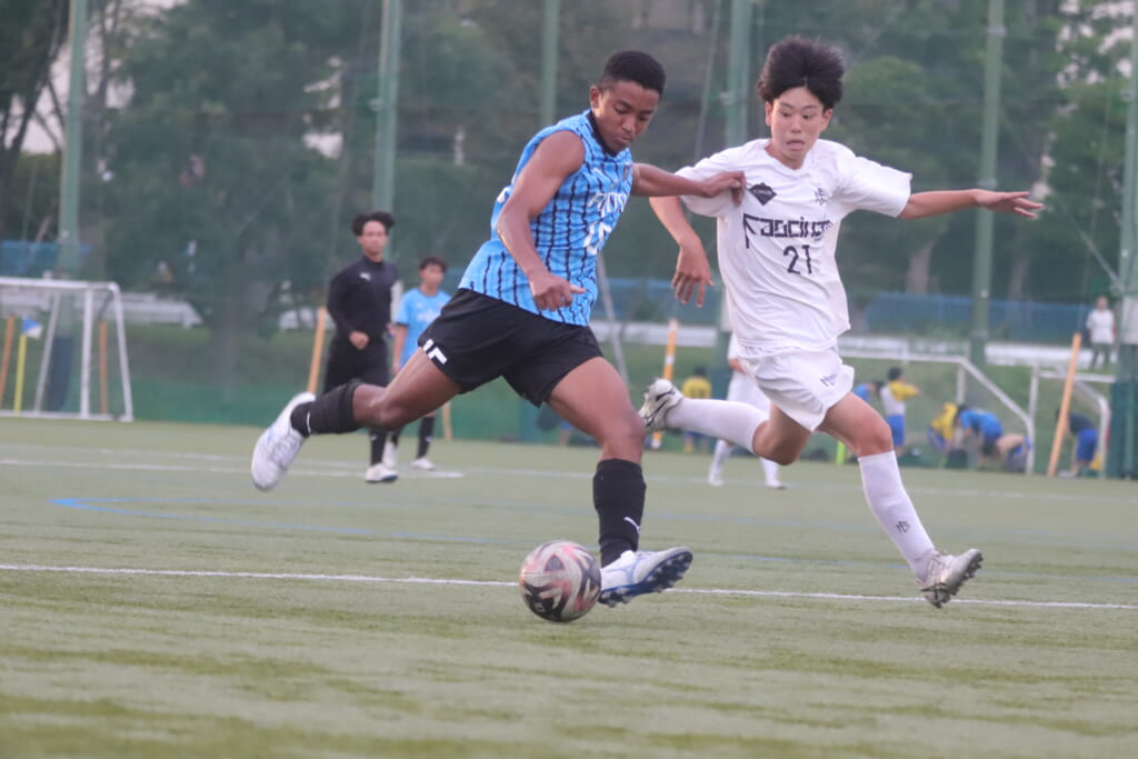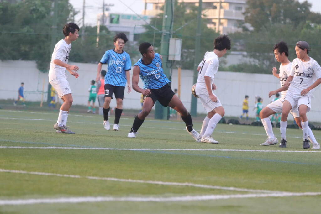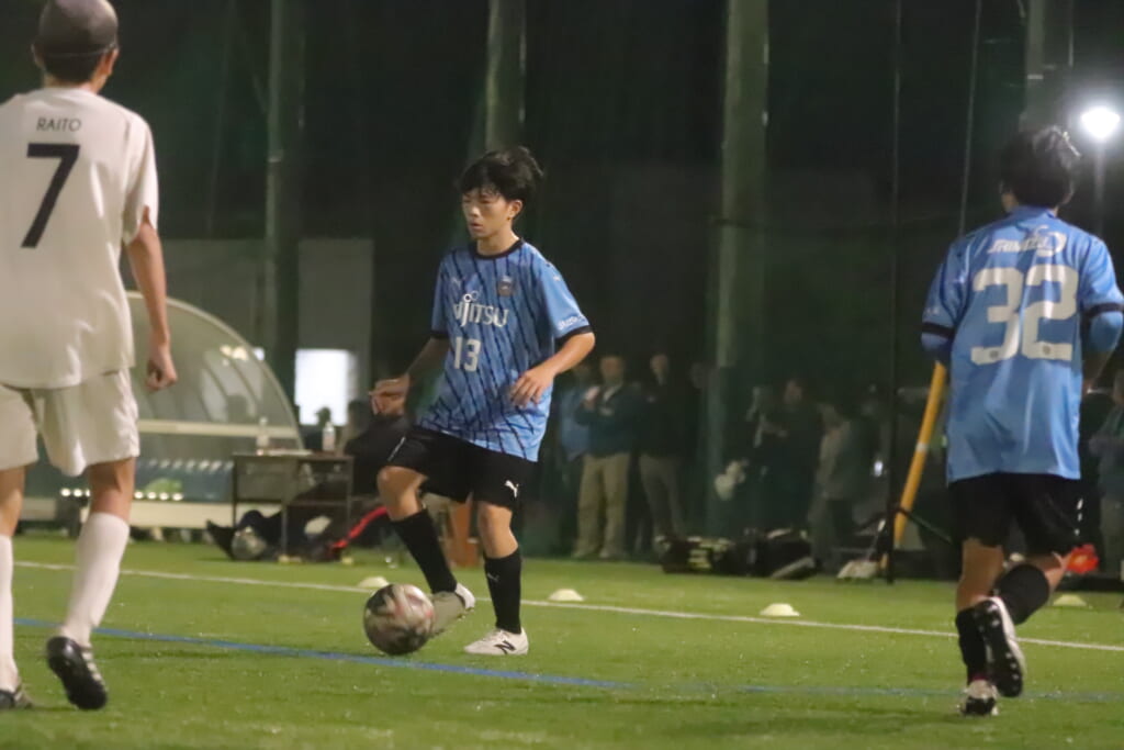 さらにフロンターレ等々力は、中央で遠山煌斗がうまく体を入れ、ボールをものにしていきますが、ファサネイトも粘り強く奪い返す場面をつくり、19分には2がパス交換からエリア正面へ。しかし、それをしのいだフロンターレ等々力は、下がり目でオガーが受けキープを図りますが、オフサイドに。
