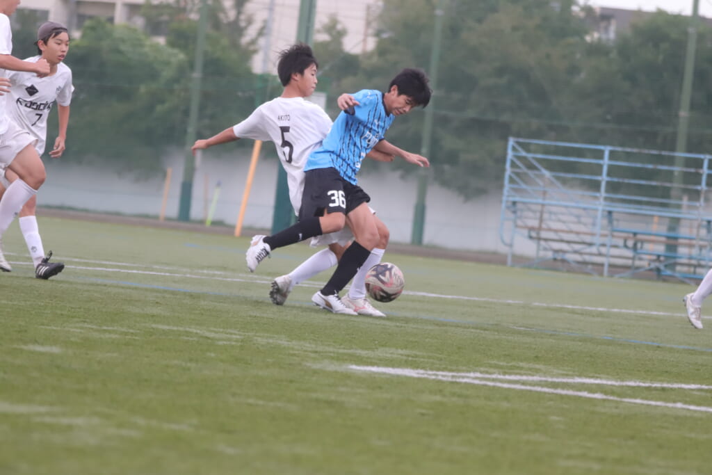 すると再び自陣から組み立てを図るフロンターレ等々力は、小坂や野田、渡部朝陽がかかわり、サイドを変えながら動かしていくと35分には、池田から大寺、大寺から左サイド、笠原へ。笠原はサイドチェンジ、右サイドへ展開すると遠山煌斗、中矢、遠山頼斗がかかわってボールを動かしたフロンターレ等々力は、再びサイドを変え、左サイドからの攻めに。木田がエリア左へ抜け出し、シュート。ニアをとらえますが、99がセーブ。