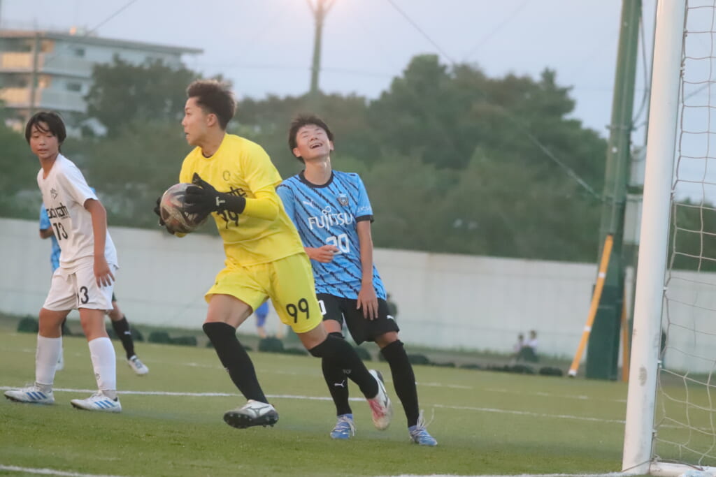 フロンターレ等々力は、さらに渡部朝陽が中央へ速いパスを入れていきますが、ファサネイトは2が中央でカット。2は前に持ち込もうとしていきますが、フロンターレ等々力は遠山煌斗が奪い返し、前に持ち出し、右サイドへパスを出すとオガーがエリア正面右へ。しかし、GKの99が前に出てクリアする好守。