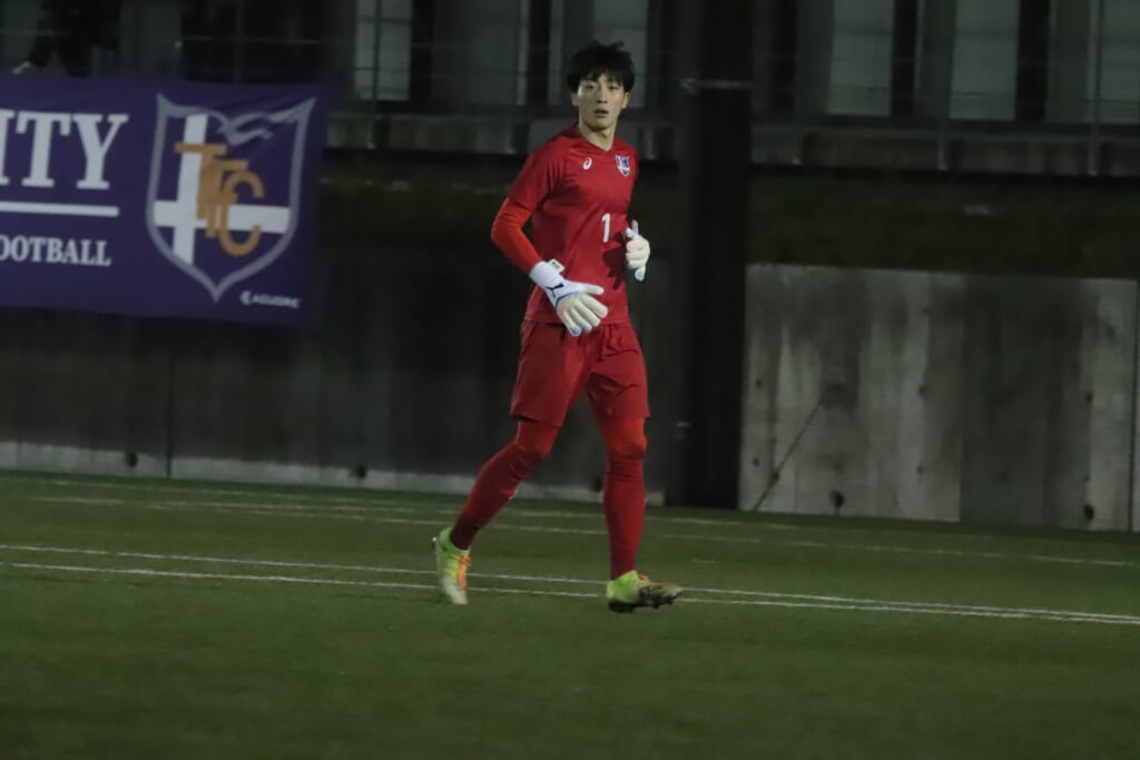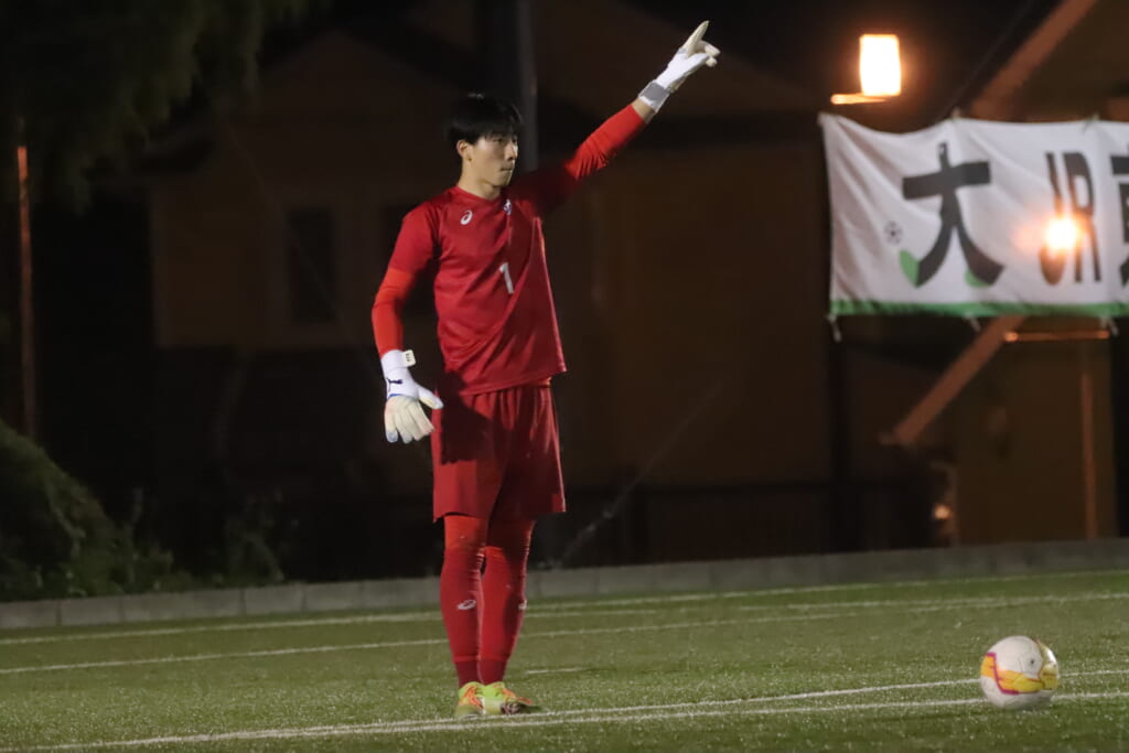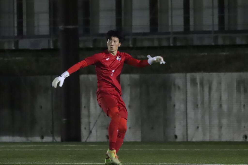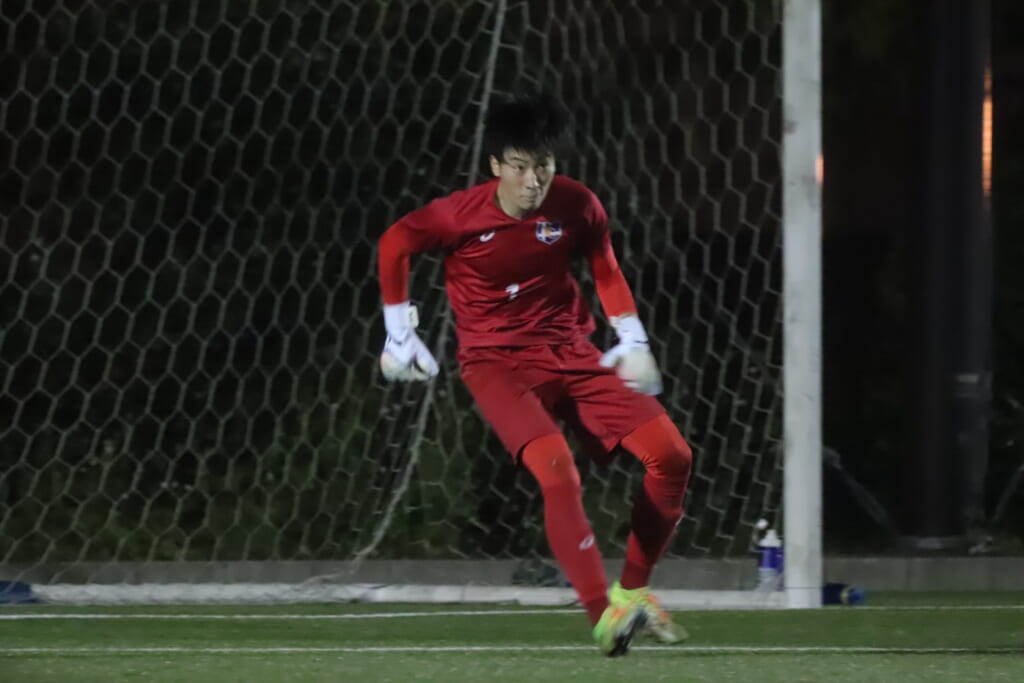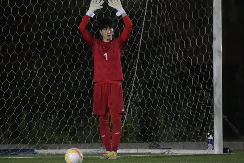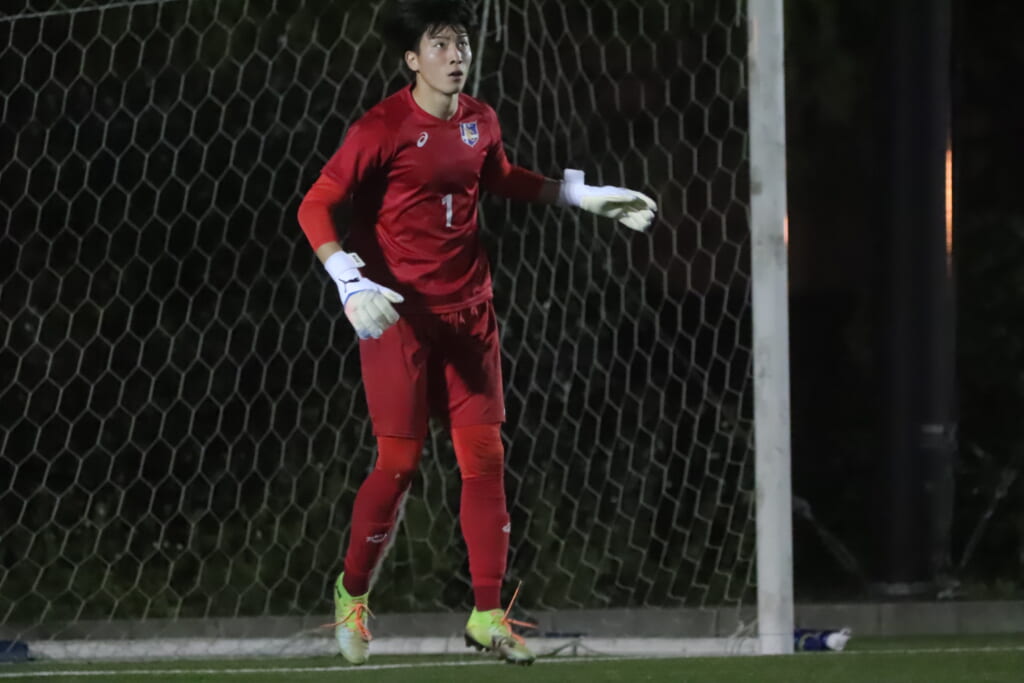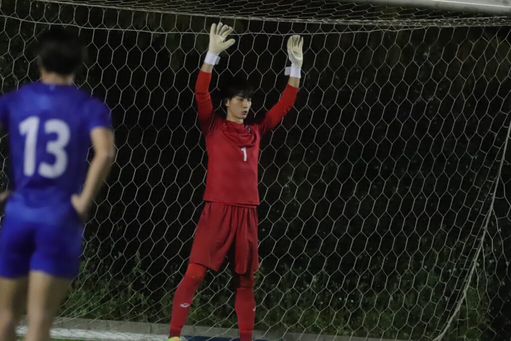 試合は、国士舘大がうまくサイドに展開。何度も折り返しからチャンスをつくるも、DF5丸山大和やDF3田畑知起がエリア内で何度も集中した対応を見せ、菊池もクロスやコーナーキックなどの場面では、ボールをきっちりセーブするなど、チャンスはつくらせず。