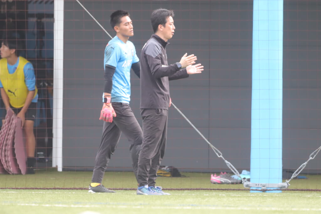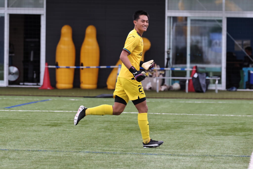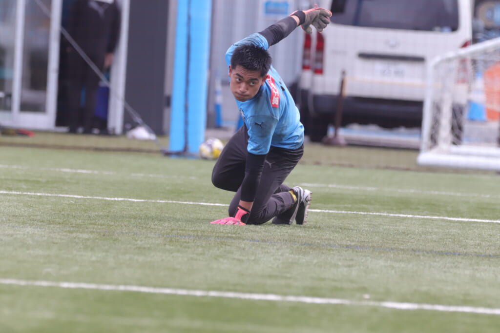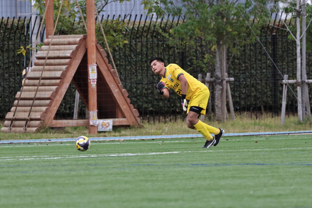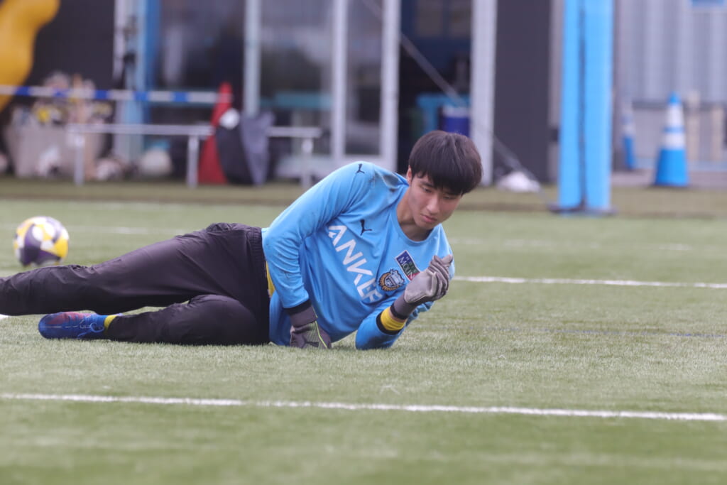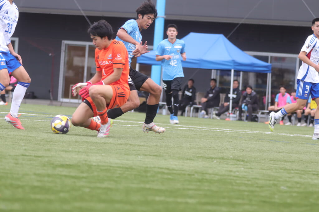 35分には、マリノス、小幡のスルーパスに、齊藤芭流がエリア内へ抜け出しそうになりますが、岡本が前に出て対応。シュートは打たせずにしのいでいきます。