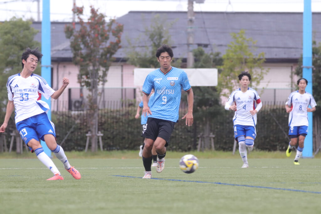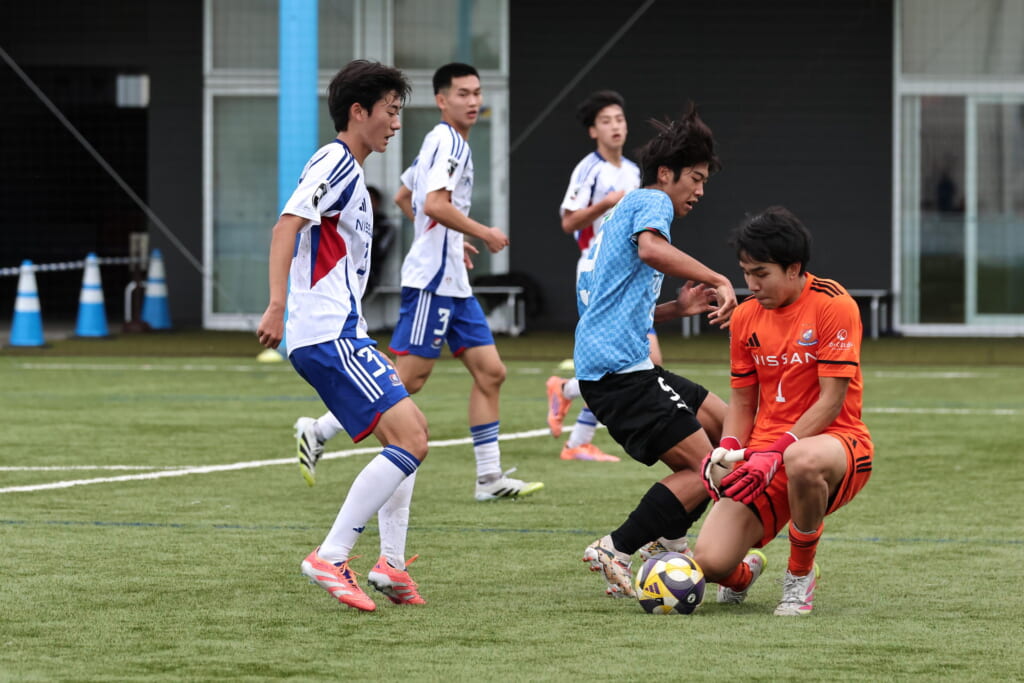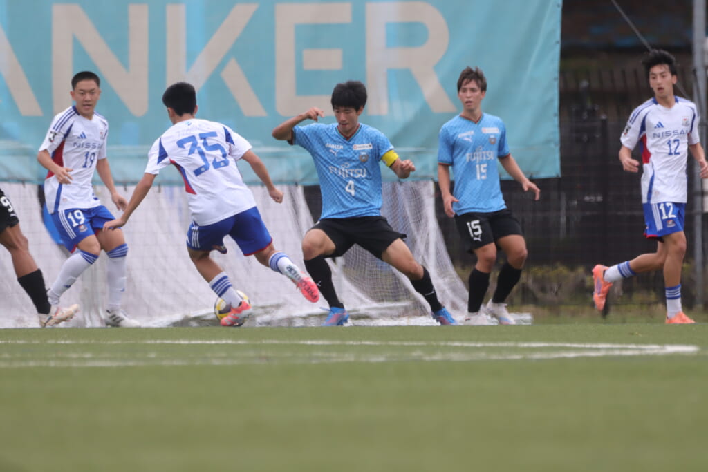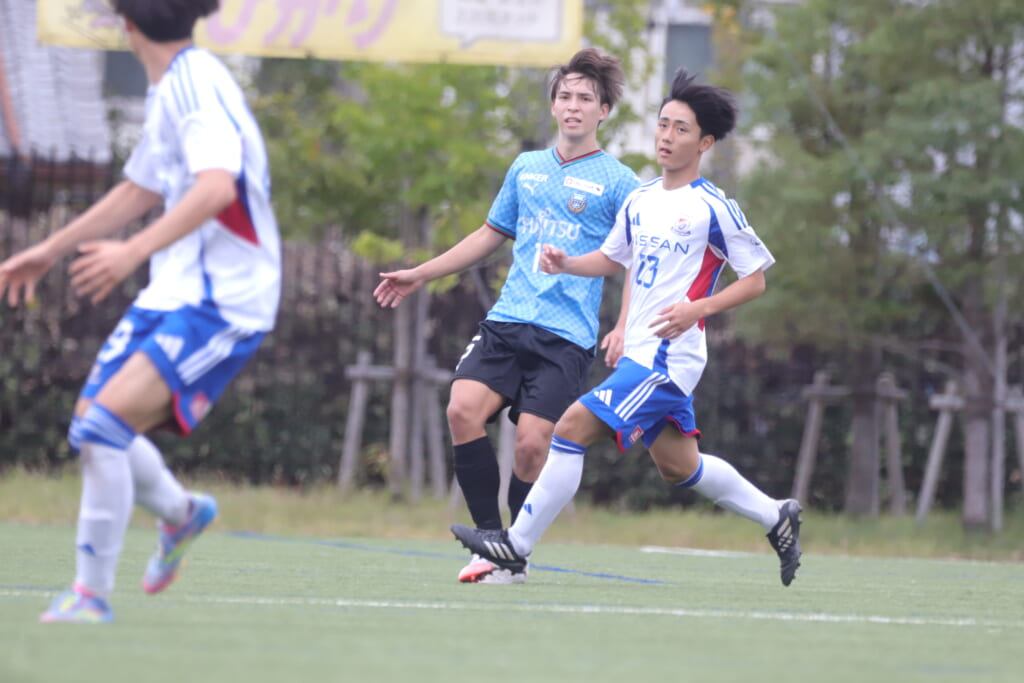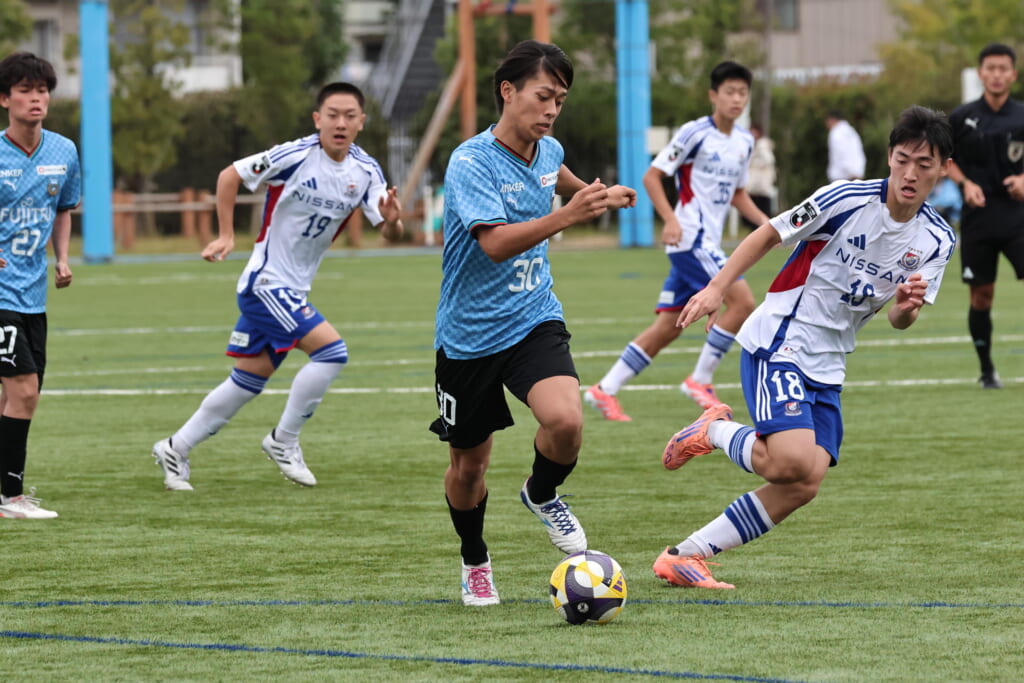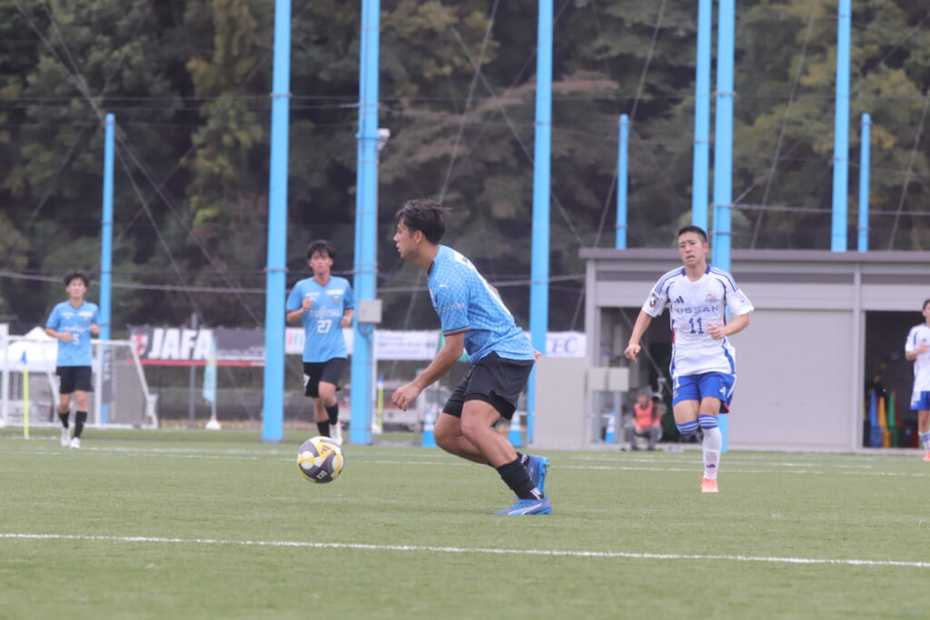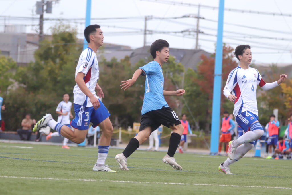 10分には、マリノス、齊藤芭流が左サイドから中央へ持ち込み、そのパスに抜け出した草野がエリア外左へ。草野は折り返しますが、川西がカバーしていきます。