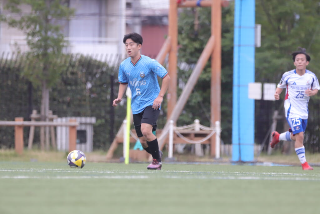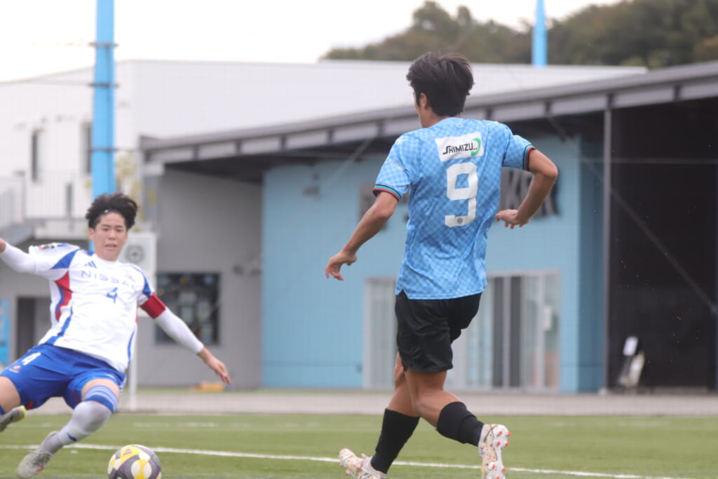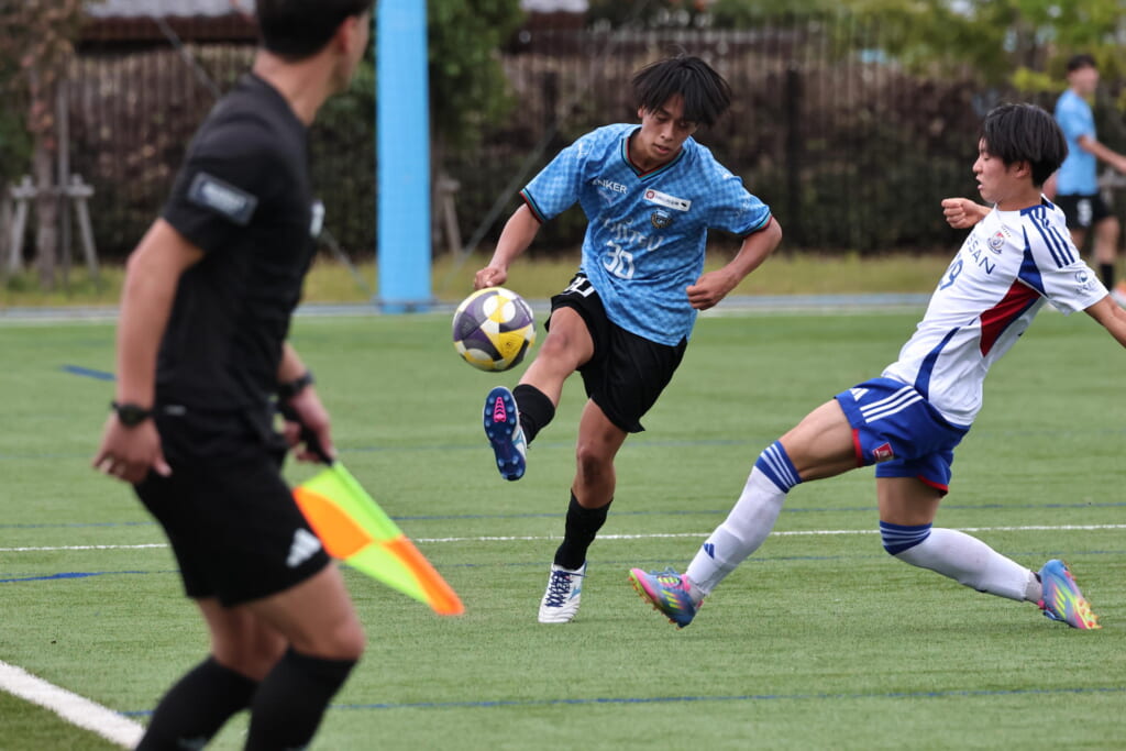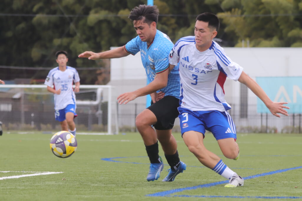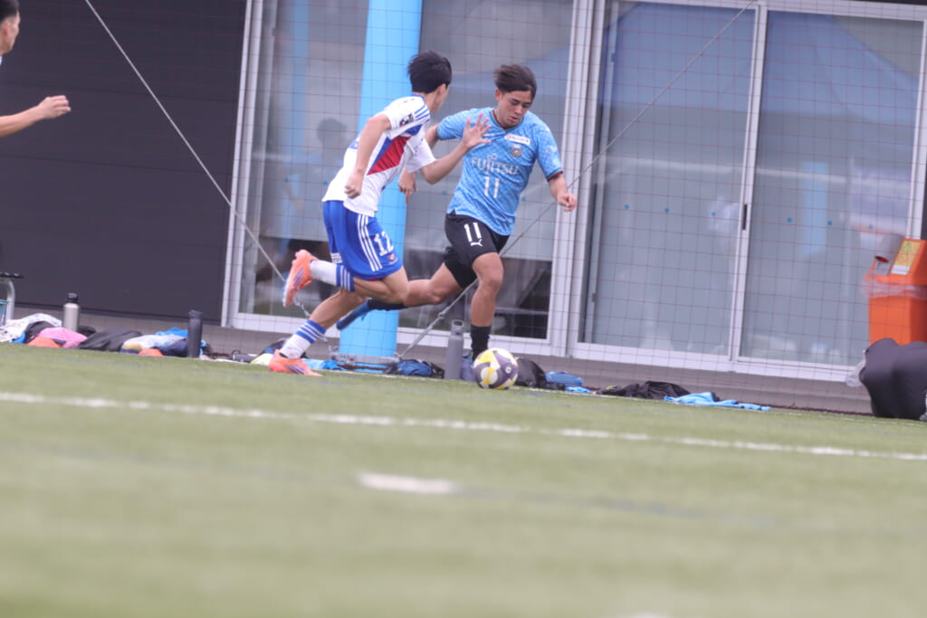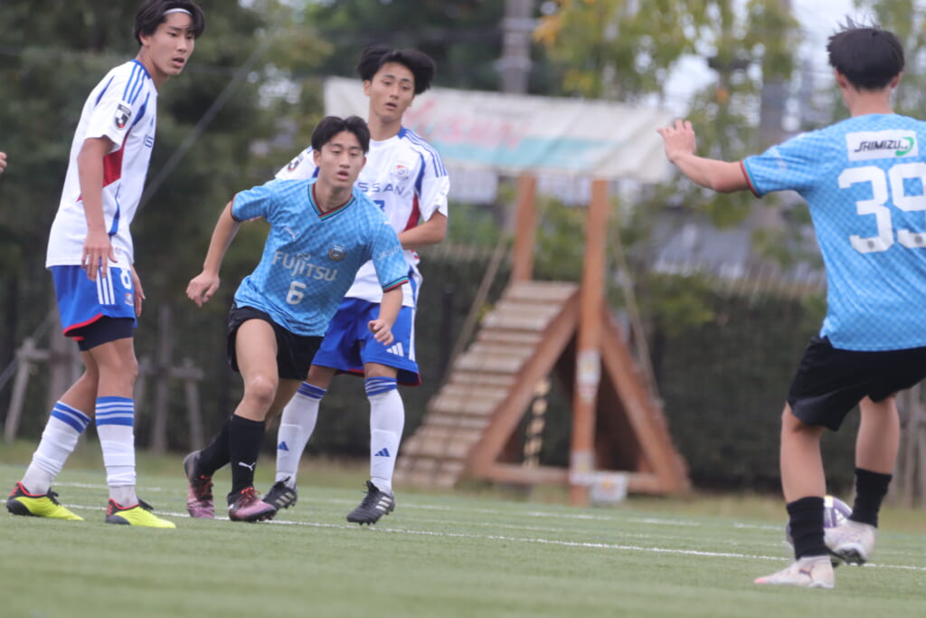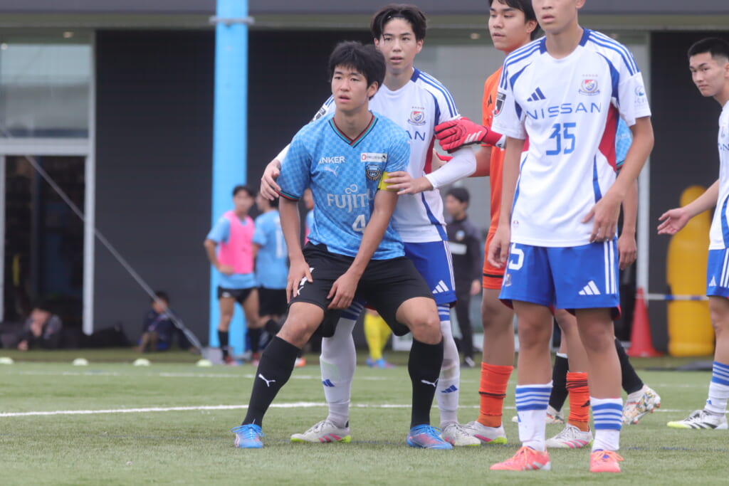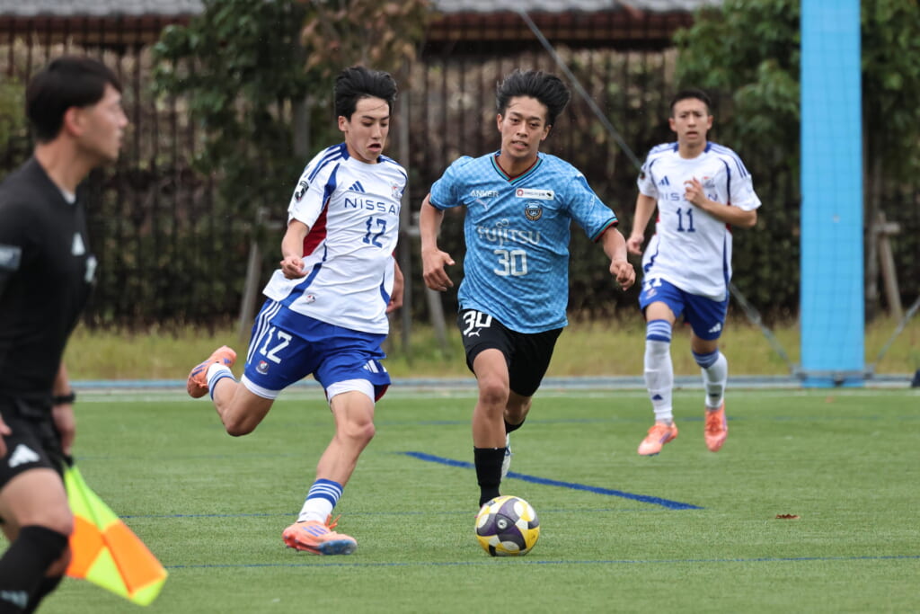 10分には、マリノス、齊藤芭流が左サイドから中央へ持ち込み、そのパスに抜け出した草野がエリア外左へ。草野は折り返しますが、川西がカバーしていきます。