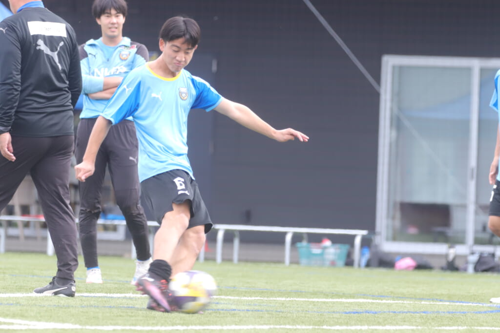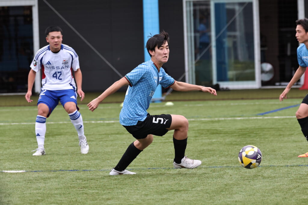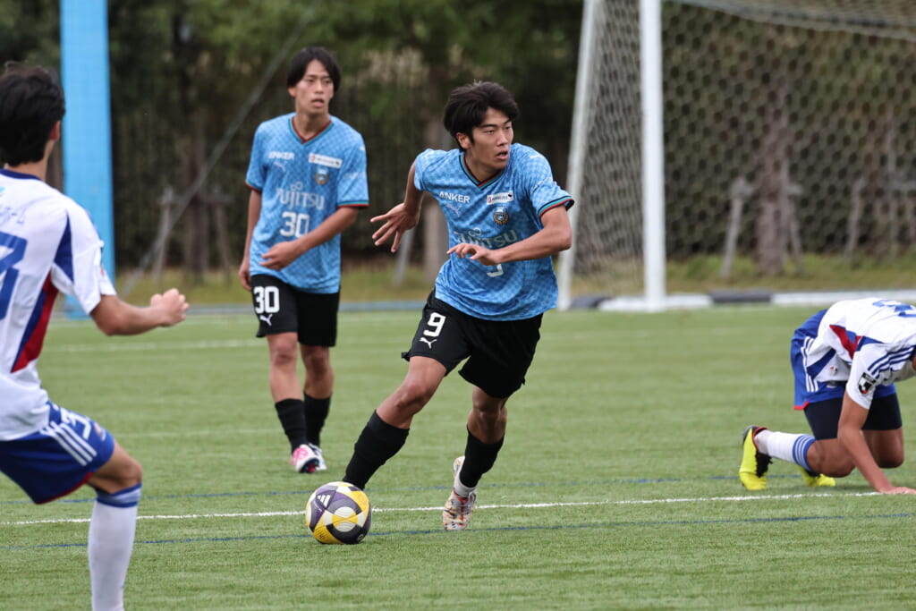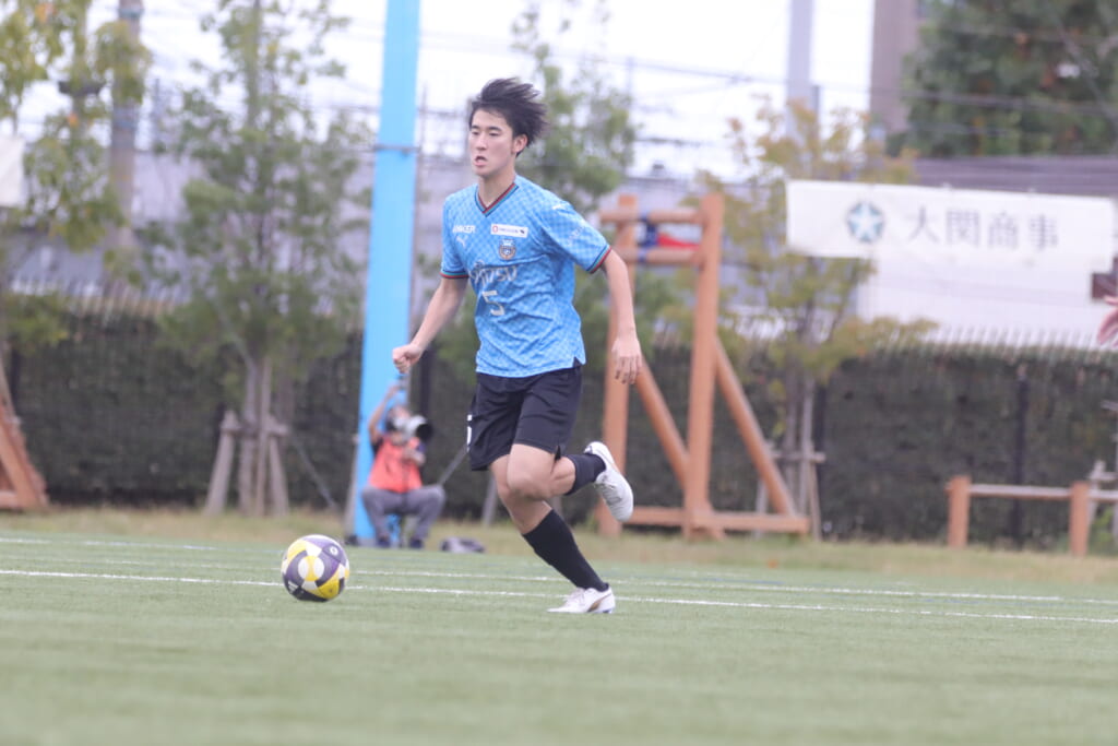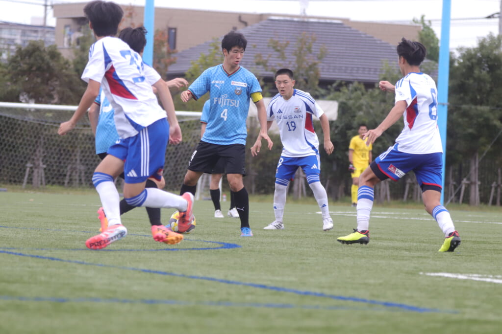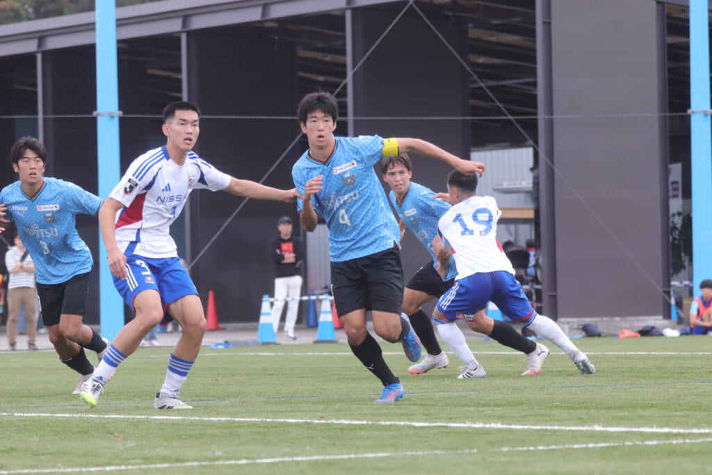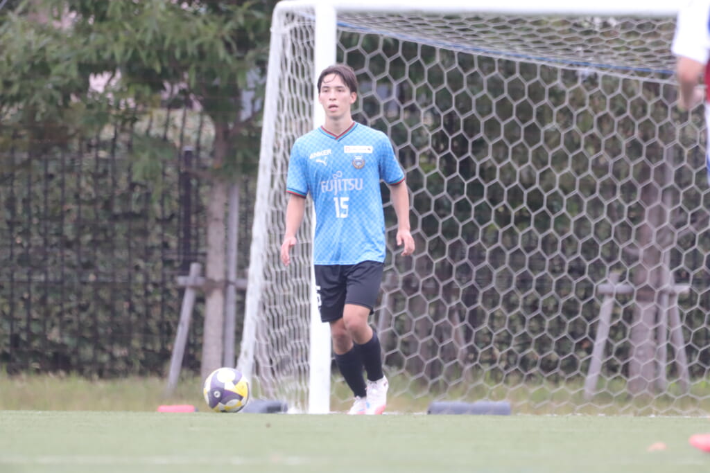10分には、マリノス、齊藤芭流が左サイドから中央へ持ち込み、そのパスに抜け出した草野がエリア外左へ。草野は折り返しますが、川西がカバーしていきます。