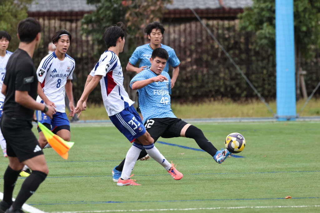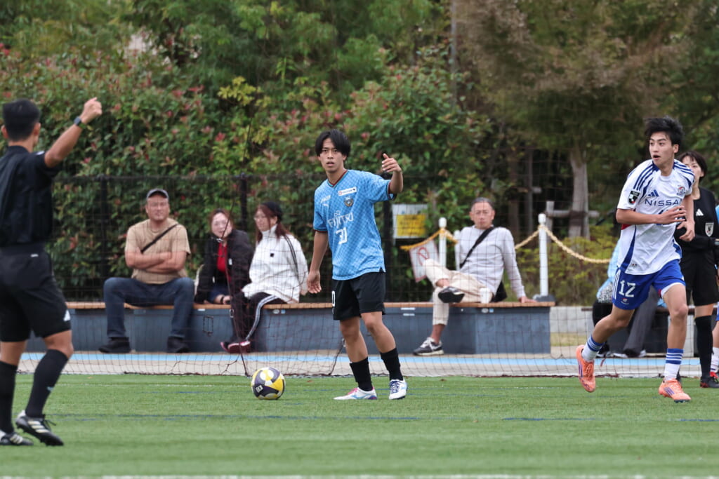 14分には、マリノス、草野から齊藤芭流と左サイドでつながり、中央で受けた相良は右サイドを突く浮き球のパス。平野がエリア右へ抜け出しますが、川西が対応。平野のファールに。