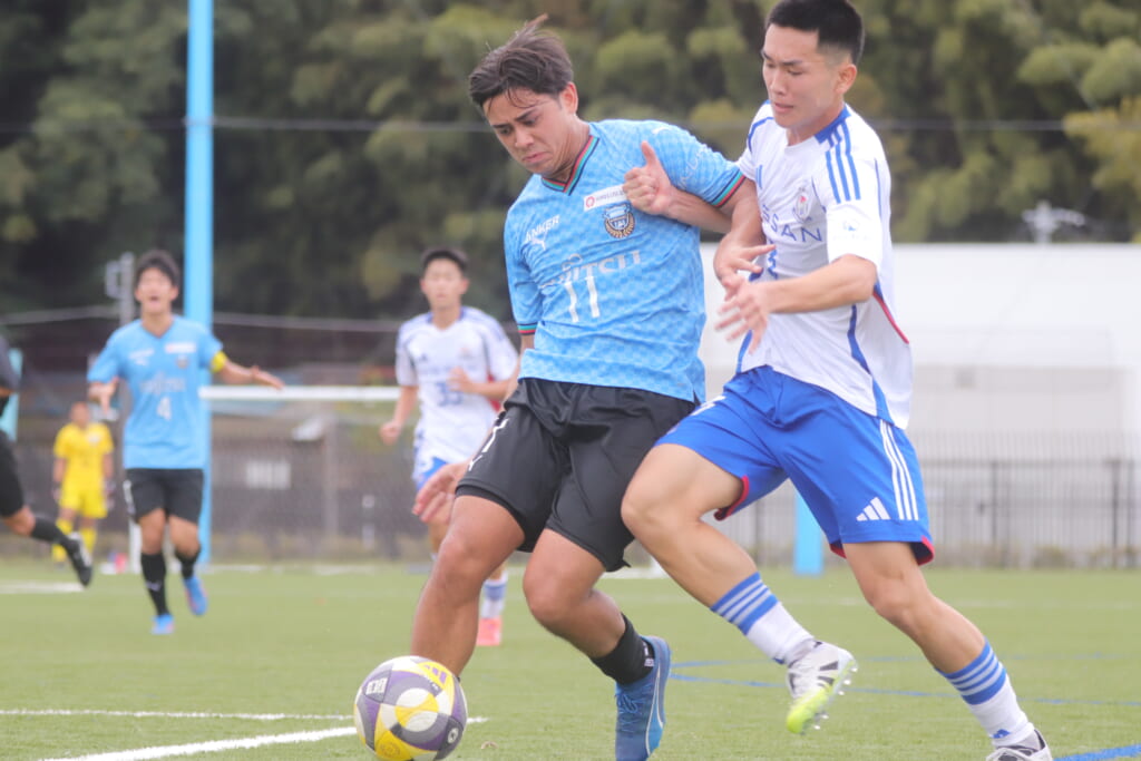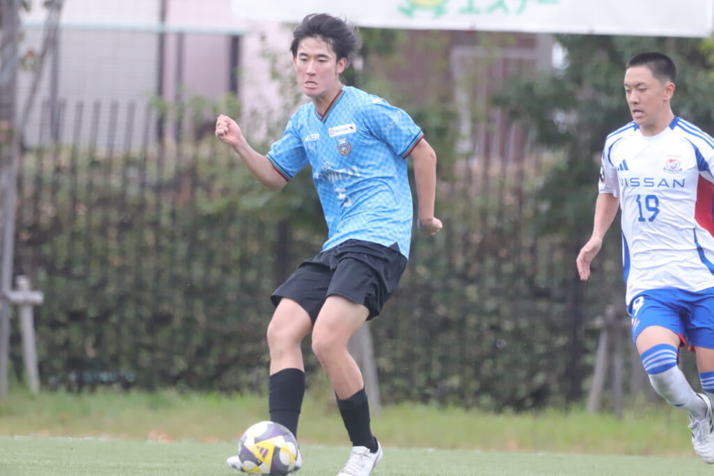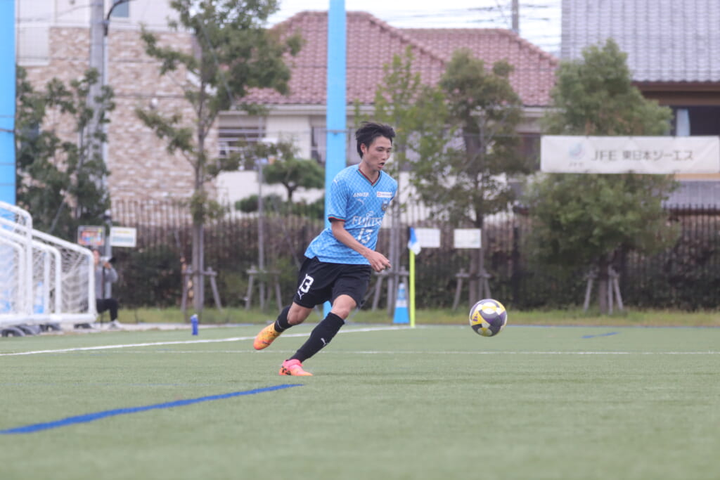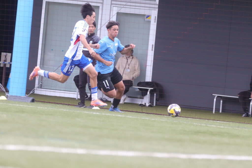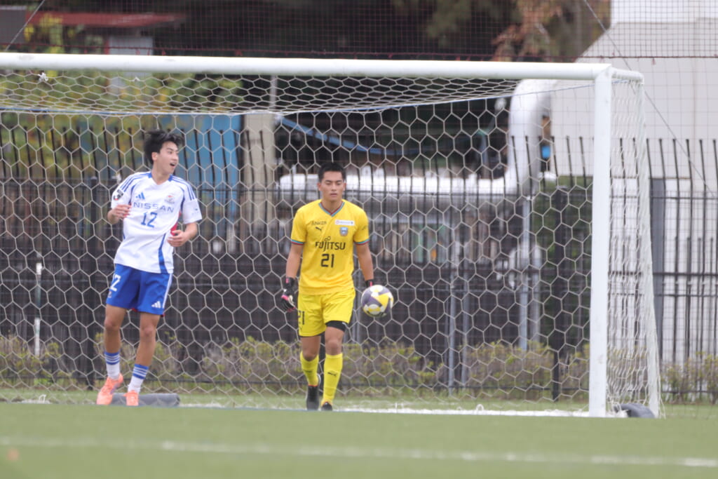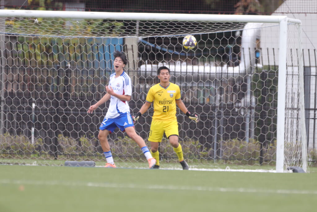 しかし、14分には、マリノス、フロンターレが中央へつなげたところ、厳しい寄せからカット。左サイドへ展開するとクロスは川西が対応するもこぼれ球を拾い、エリア右、抜け出した相良がシュート。これが決まり、1-1。マリノスが追いつきます。