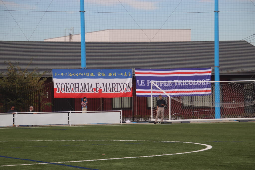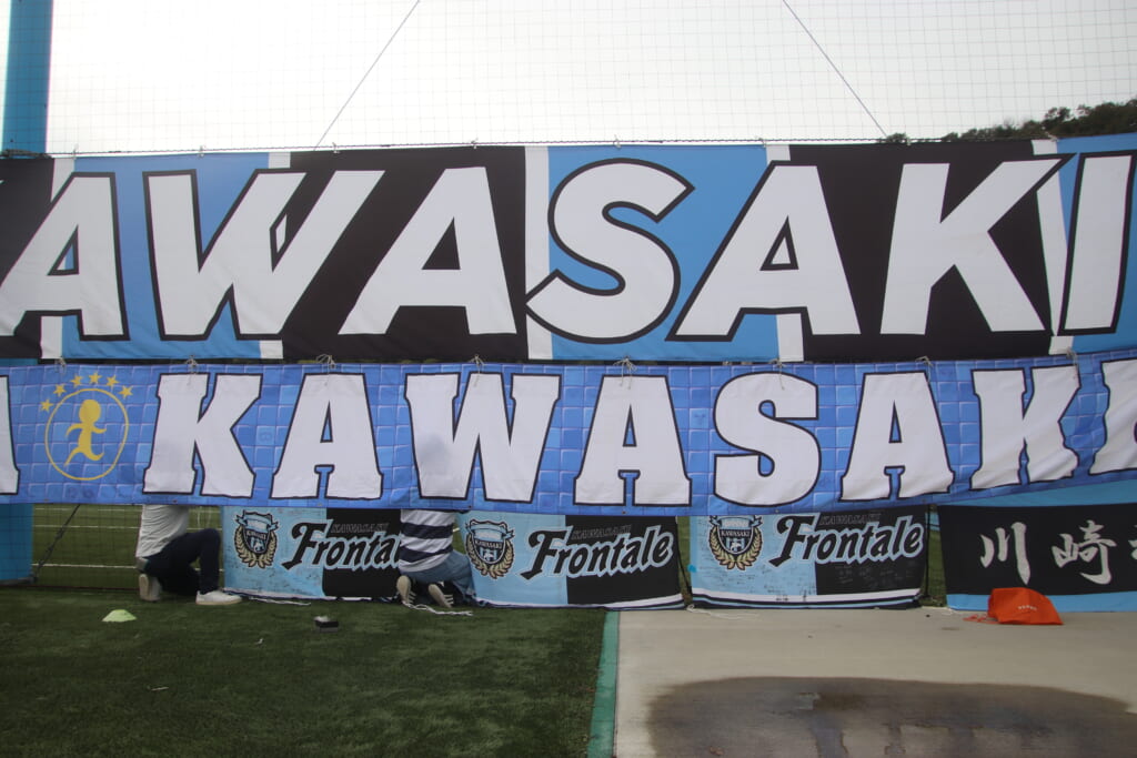 くもり空のAnker フロンタウン生田。両チームの選手の家族らに加え、フロンターレもマリノスもサポーターが集結。それぞれに幕を出し、見守る中キックオフの時を迎えました。