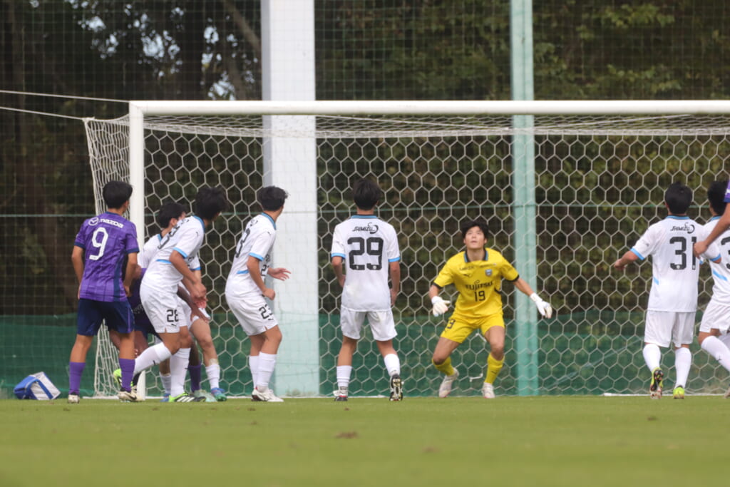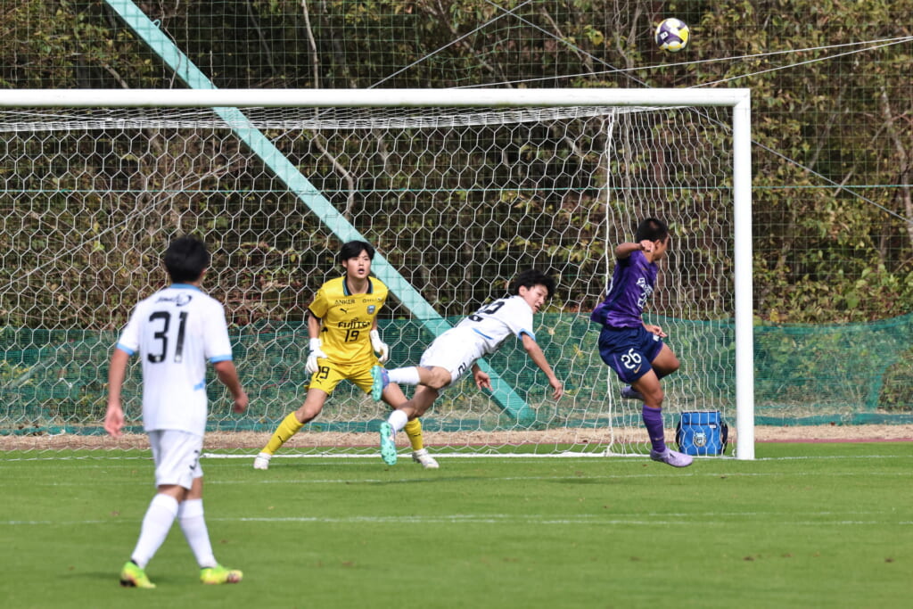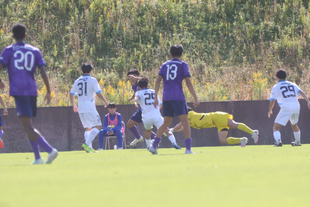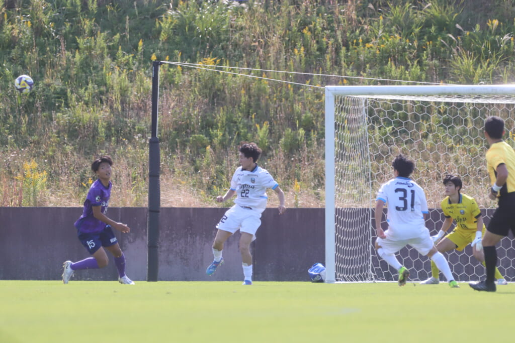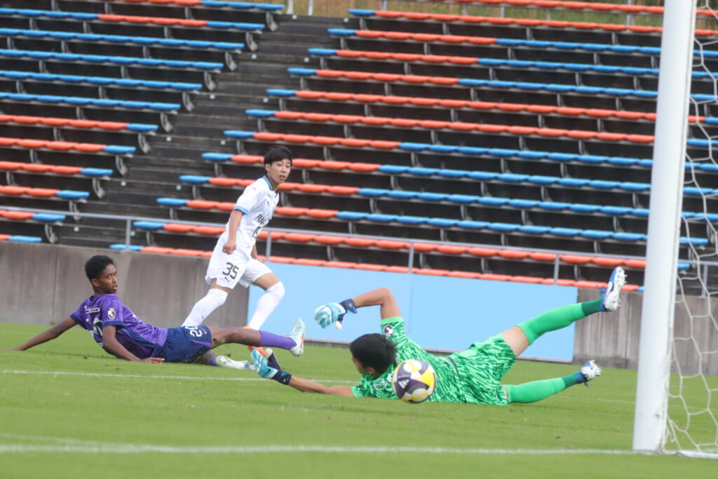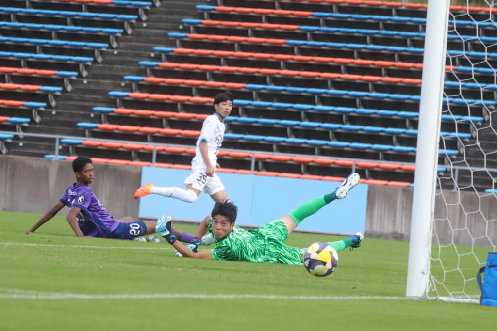 キッカーは長崎。直接左足で狙ったシュートは枠をとらえますが、GK小川煌がはじき出し、惜しくもゴールとはならず。
