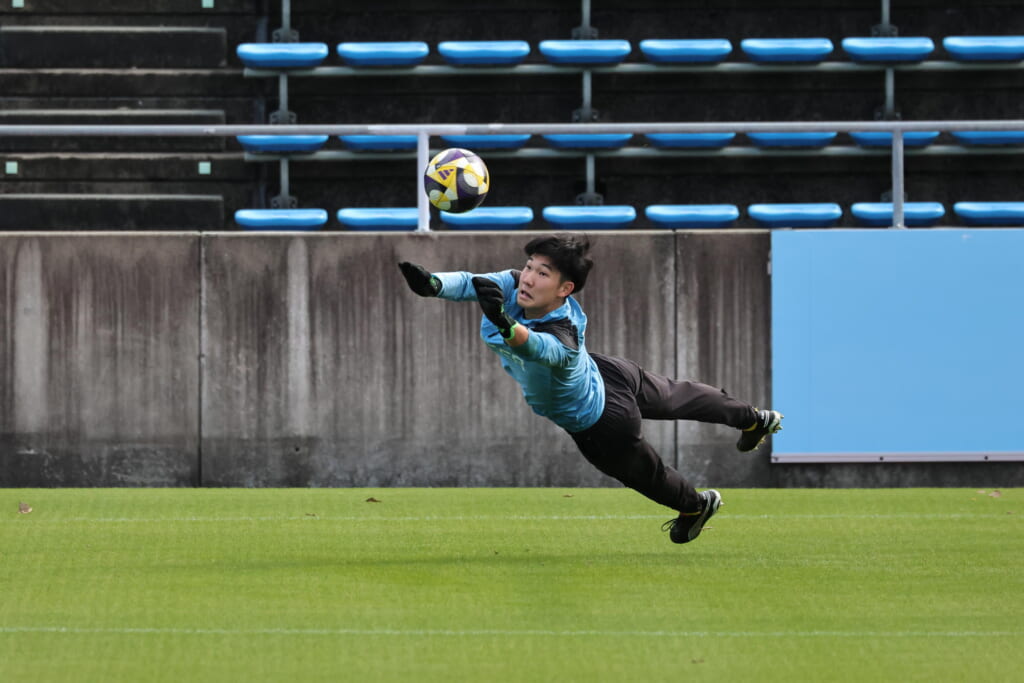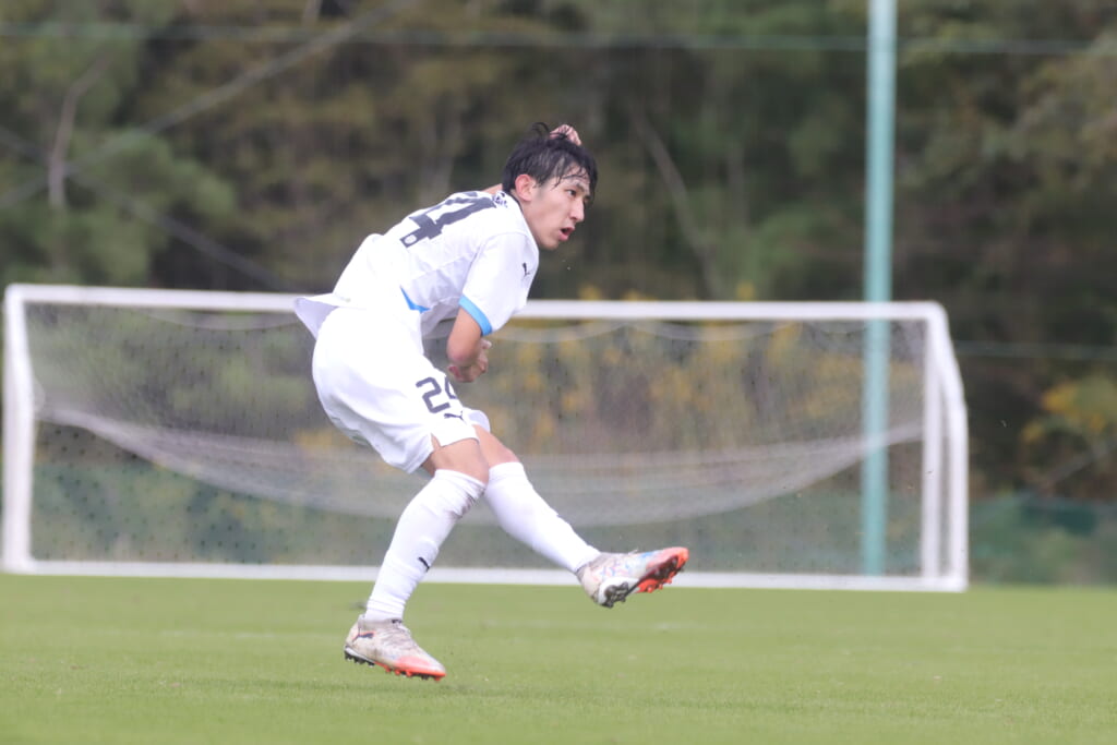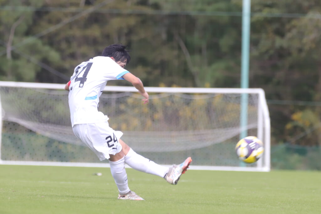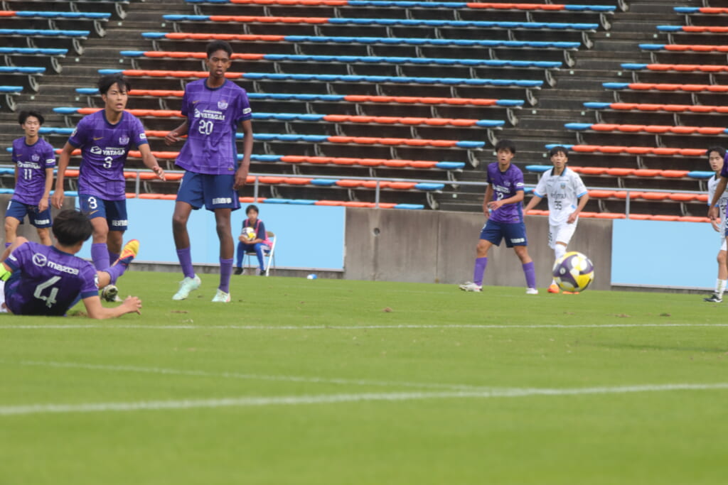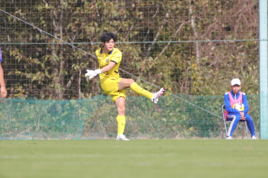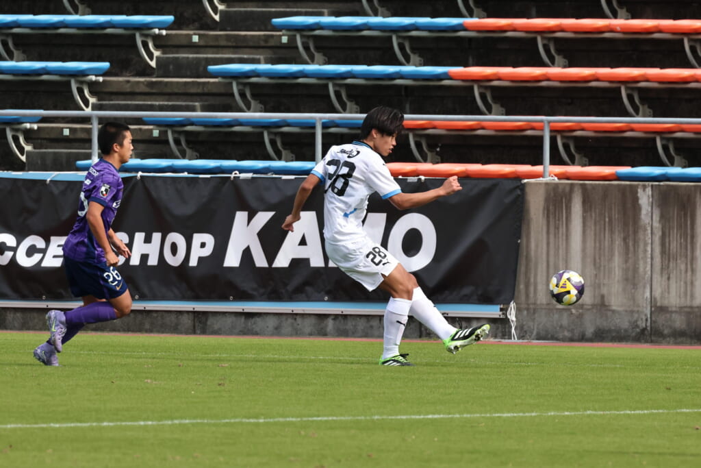 キッカーは長崎。直接左足で狙ったシュートは枠をとらえますが、GK小川煌がはじき出し、惜しくもゴールとはならず。
