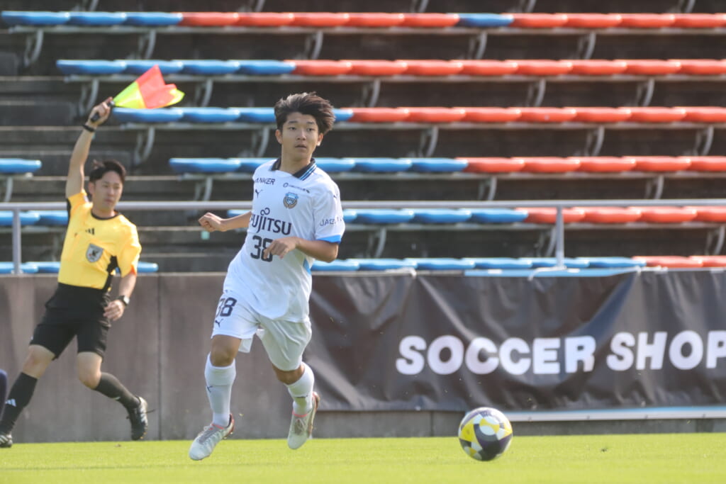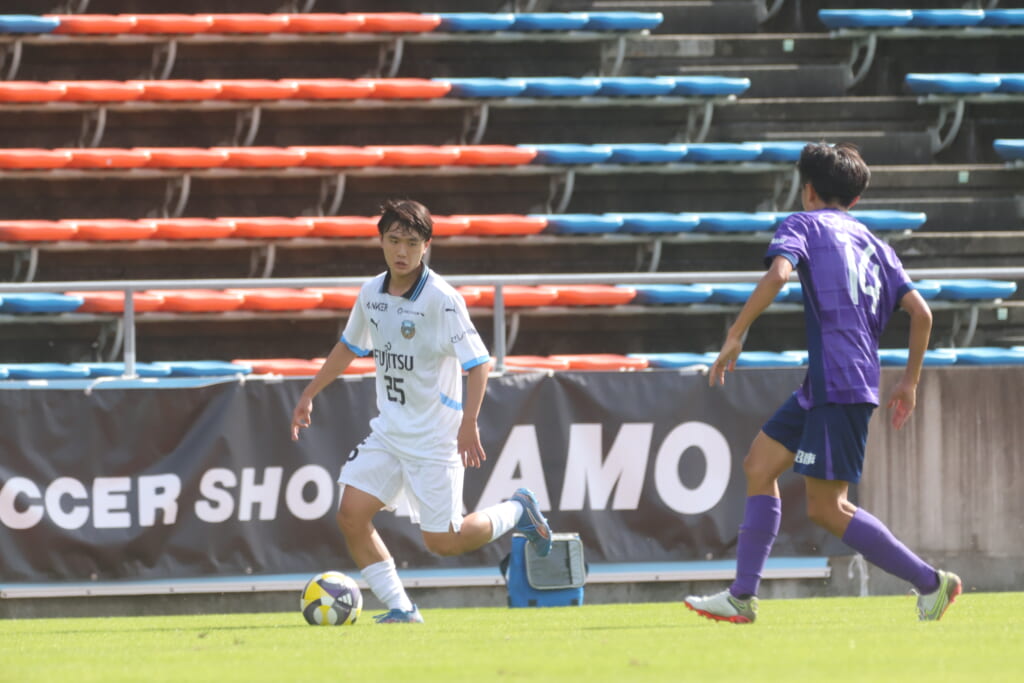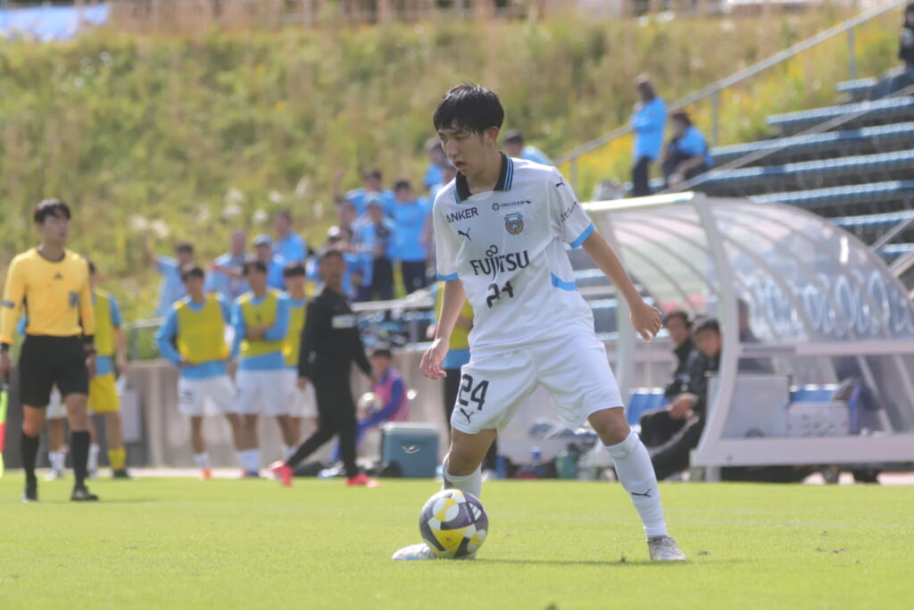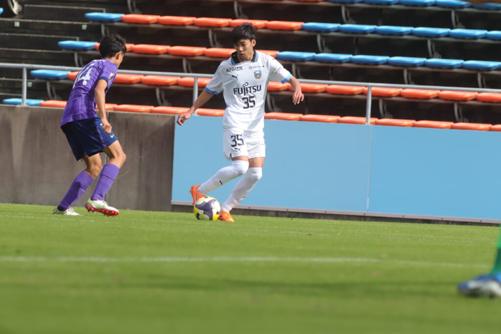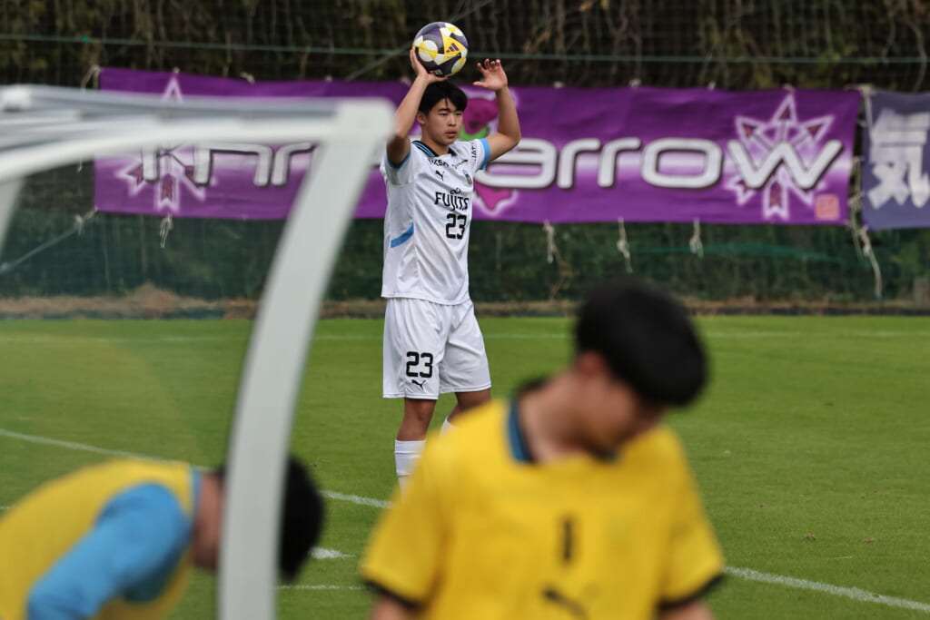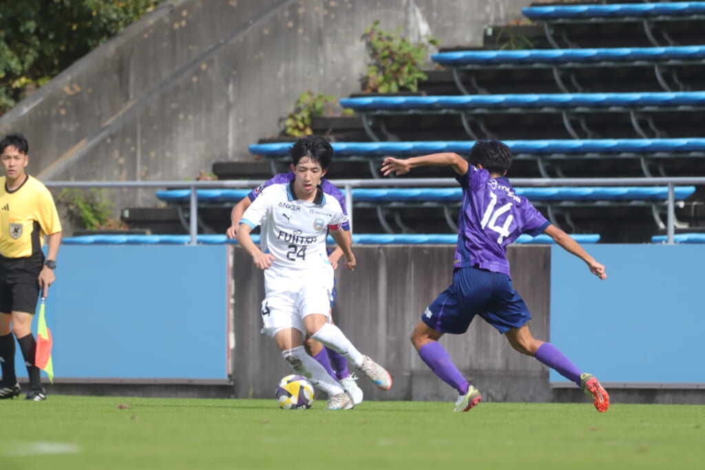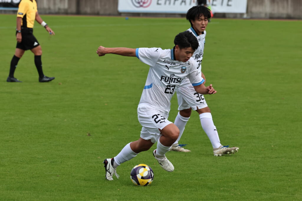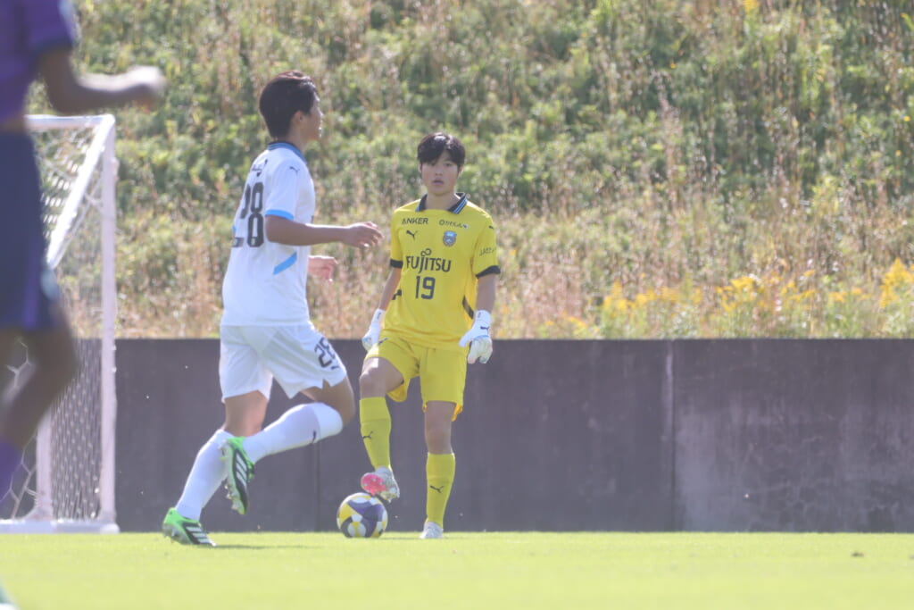 スローインを得たフロンターレ、自陣に戻し後ろからつないでいくと、山川のフィードに、廣瀬がエリア前に。ここはGK小川煌が対応。