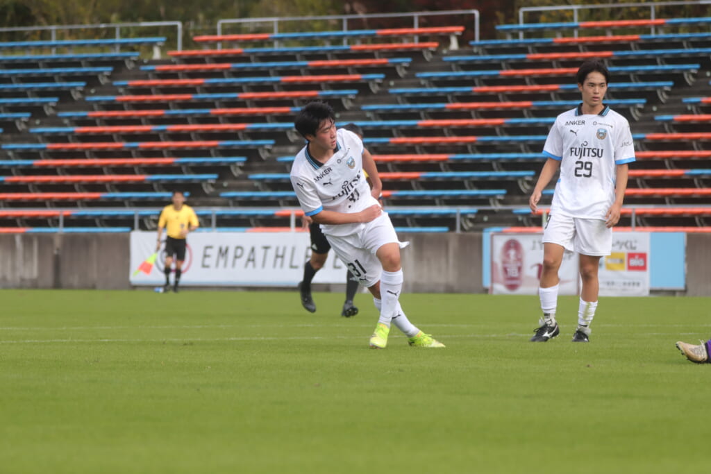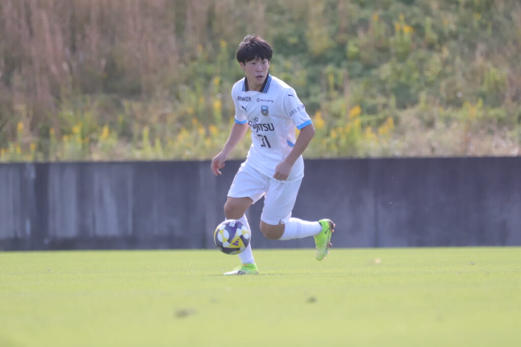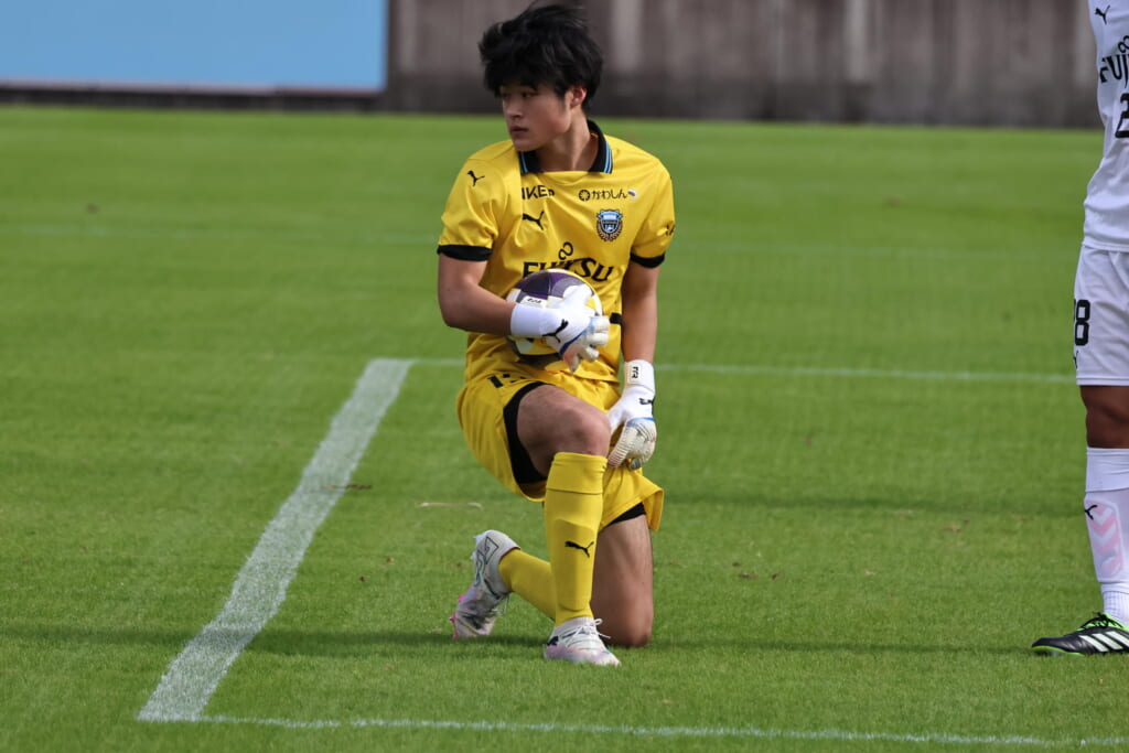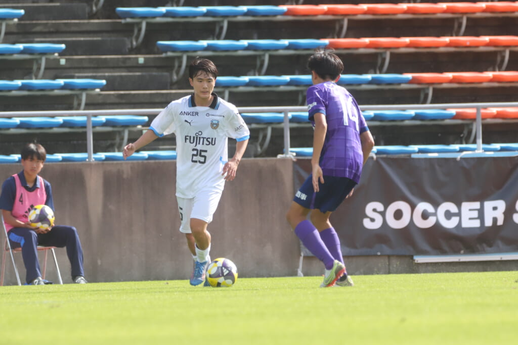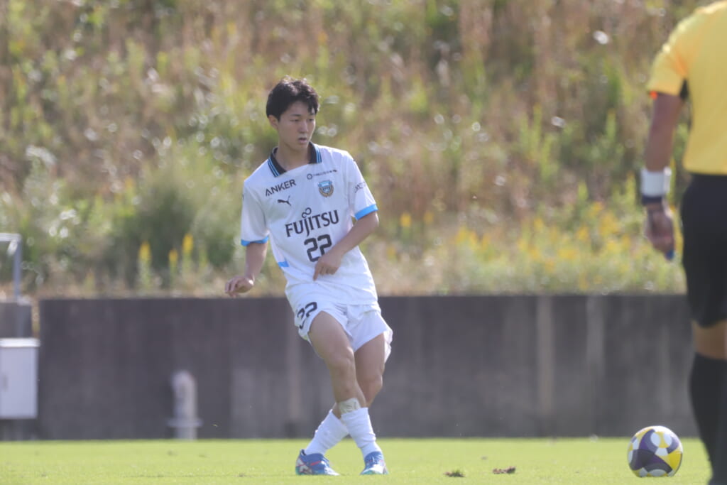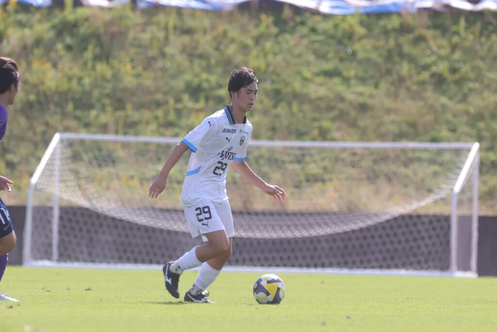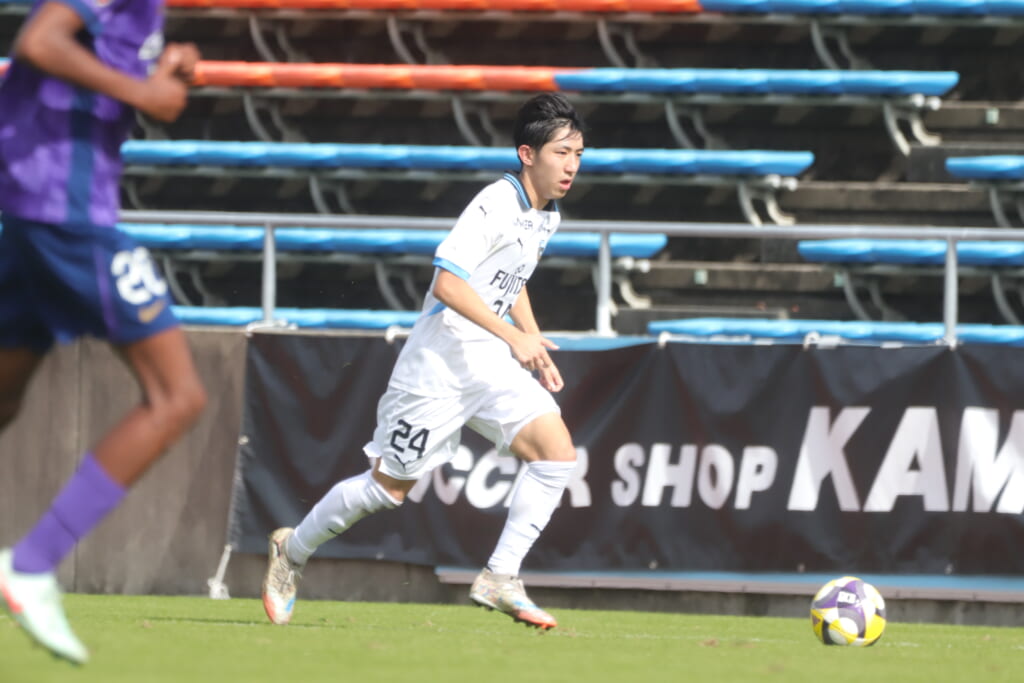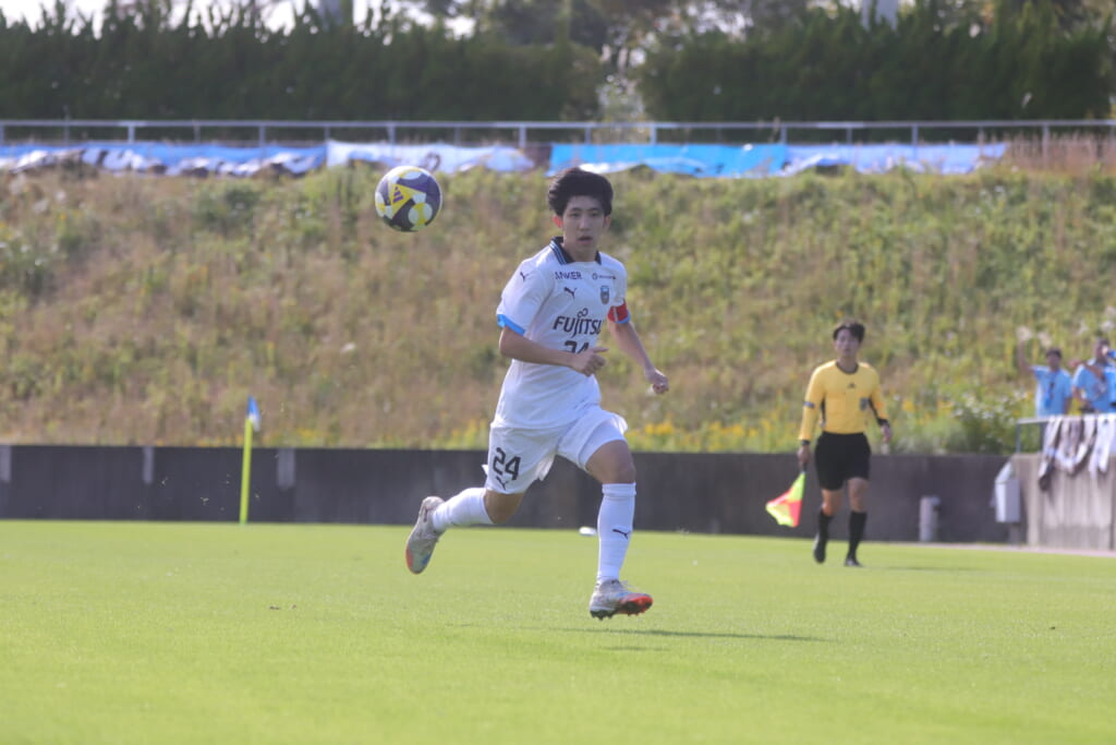 スローインを得たフロンターレ、自陣に戻し後ろからつないでいくと、山川のフィードに、廣瀬がエリア前に。ここはGK小川煌が対応。