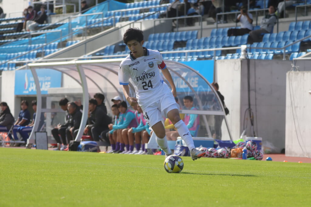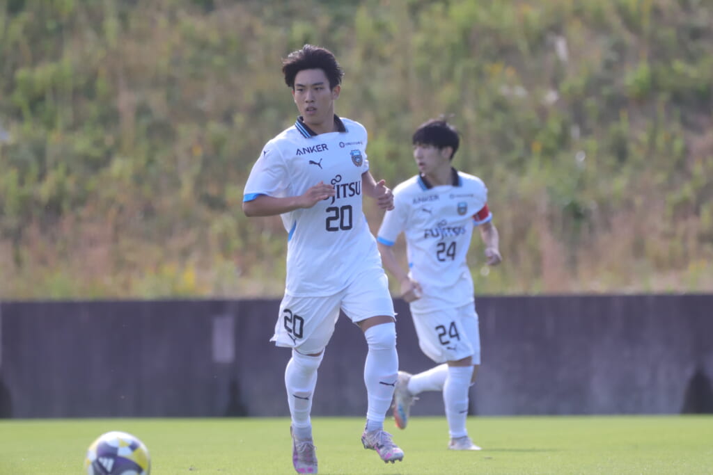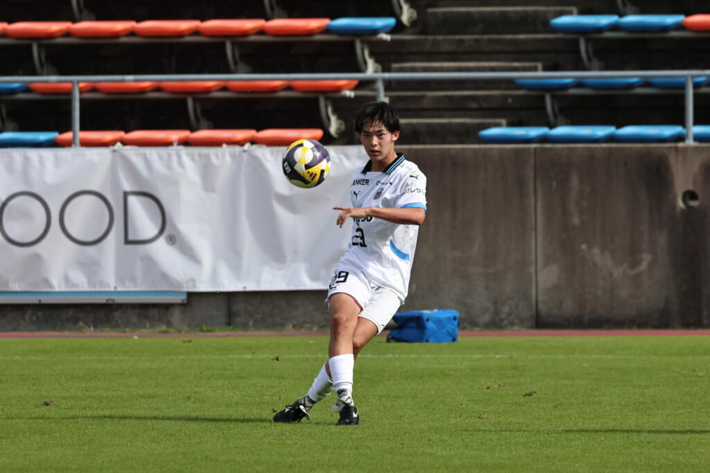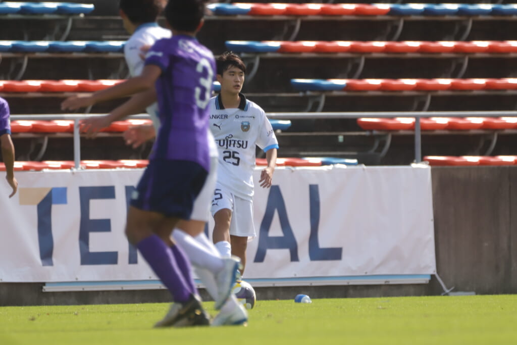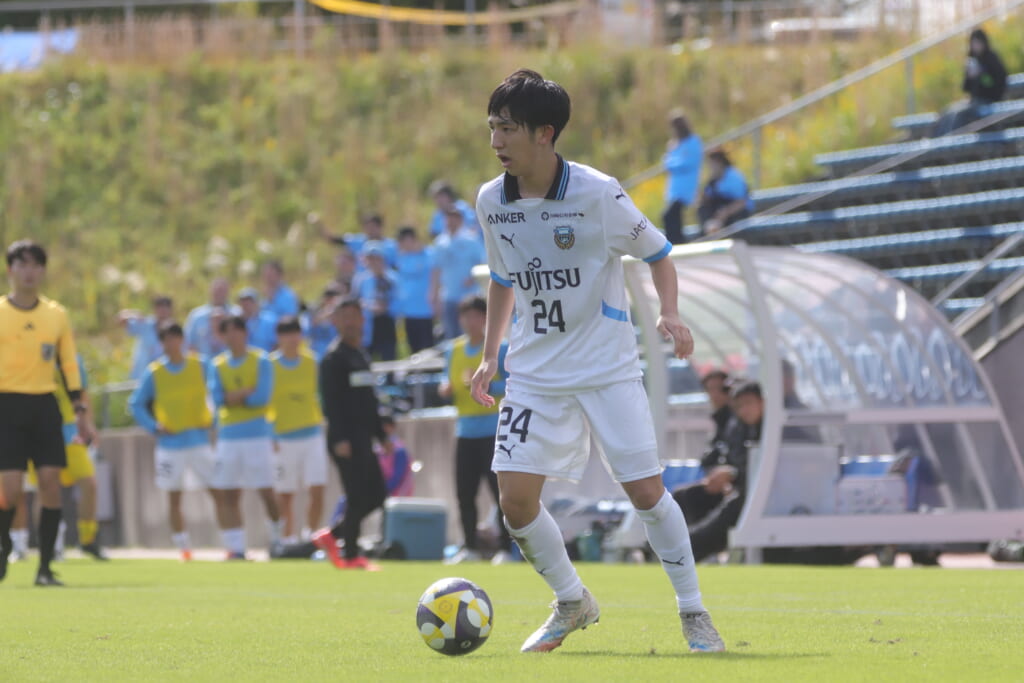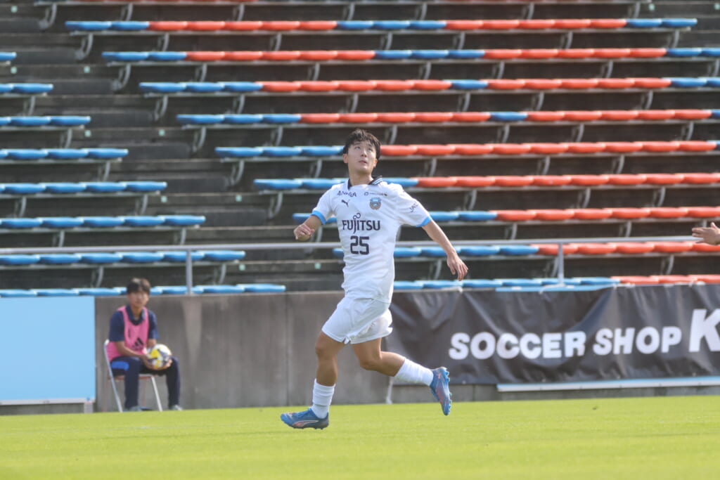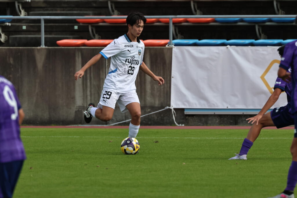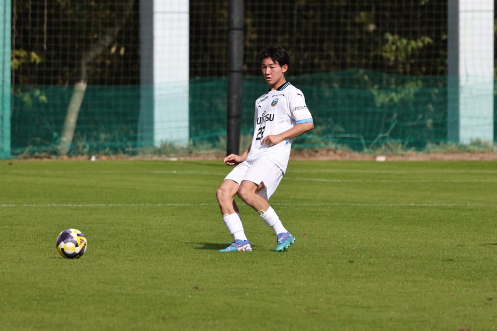 スローインを得たフロンターレ、自陣に戻し後ろからつないでいくと、山川のフィードに、廣瀬がエリア前に。ここはGK小川煌が対応。