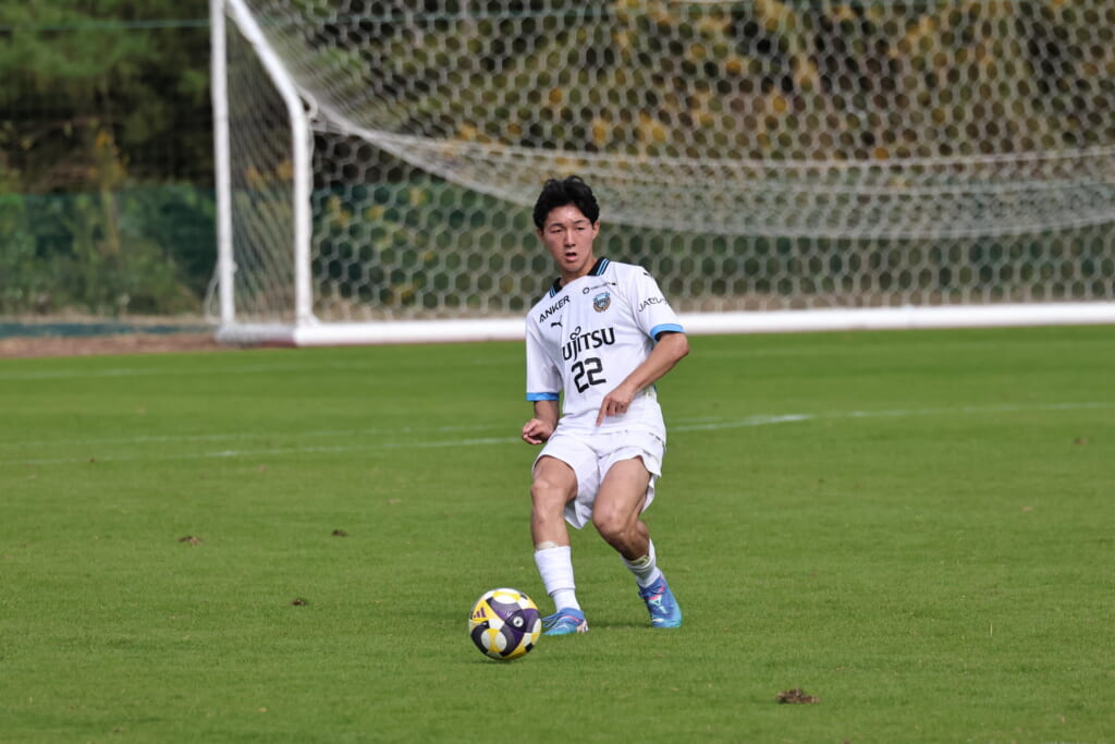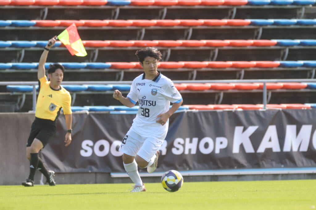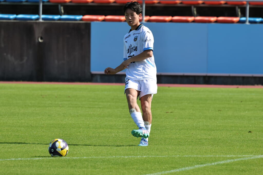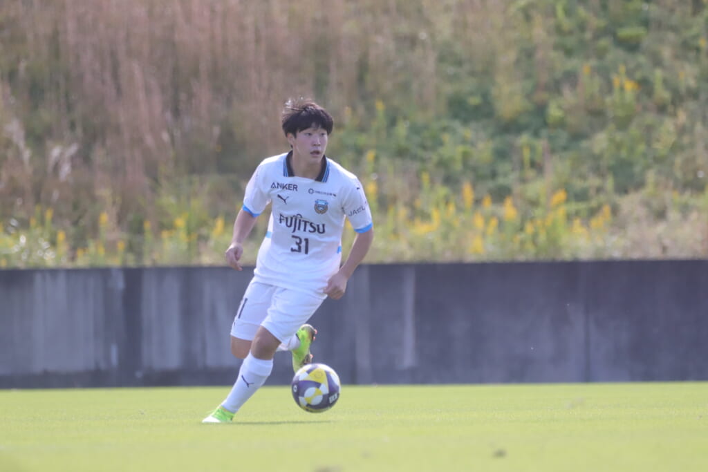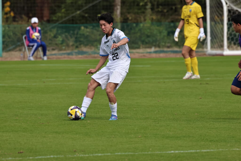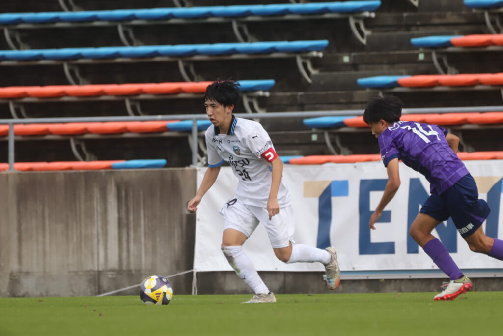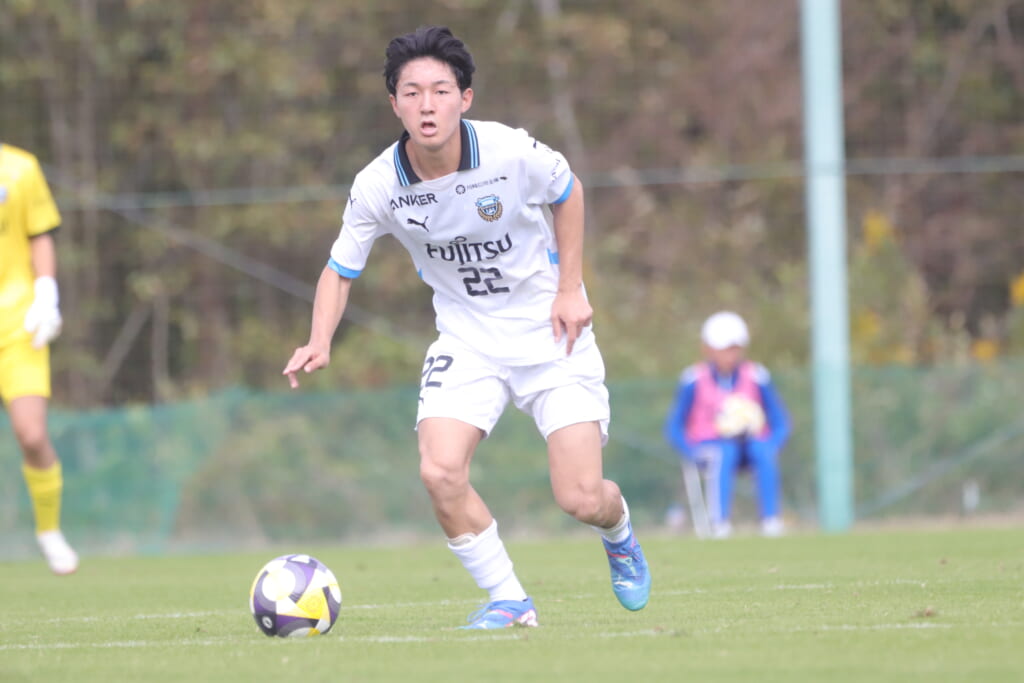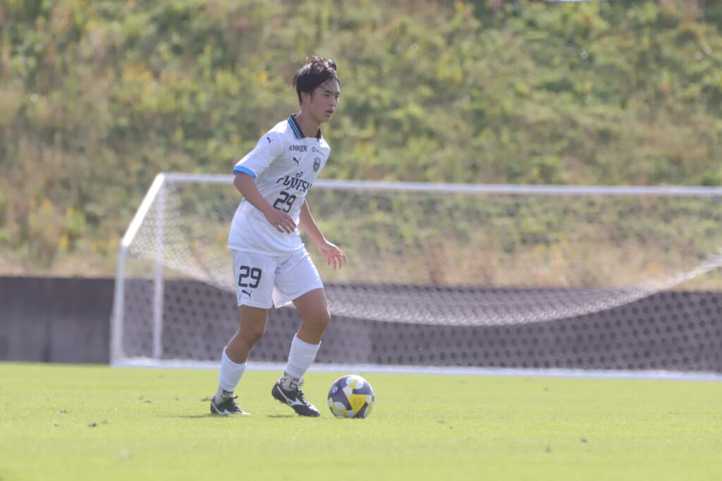 スローインを得たフロンターレ、自陣に戻し後ろからつないでいくと、山川のフィードに、廣瀬がエリア前に。ここはGK小川煌が対応。