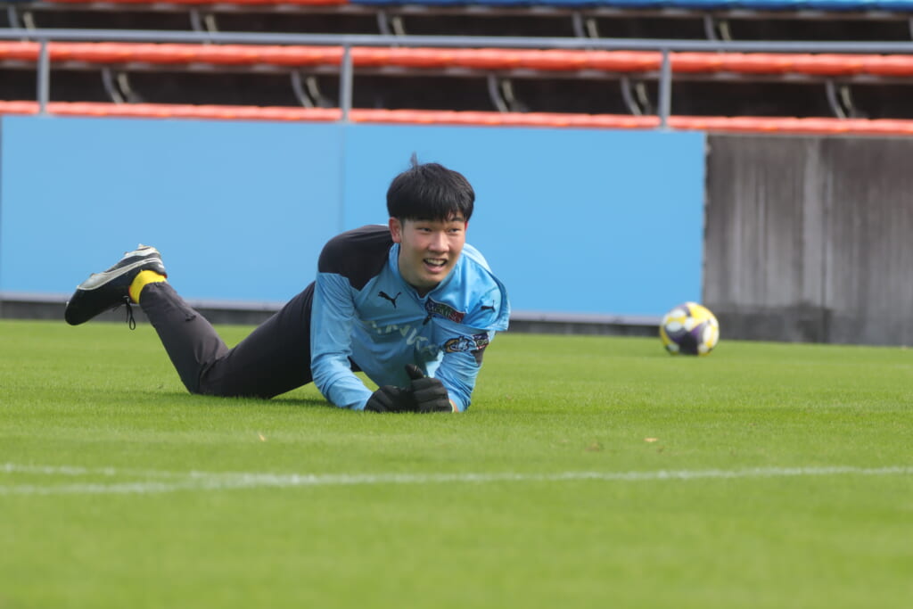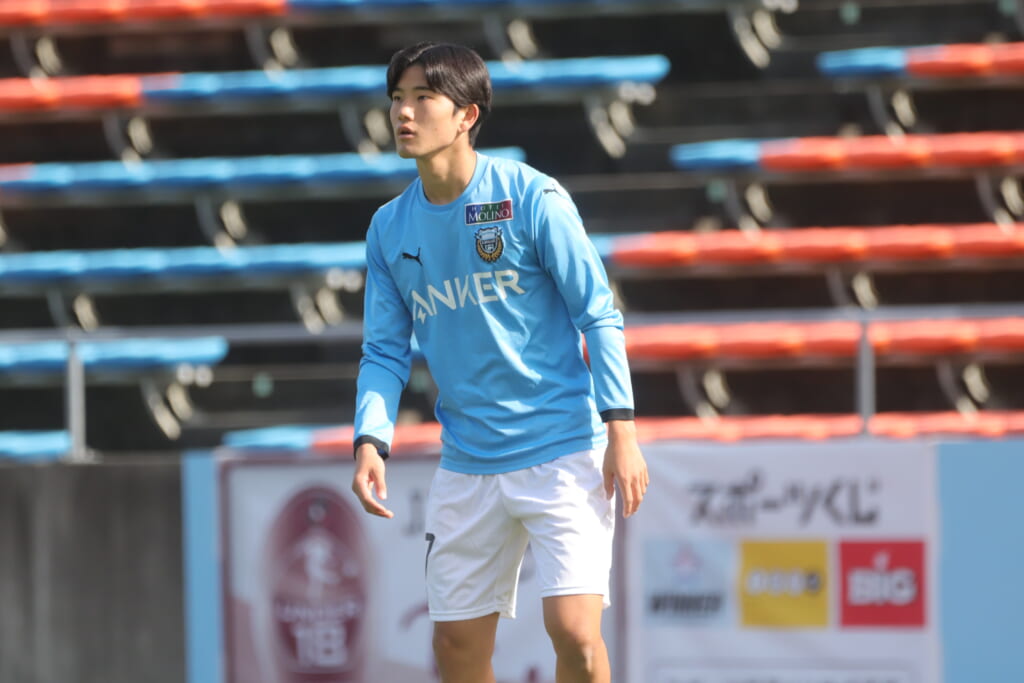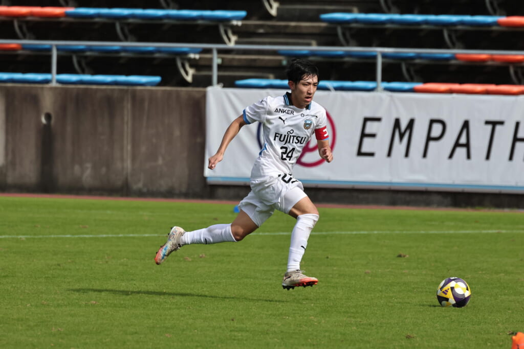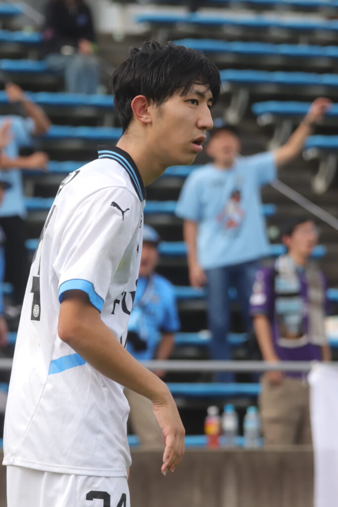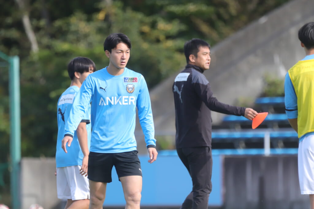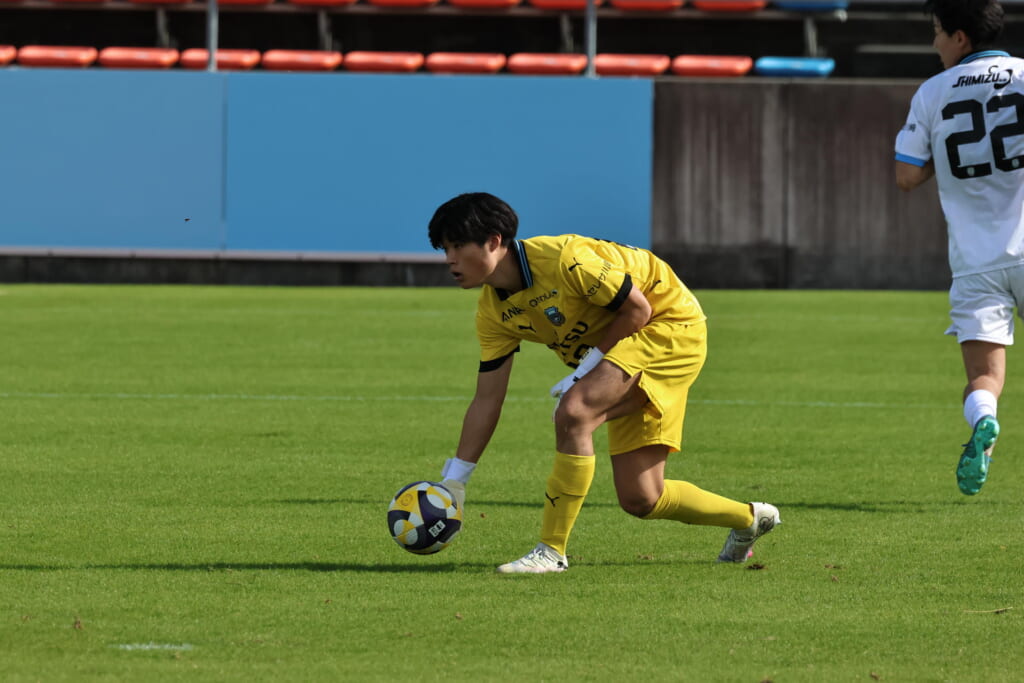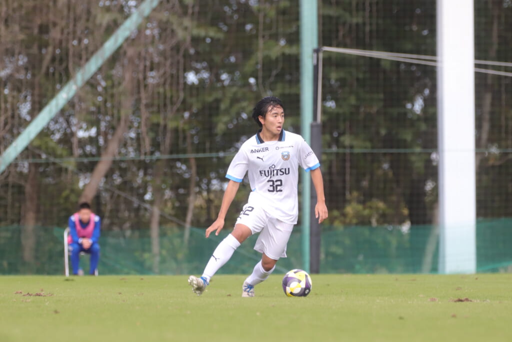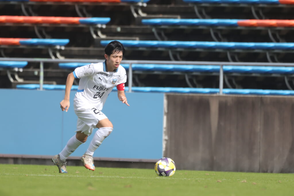 スローインを得たフロンターレ、自陣に戻し後ろからつないでいくと、山川のフィードに、廣瀬がエリア前に。ここはGK小川煌が対応。