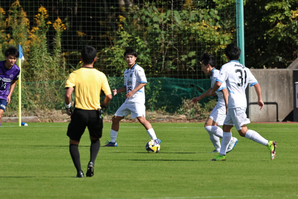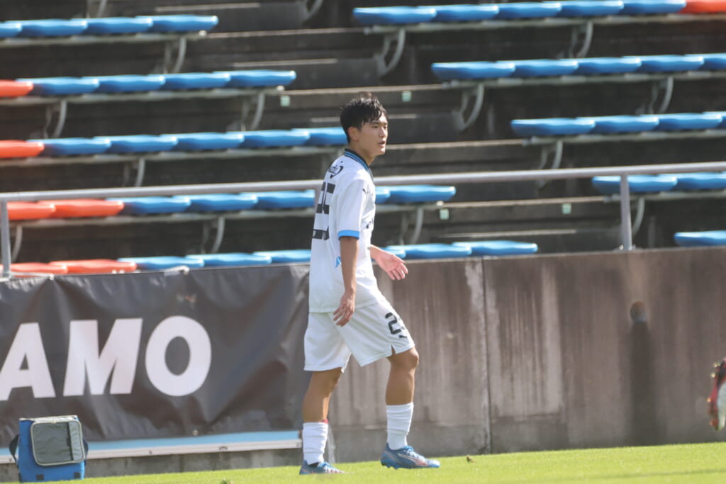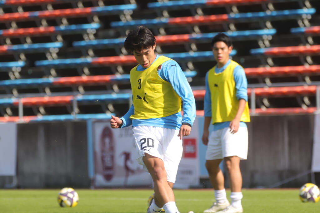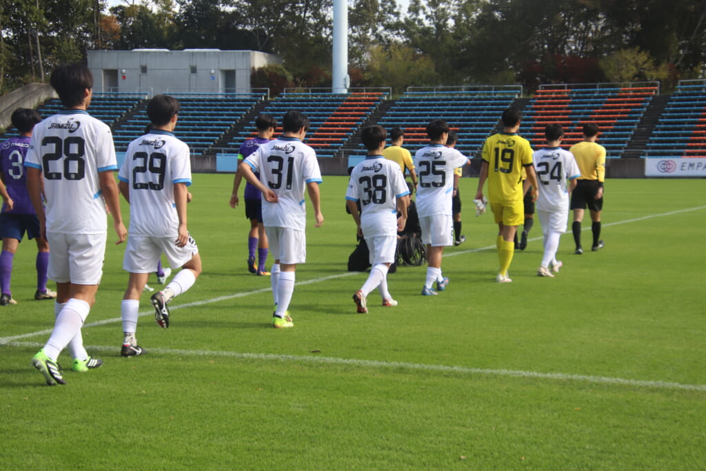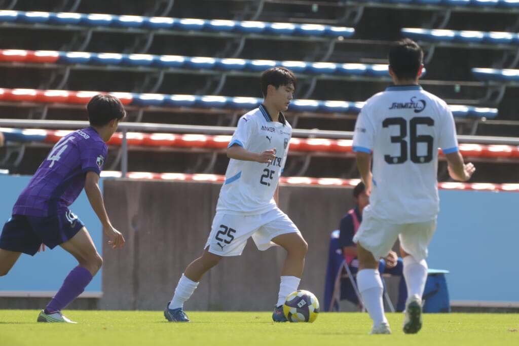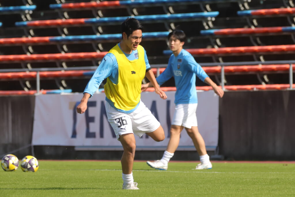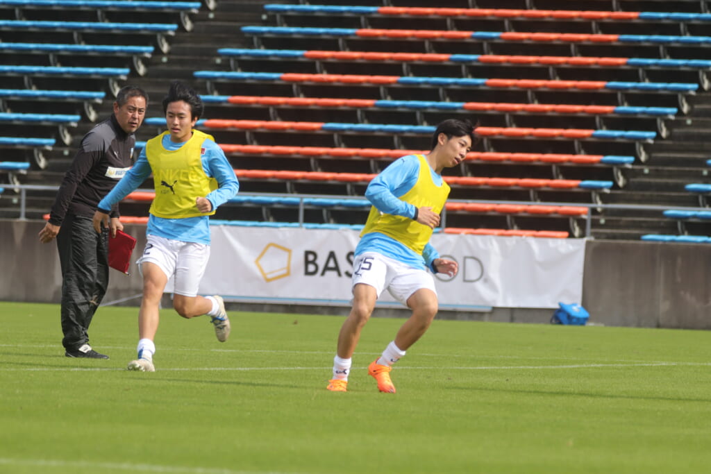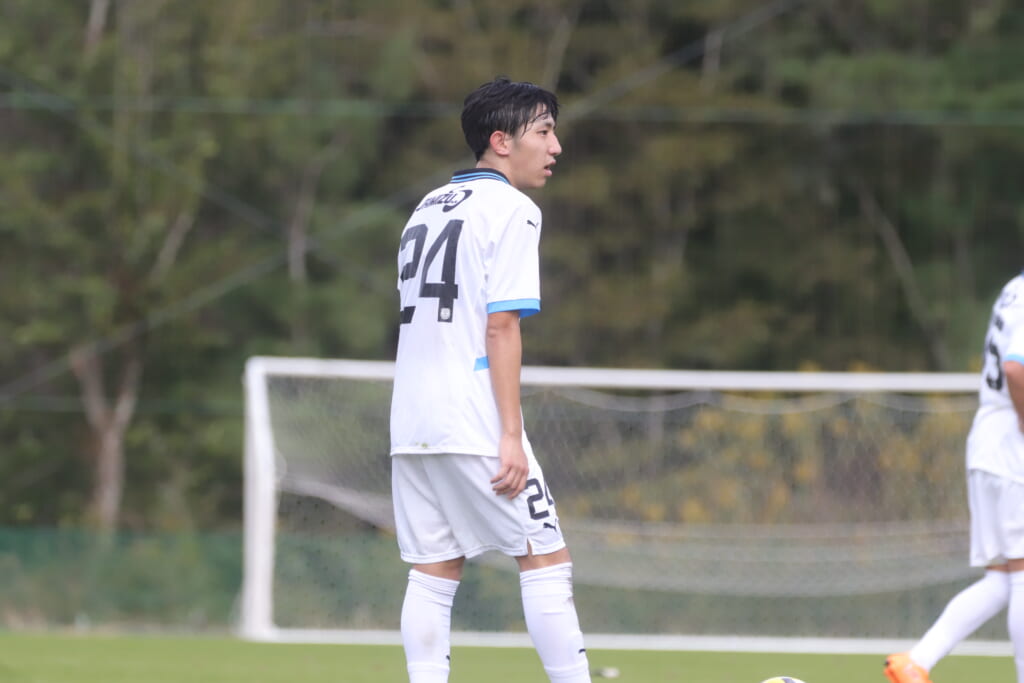 先発は、GK19岩田幹太郎、最終ラインは右から25小川翔太、22山川陽平、28笹倉拓真、キャプテンの24長崎亘佑、ボランチは31小田脩人、29今廣遥碧、右MF17廣瀬寧生、左MF20三上瑛大、前線には38全天海、36川村求。
