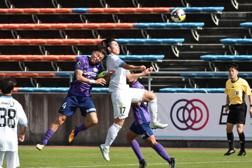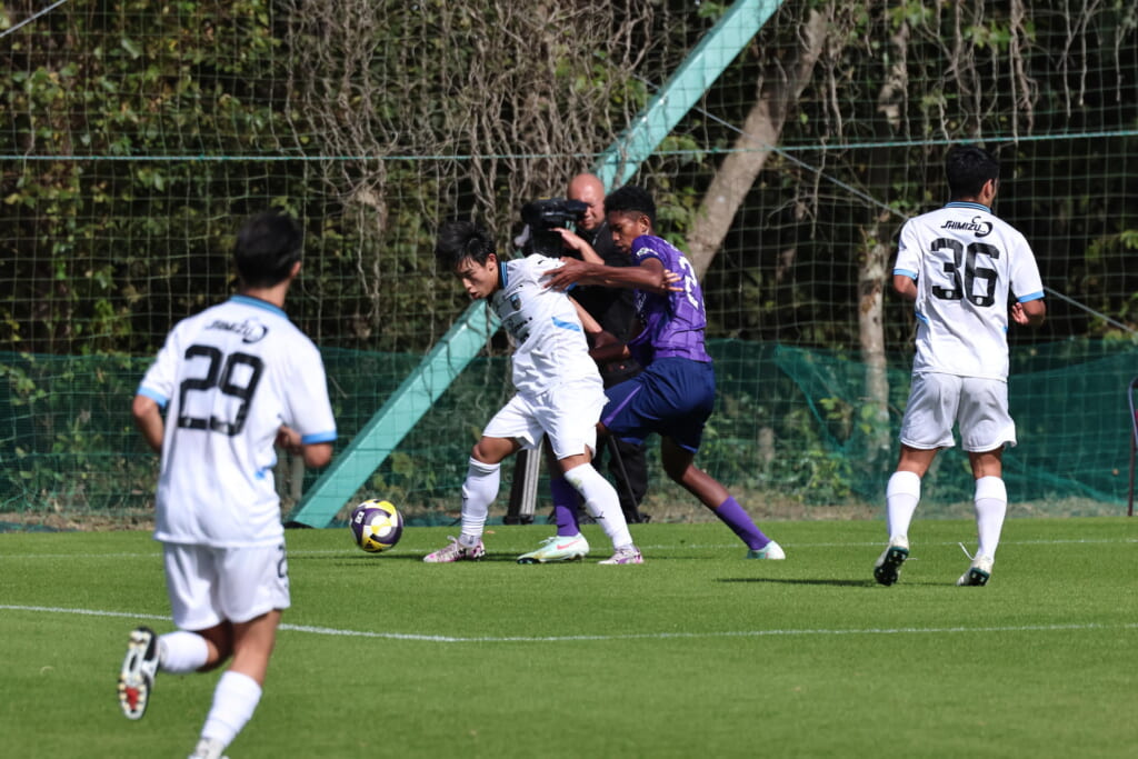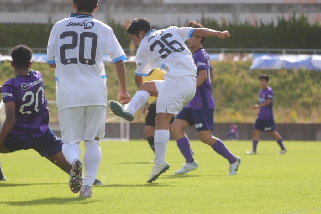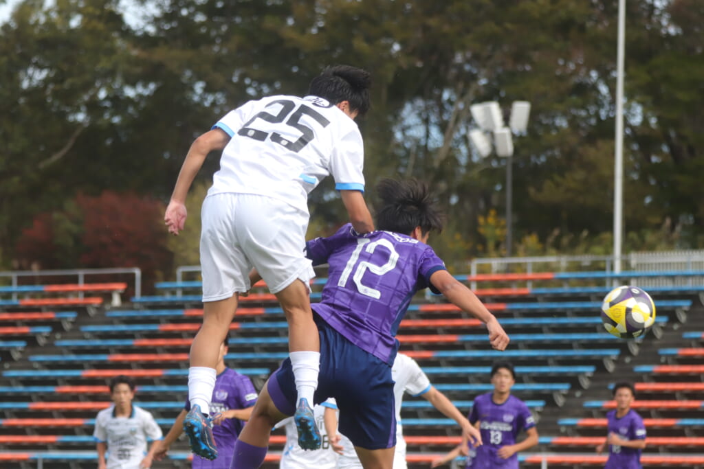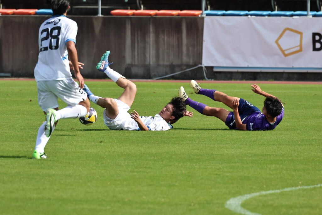 小川煌が前に送ったボールを、信重がおさめ、左サイドへ展開。原がクロスを入れていきますが、山川がクリアしていきます。