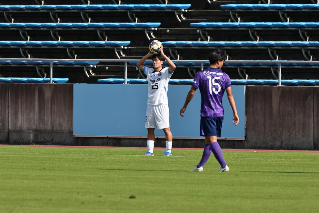 さらに浮き球を宗田が競り、おさめた信重のパスに、梅田が右サイド、高い位置へ。しかし、長崎が寄せて、相手に当て自分たちのスローインにしていきます。