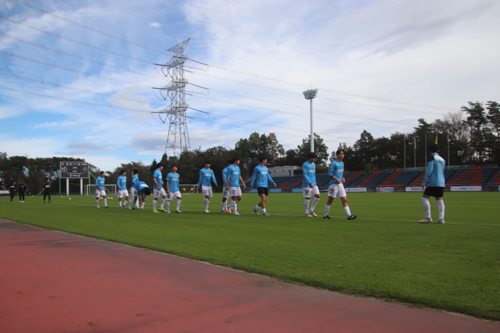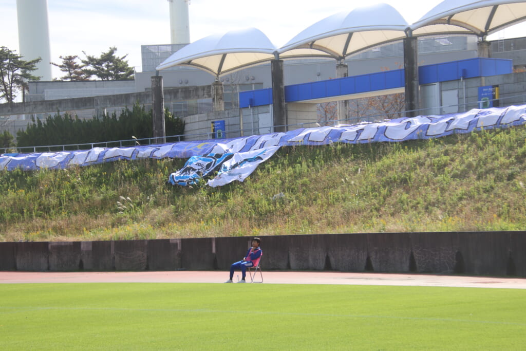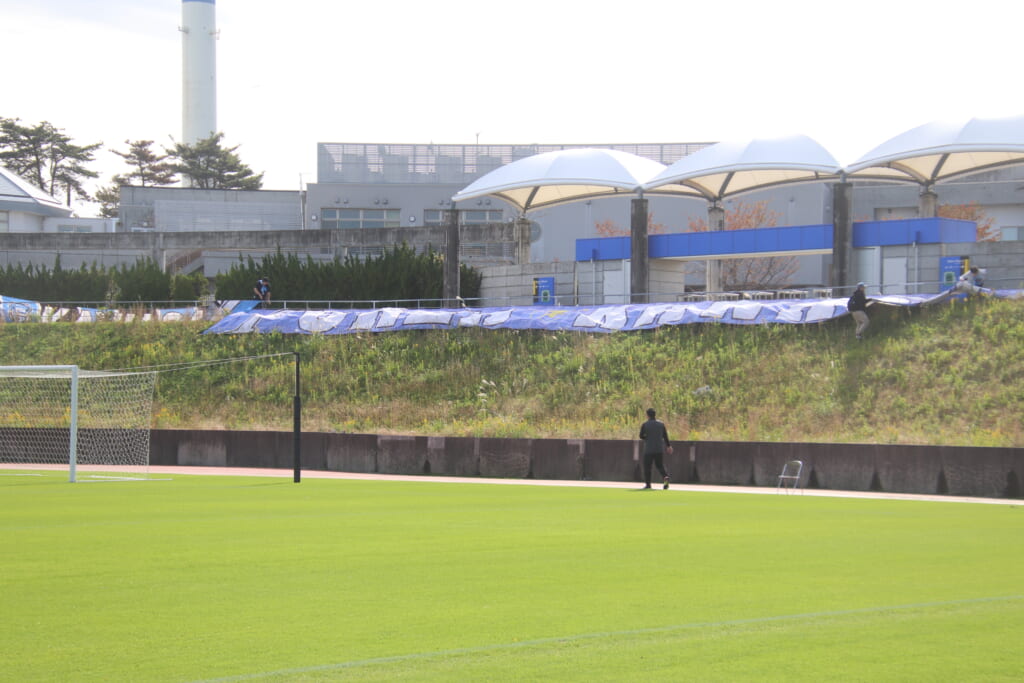 青空のJヴィレッジスタジアム。メインスタンドには、両チームの選手の家族らに加え、それぞれのサポータが集結。それぞれのチームカラー、青と紫の幕が掲出され、サポーターたちが声援やコールで選手たちの背中を押す、素晴らしい雰囲気の中、キックオフの時を迎えました。