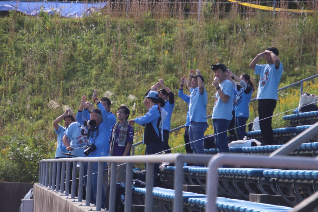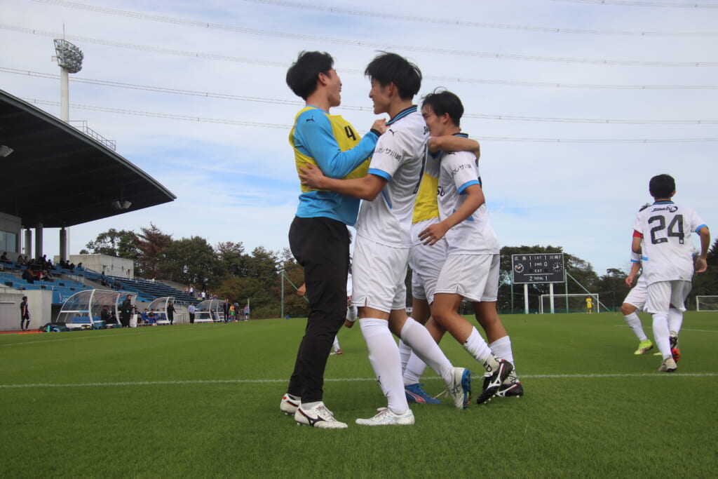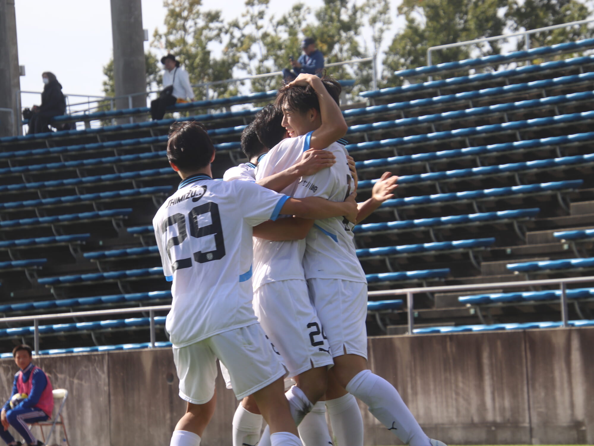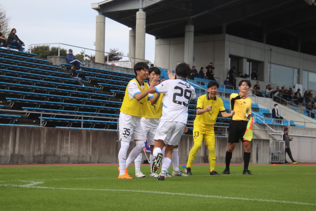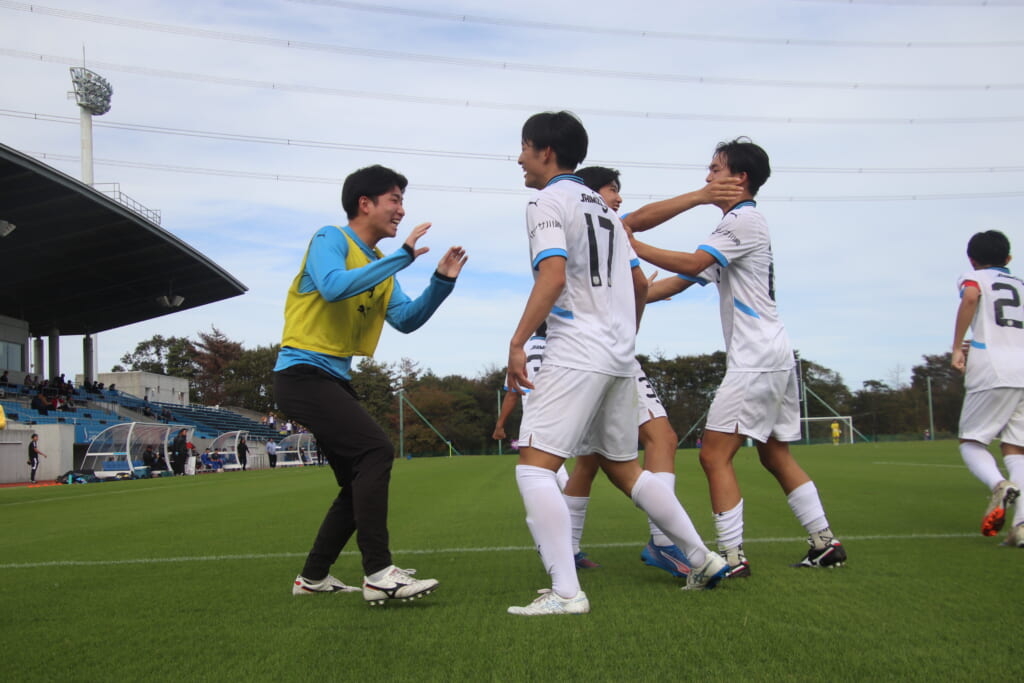 すぐ横で見守っていたサポーター、控えの選手たちのもとへ駆けていく選手たち。ゴールの喜びを分かち合います。