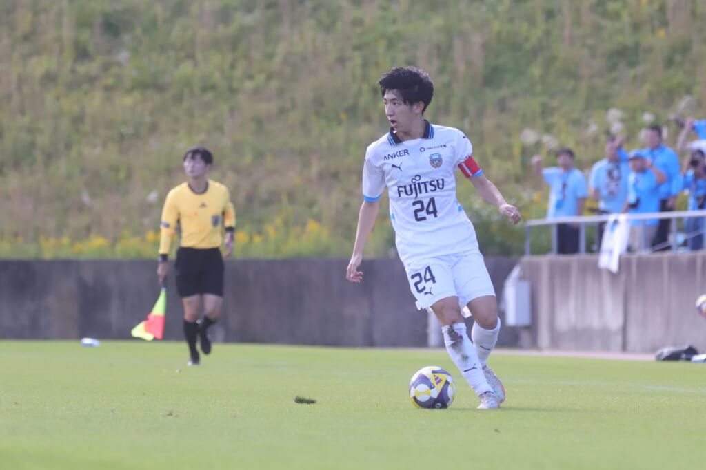 右へ開いた山川が斜めに速いパスを入れるなどしていくフロンターレ。