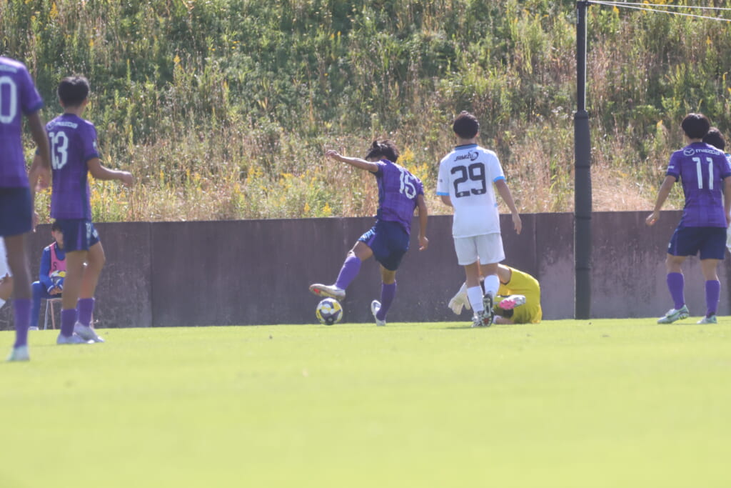 26分には、さらにサンフレッチェ、右サイドでカット。宗田がエリア外右へ持ち込みミドルシュート。しかし、上に。