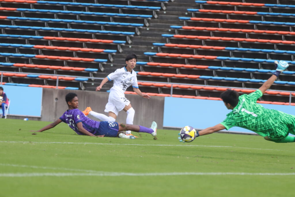 41分にはフロンターレ、小田から長崎、長崎からエリア外正面、全、十河とつながり、十河から左サイド、木村へ。木村がクロスを入れると菊池がエリア内へ飛び込みますが、GK小川煌がセーブ。