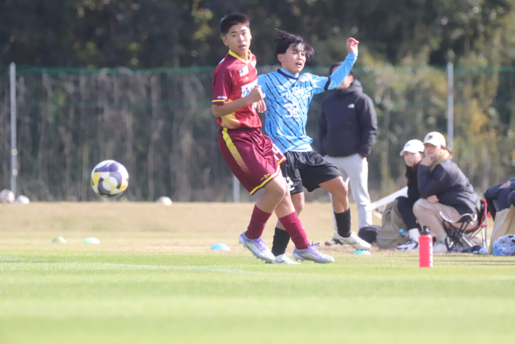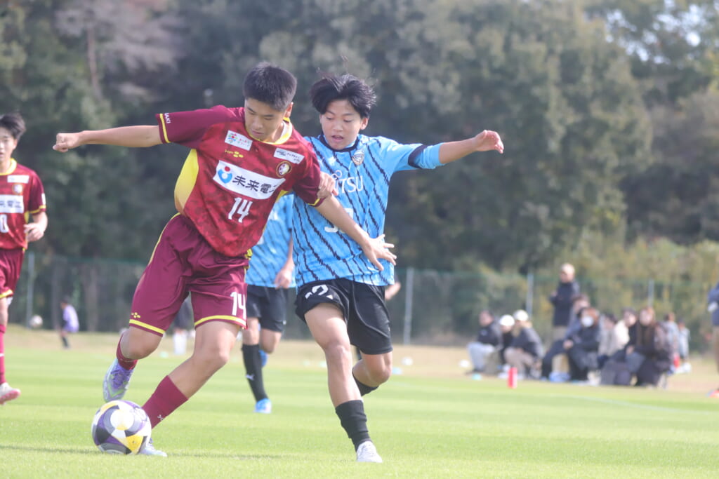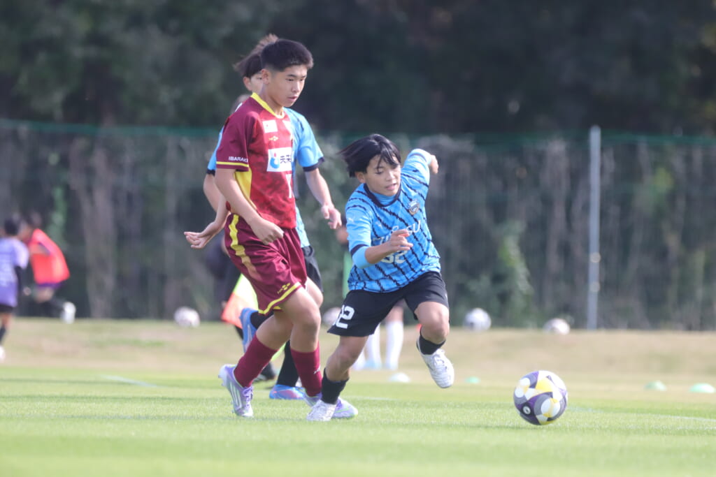 浮き球に対しても、しっかり競り、球際に負けずにプレーしていくフロンターレ等々力、うまく間で受けた遠山煌斗が前に持ち出し、縦パスを受けたオガーが右サイド、高い位置へ。FC古河も粘り強くそれに対応し、チャンスにはつながりませんでしたが、前に出る場面をつくっていきます