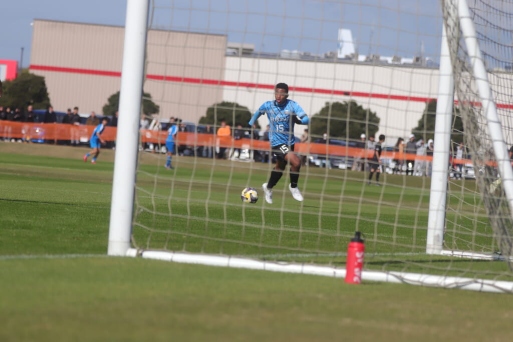 直後にはFC古河、右サイドへ展開すると、伏木が正面へ斜めの速いパス。しかし、渡部泰地がしぼって対応。フロンターレ等々力の集中した守りが阻んでいきます。