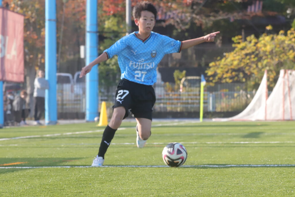 第1ピリオド、フロンターレのメンバーは、GK19吉澤優人、最終ラインは右から15芳賀廣人、20藤木乃以、29山口堂真、中央に23髙桑湊人、右に22田中真祐斗、左に14宮本櫂、前線には27島田凌迅。