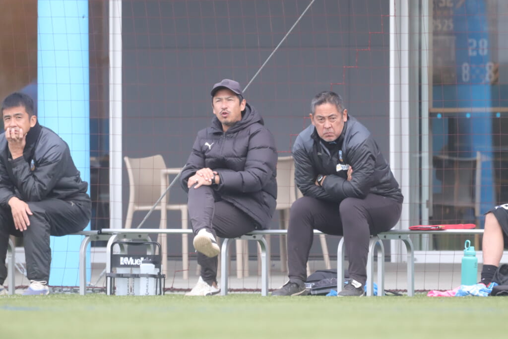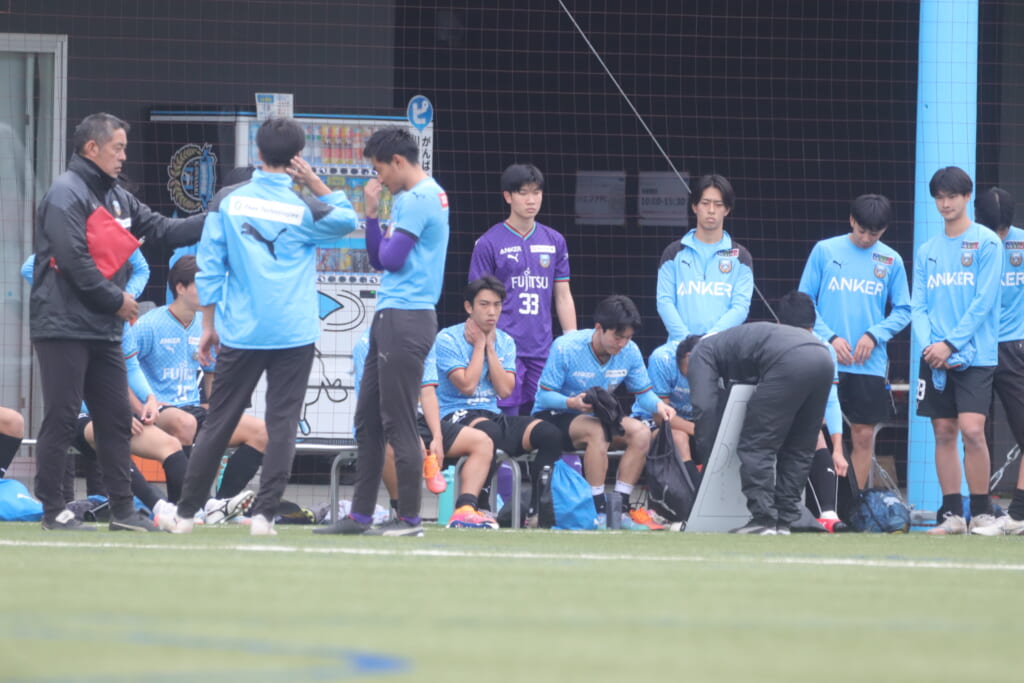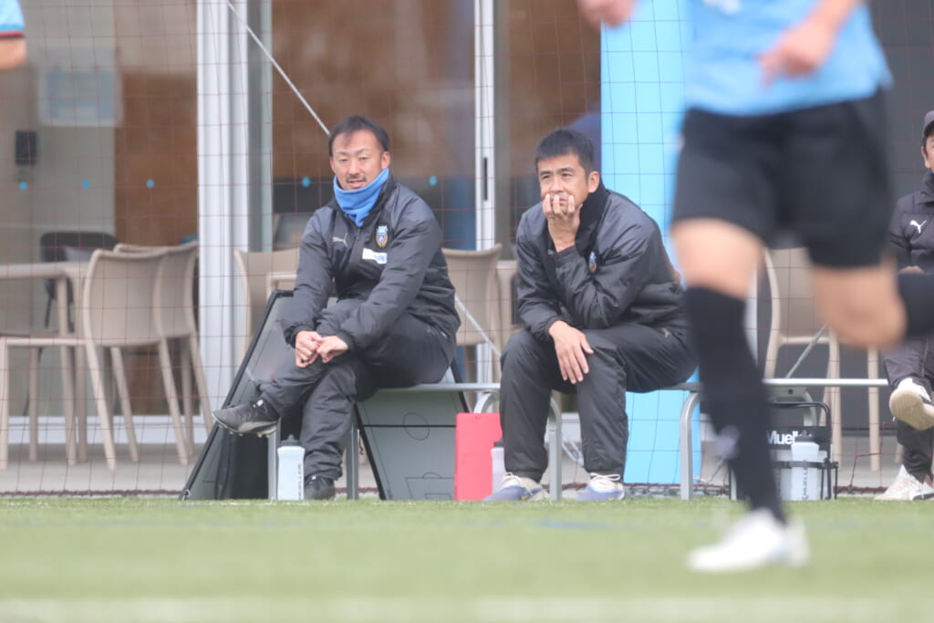 ピッチ脇に設けられた観客席などから、両チームの選手の家族ら、さらにはフロンターレのサポーターらが見守るなか、練習試合は始まりました。