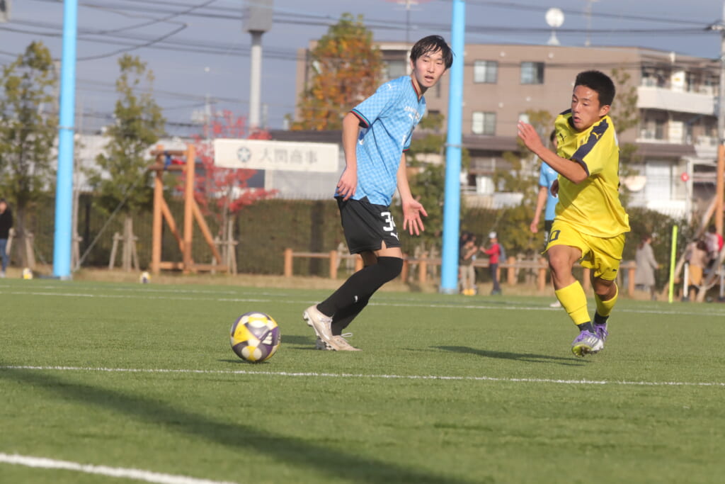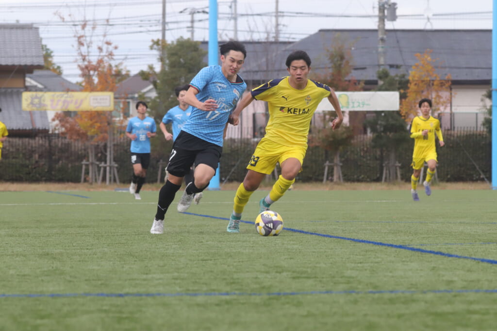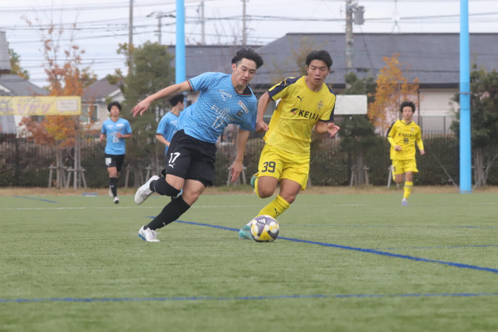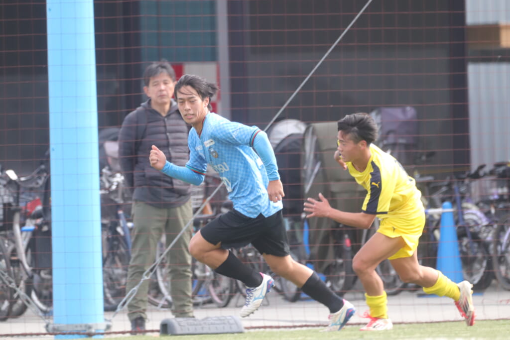 さらに加藤からうまく間で受けた藤井のパスに川村がまたもエリア右へ。ここでも西武台高校、左SBの13が対応。