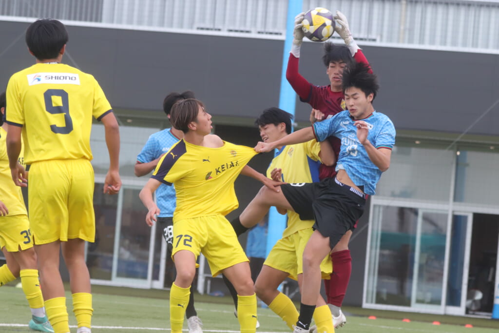 左コーナーキックを得た西武台高校は、遠いサイドで合わせますが、岡本がセーブ。
