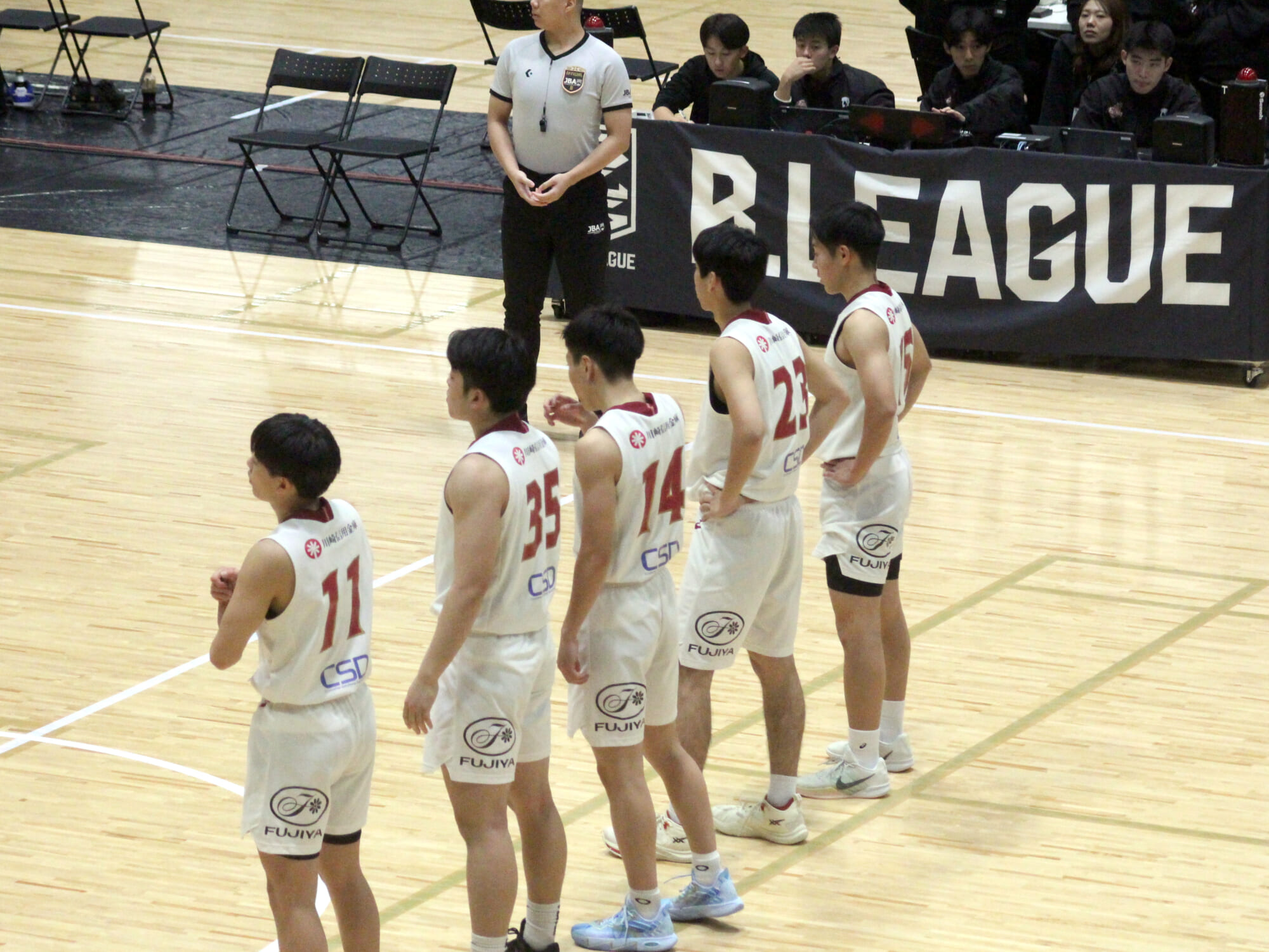 川崎のスターティング5は11 高橋秀成、14 角田永夢、16 竹下聖治(c)、23 槙孜龍、35 鈴木蒼太。U15川崎ブレイブサンダース所属の6 日野逸翔、30 牟田獅もメンバーに名を連ねました。