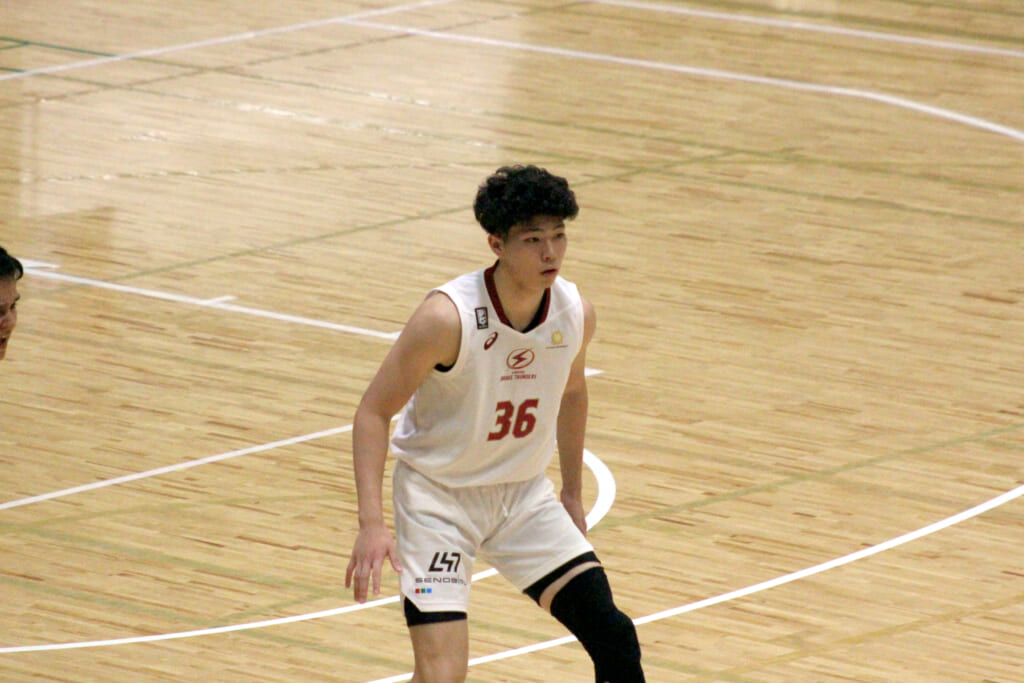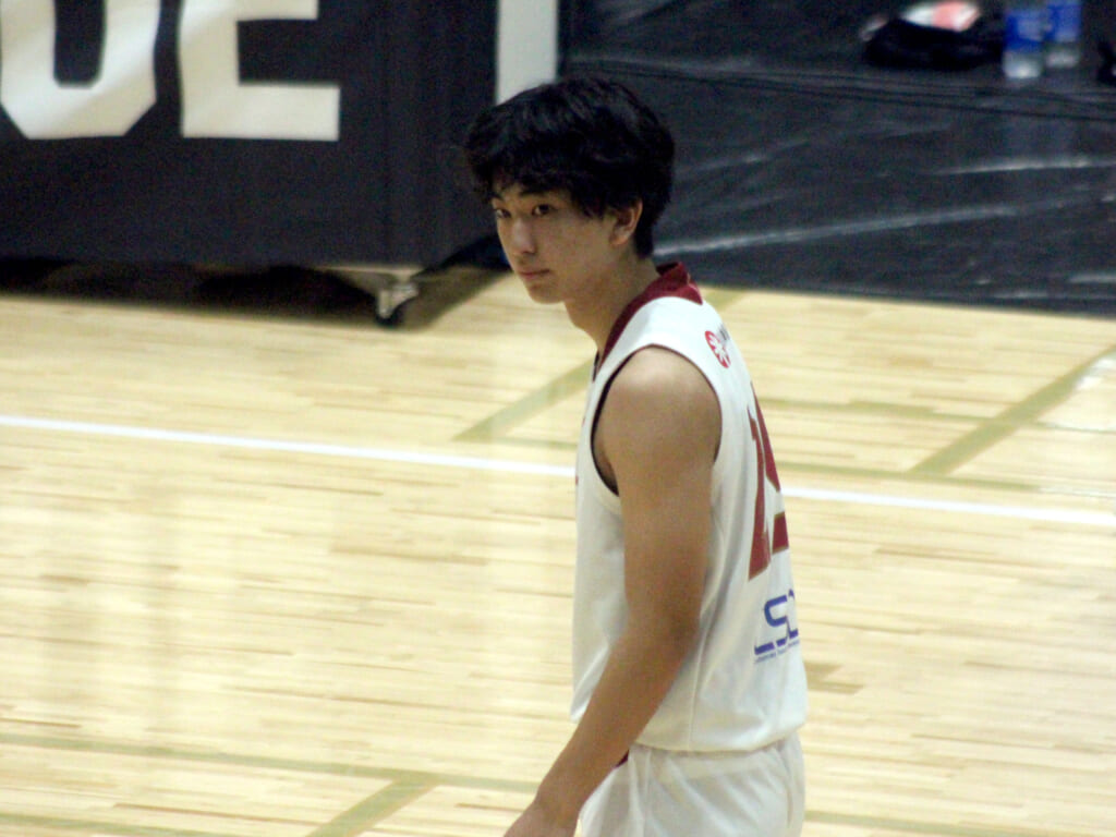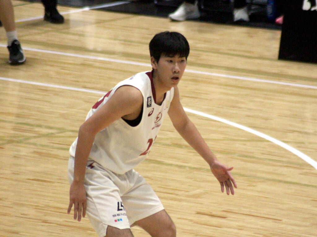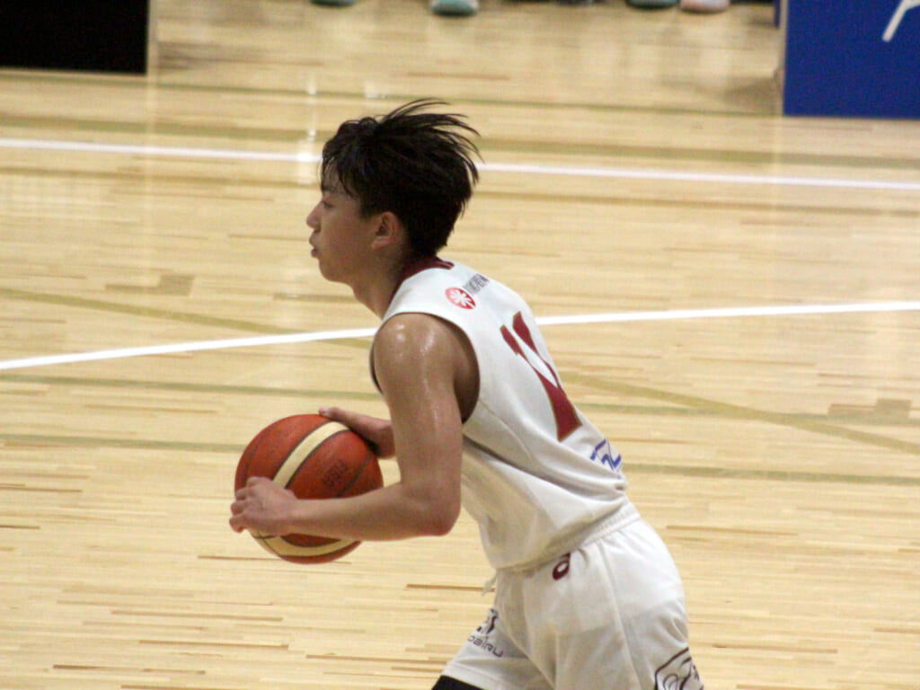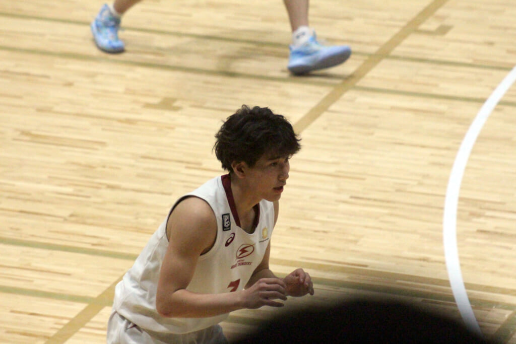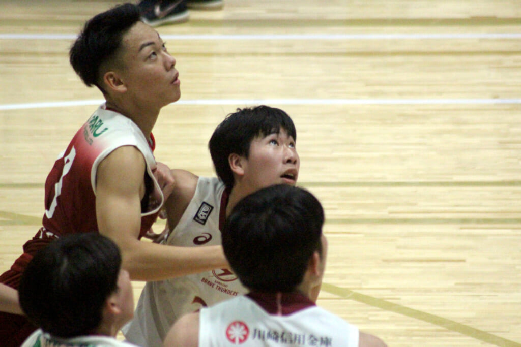 そのトランジション、高橋から鈴木へ渡ったボールは右レーンをカットしてきた角田へ。そのままチャレンジしたシュートは外れますが、自らセカンドチャンスを決めます。