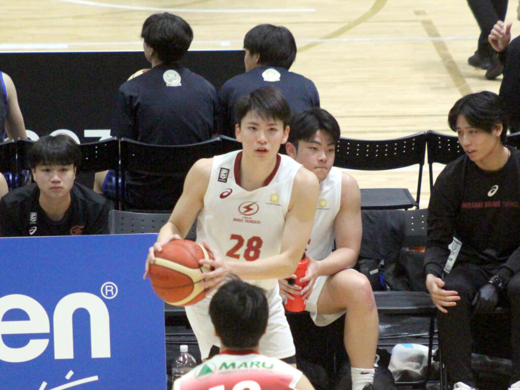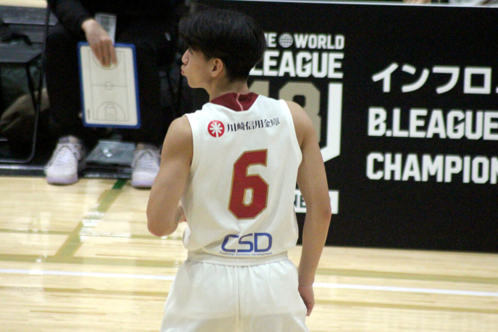 しかしここからは川崎の時間帯。高橋からハイローの合わせでフリーになった鈴木がゴール下から加点すると、途中出場の27 栗山泰青のフリースロー、7 戸川颯琉から36 石川翔梧へのゴール下での合わせ、高橋のミドルジャンパーで加点し、1qを24-14で終えます。