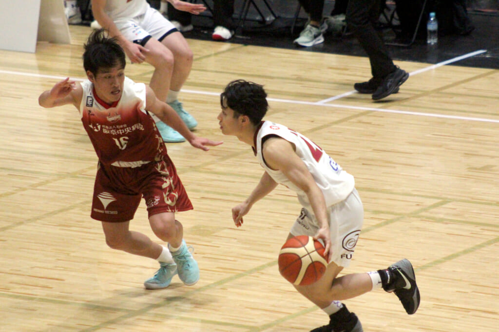 8:20には奈良。ミドルレーンのドライブを仕掛けた5 山﨑壮裕がダブルクラッチでブロックをかわし得点。奈良はこの試合最初の得点となりました。