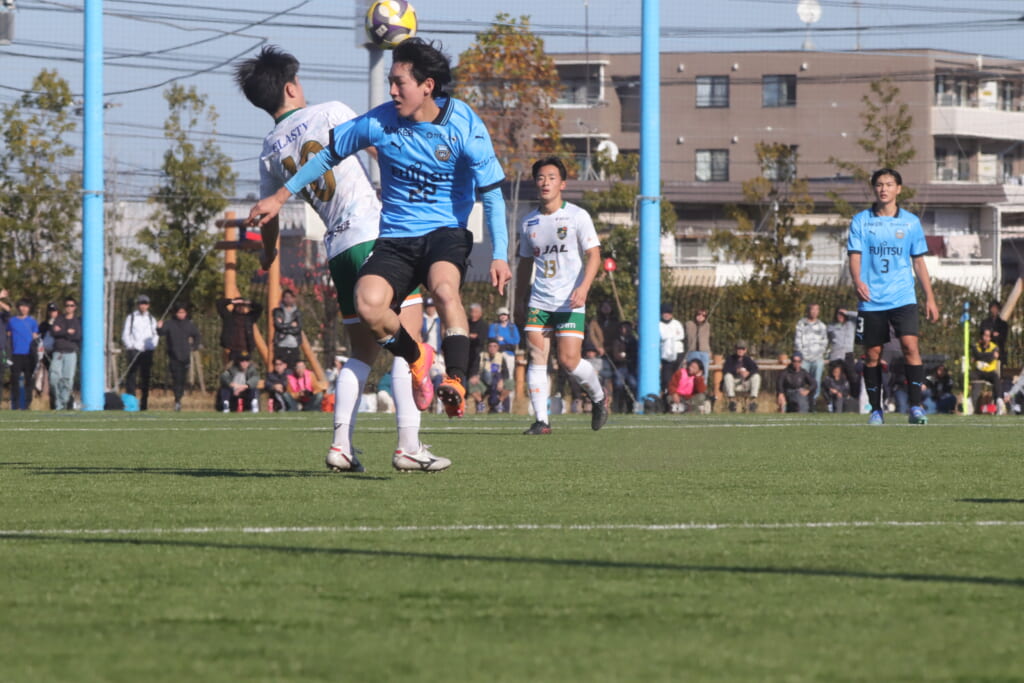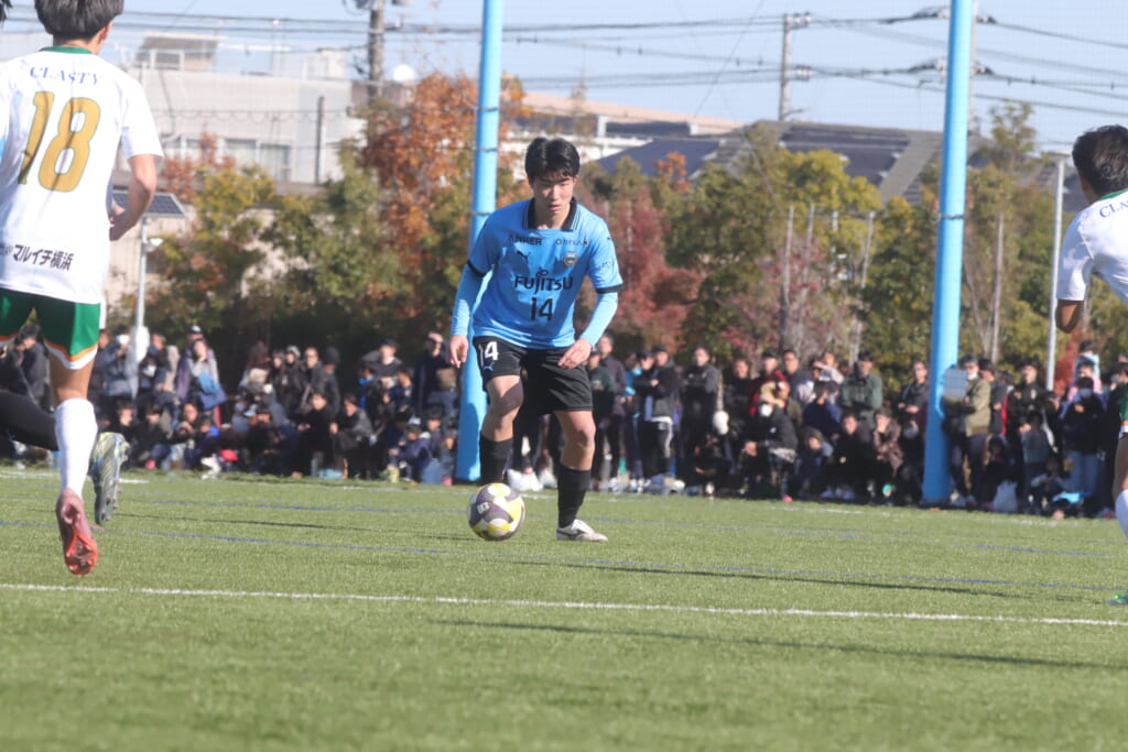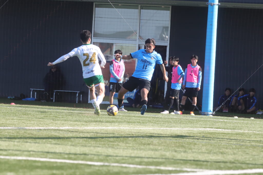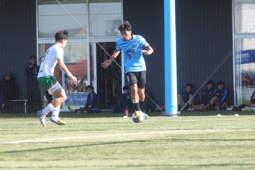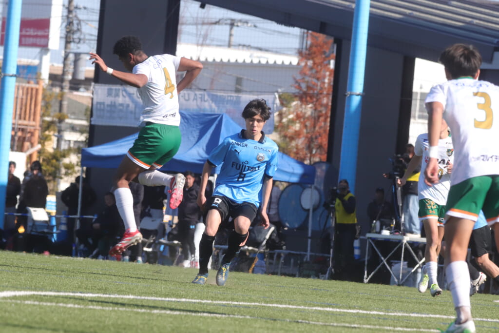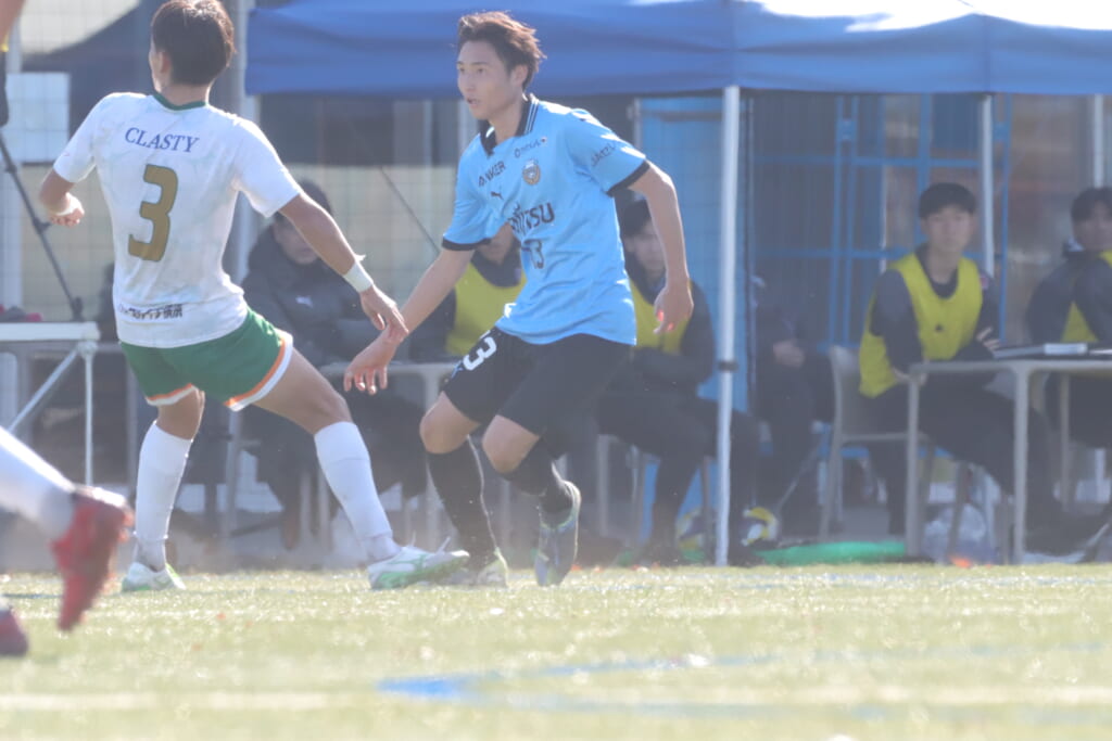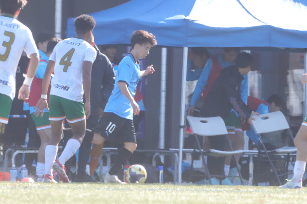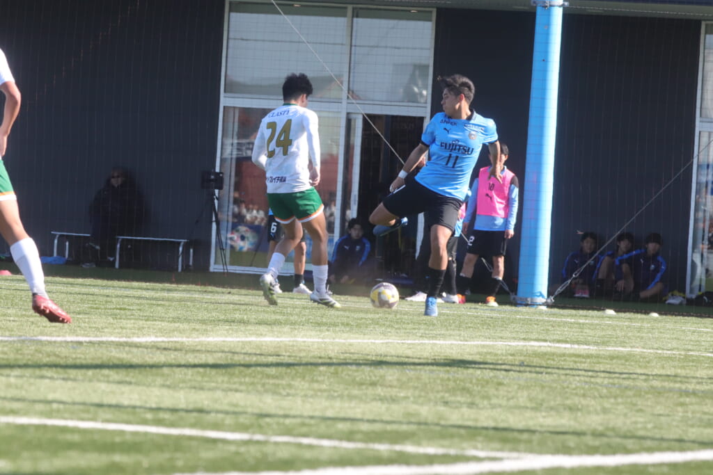 さらにフロンターレは、楠田、藤田に小川尋斗が間で受けながら、ボールを動かす時間をつくり、11分には、小川尋斗のパスに抜け出した柏村が右クロスを上げるも青森山田はクリア。