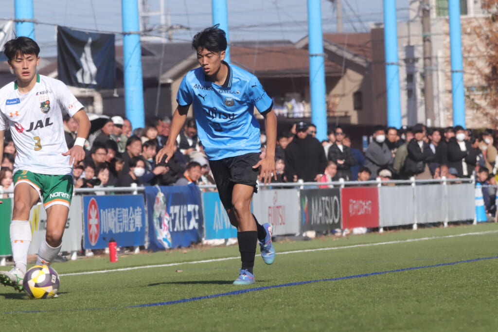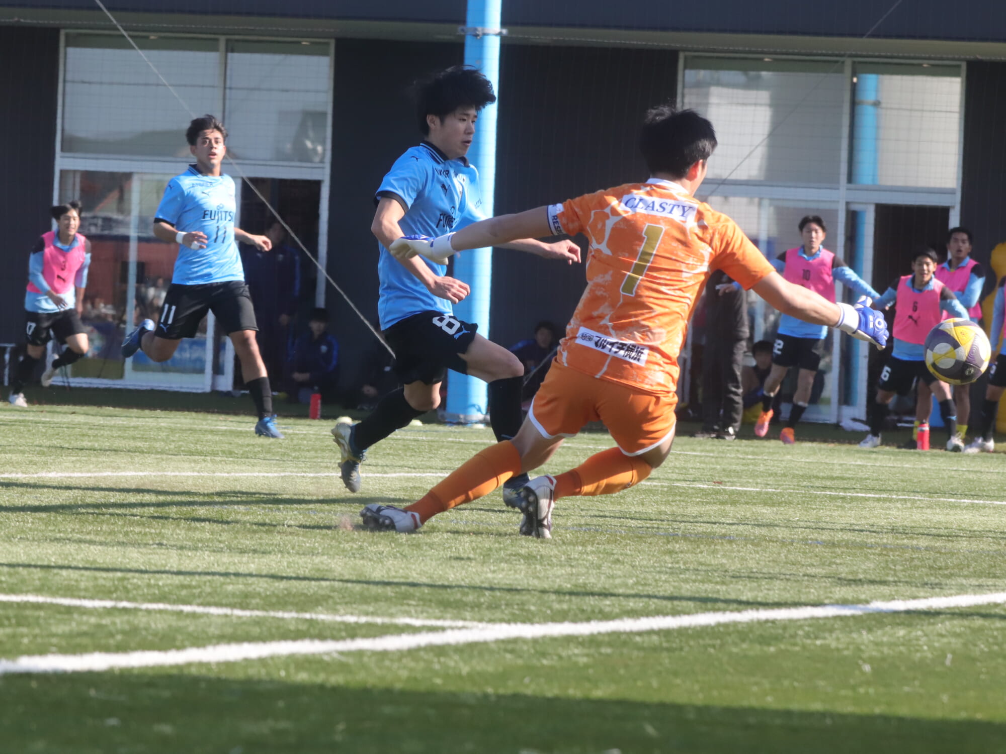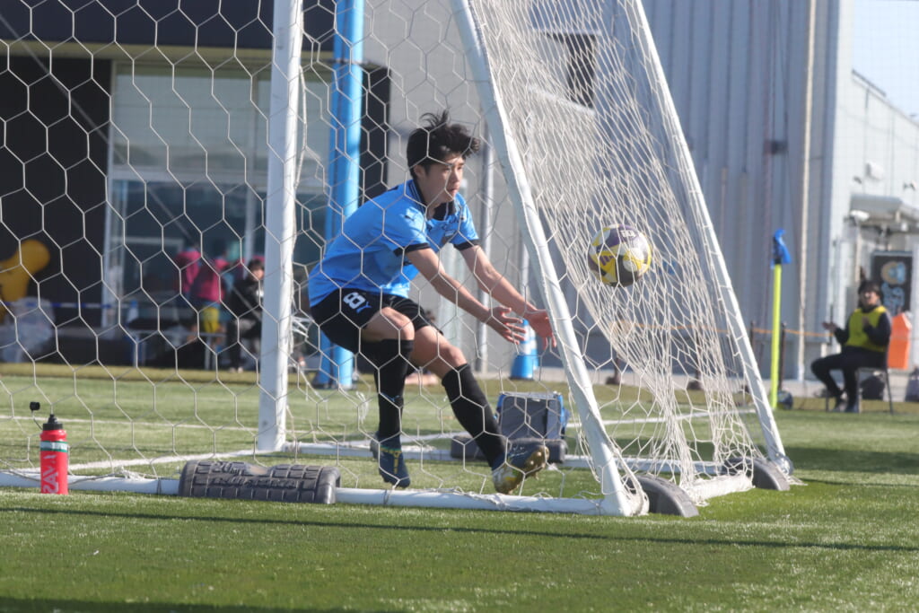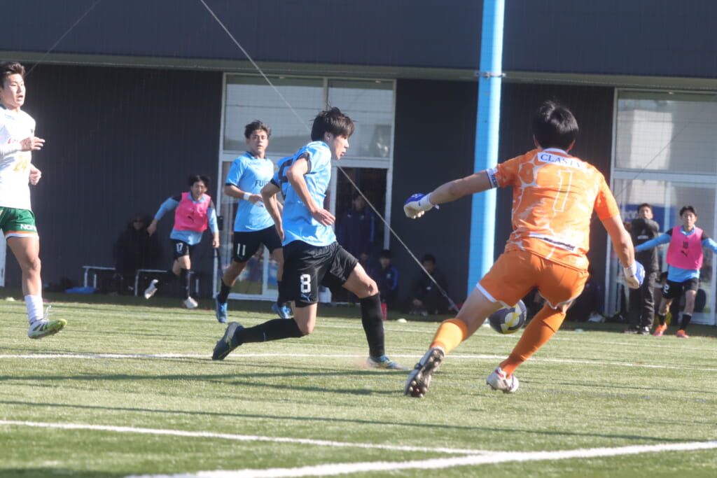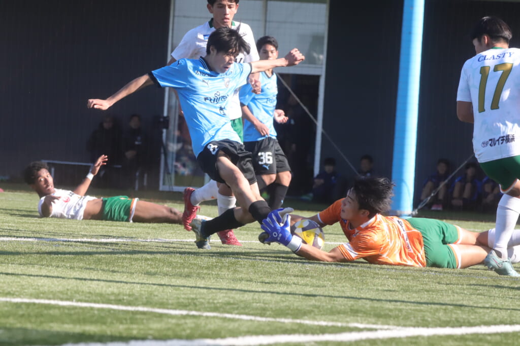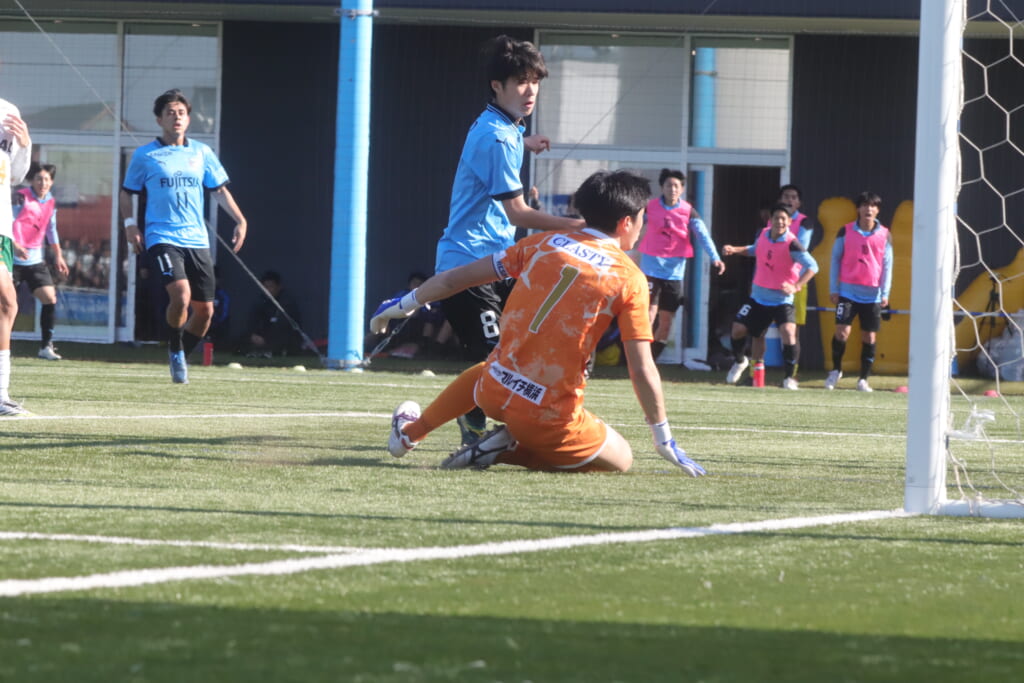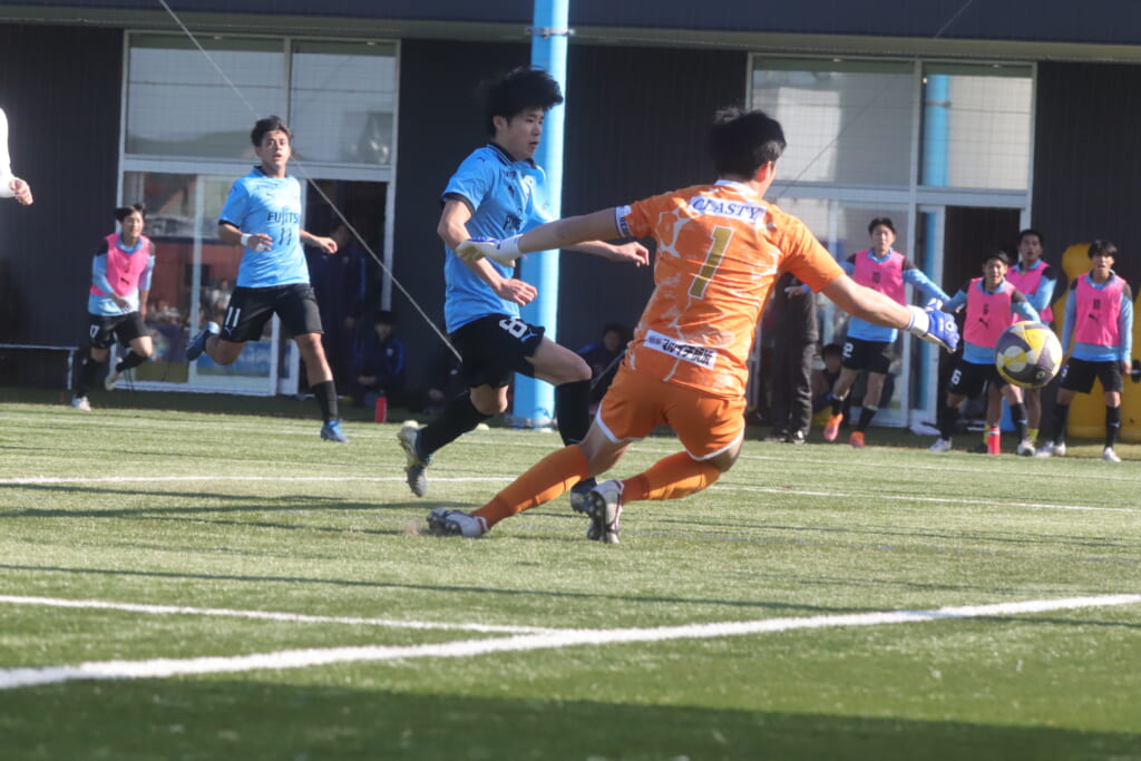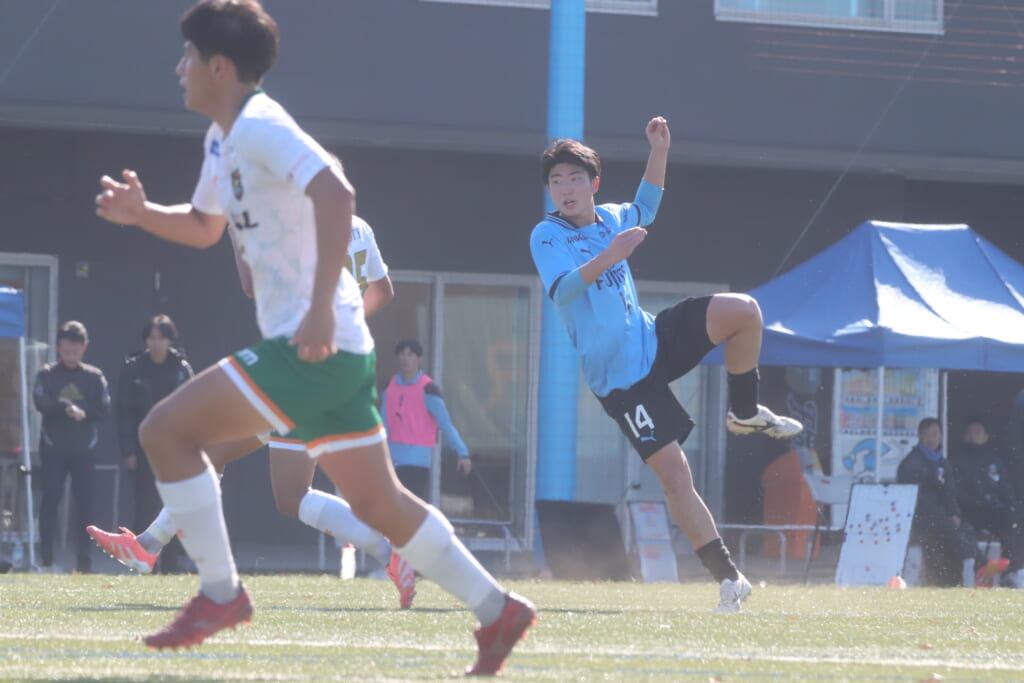 立ち上がりは、青森山田、ラインを高め、長いボールを入れてくる展開に。GKの松田が正確なボールを入れ、フロンターレのエリア前での時間をつくっていくと、エリア右で、斉藤がシュート。これに対しては、松田がセーブ。