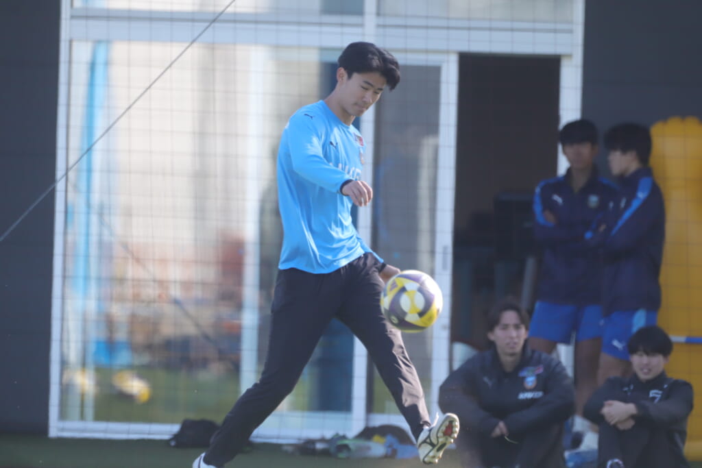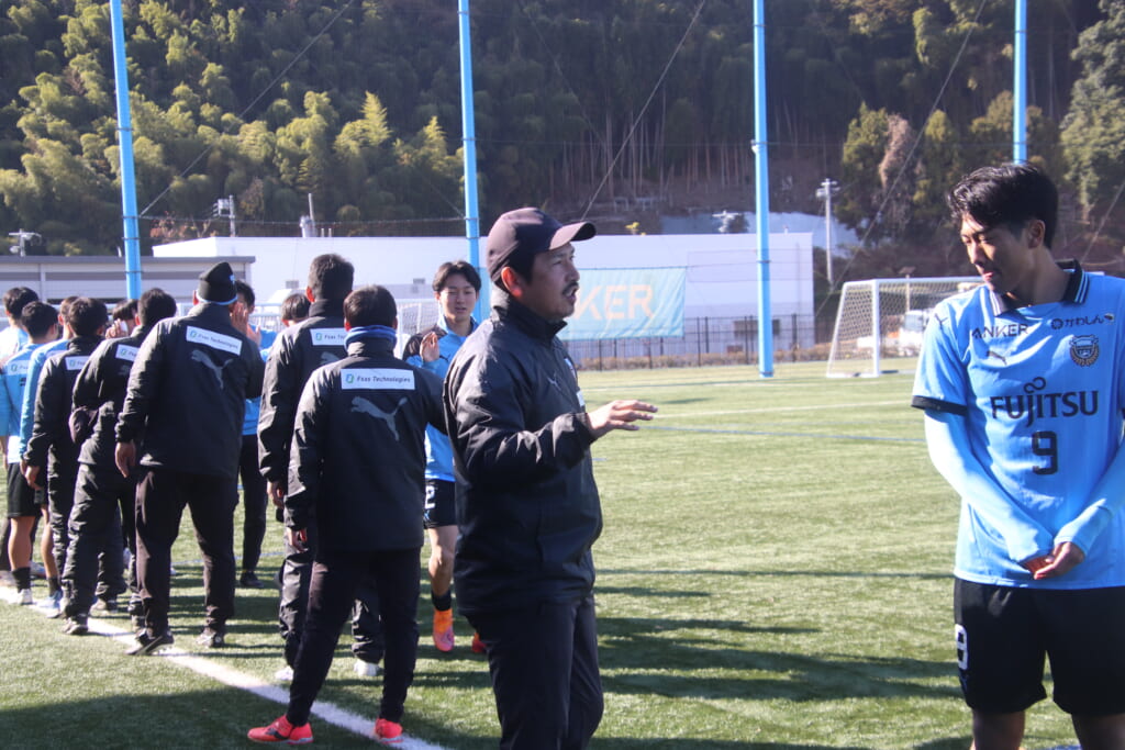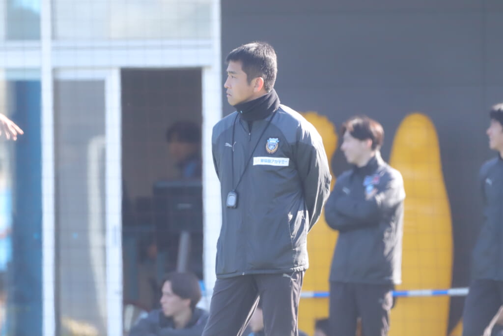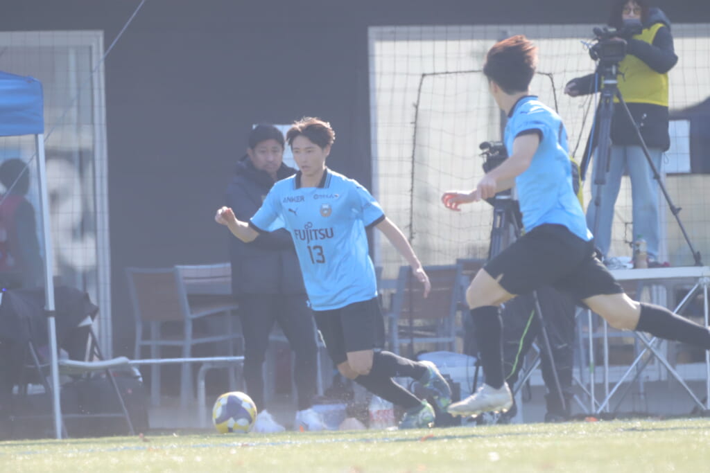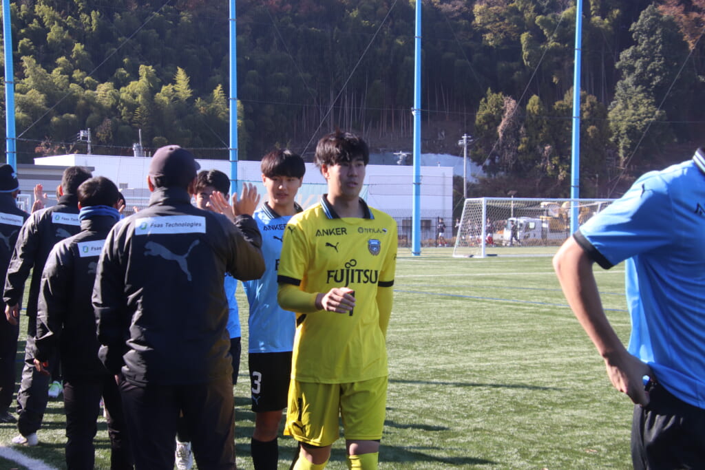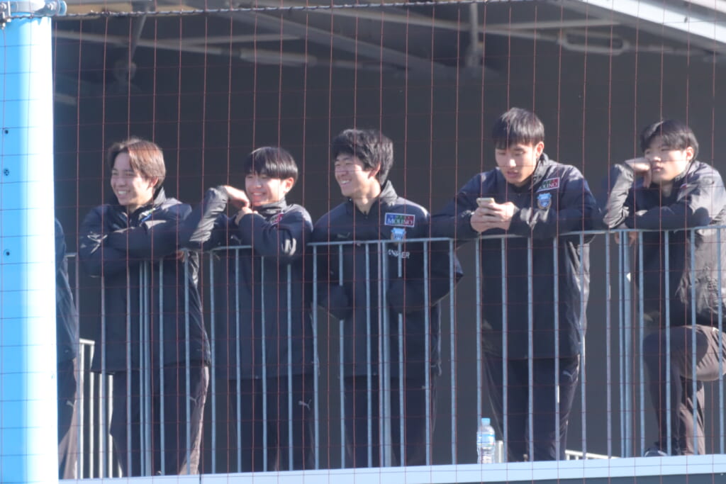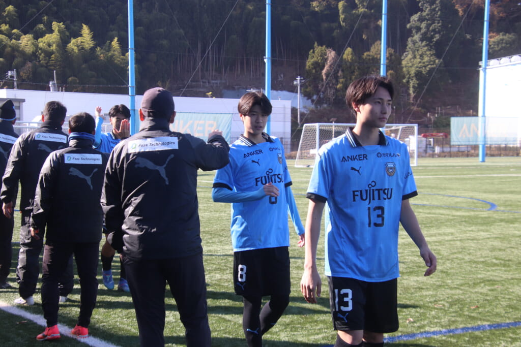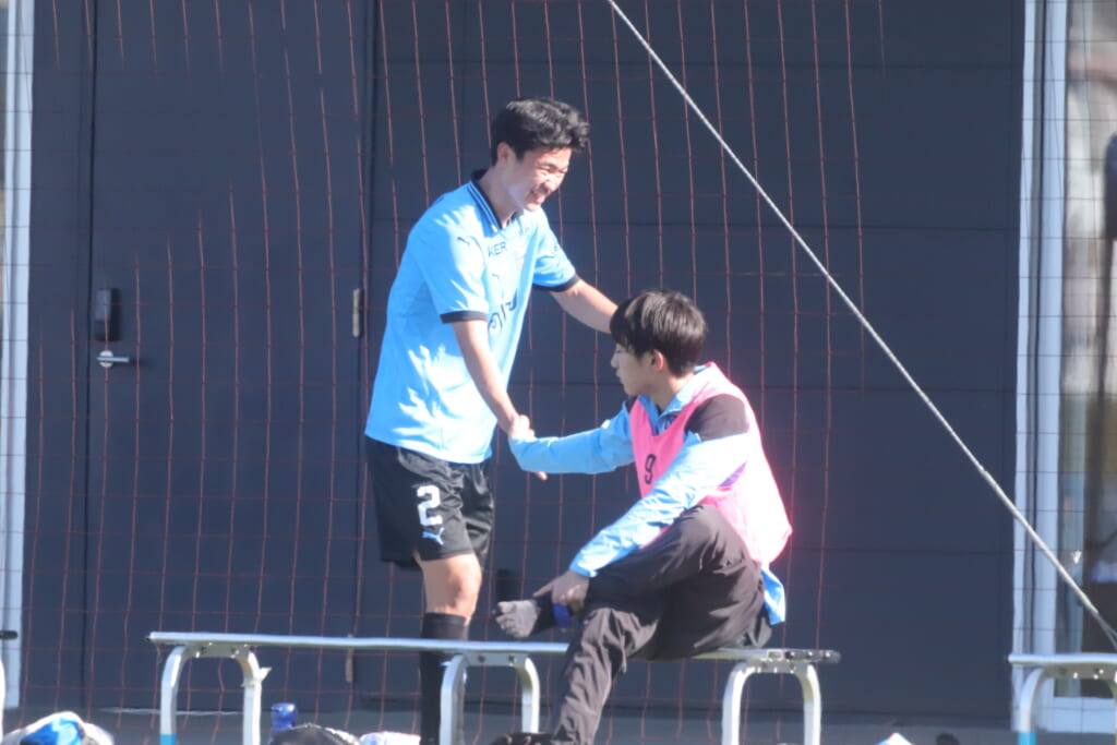 青空の広がった好天のAnker フロンタウン生田。両チームの選手の家族らはもちろんのこと、この日Uvance とどろきスタジアム by Fujitsuでトップチームのホーム最終戦を控えたフロンターレサポーターや、多くのサッカーファン、サッカー少年らの姿も。ピッチ脇に設けられた観戦者向けのスペースだけではなく、ネット越しからも多くの人々が見守る。熱を帯びた雰囲気の中、キックオフの時を迎えました。