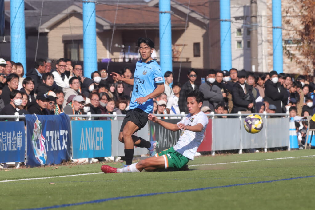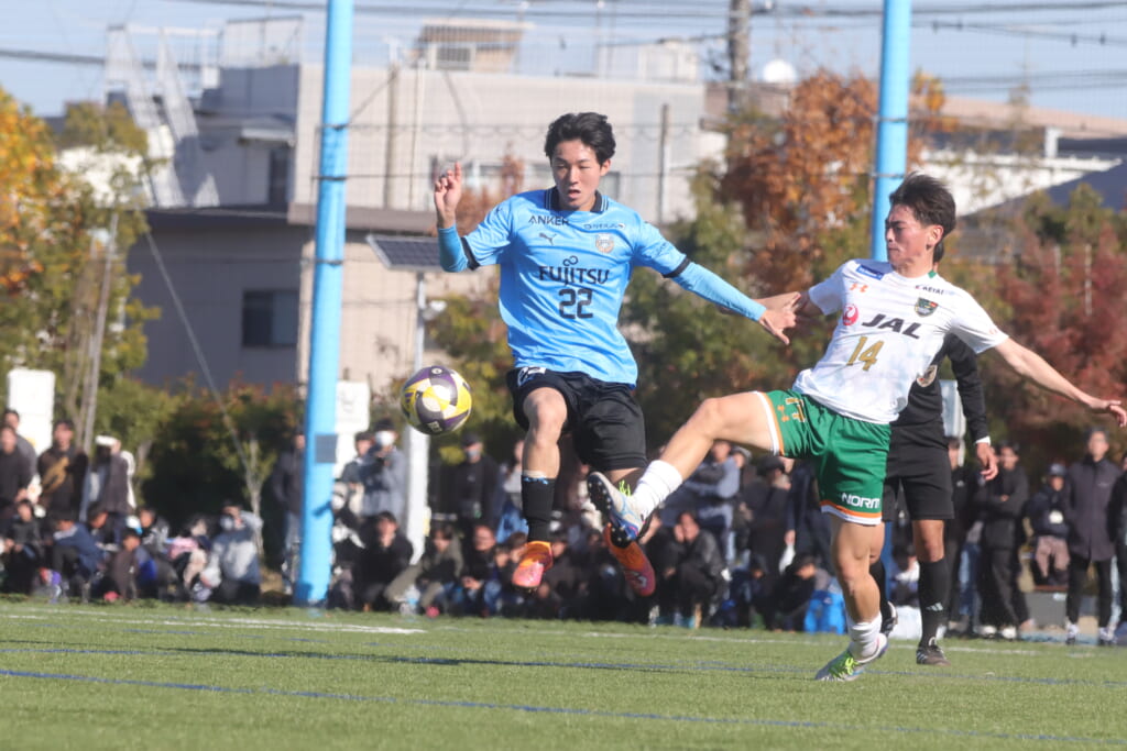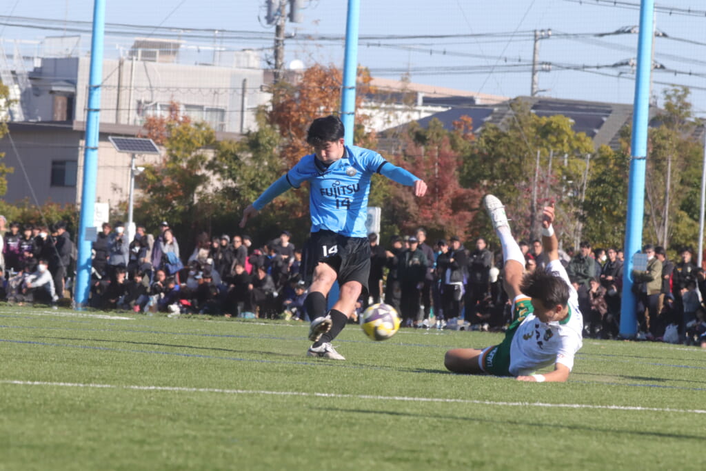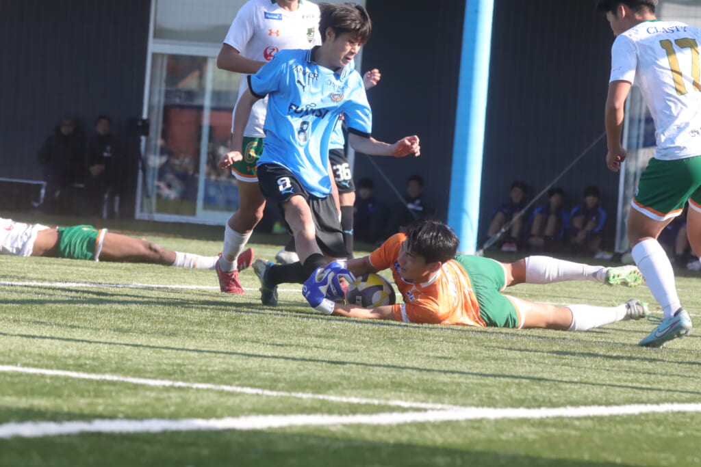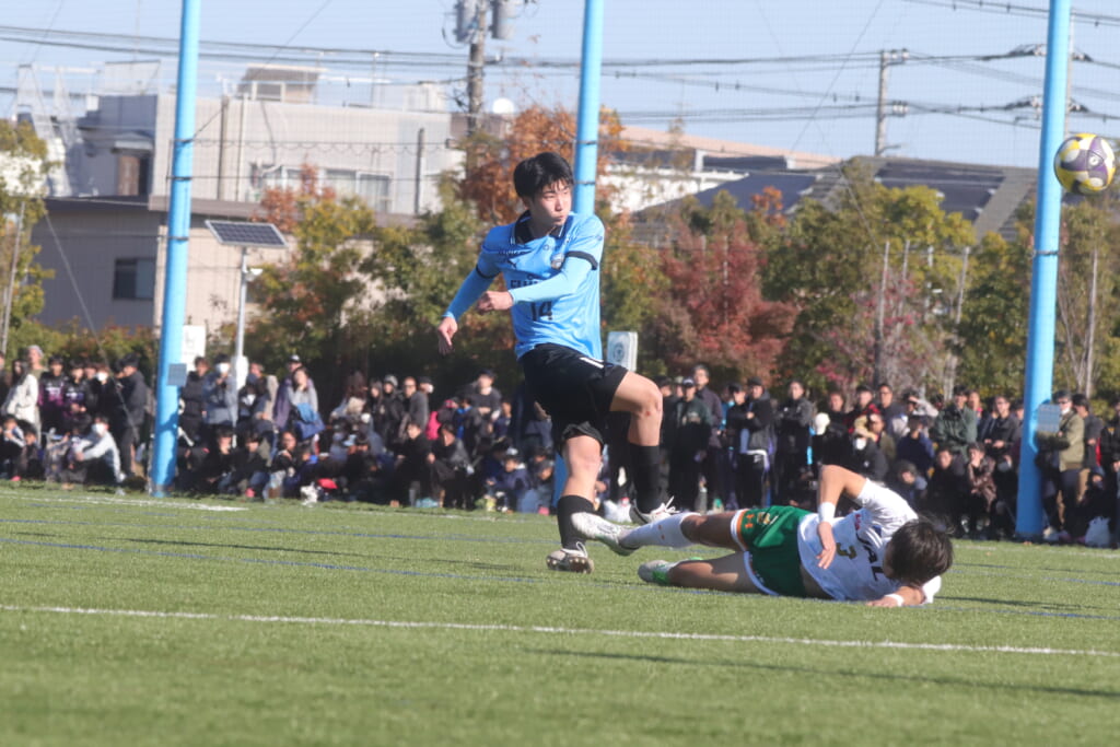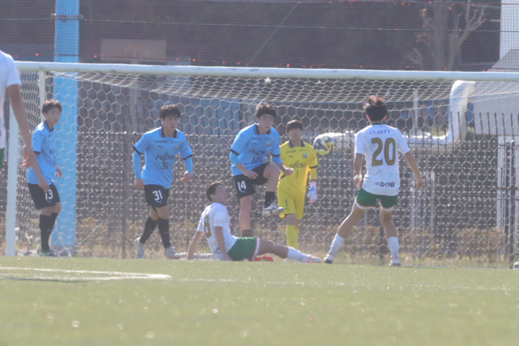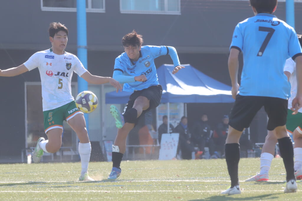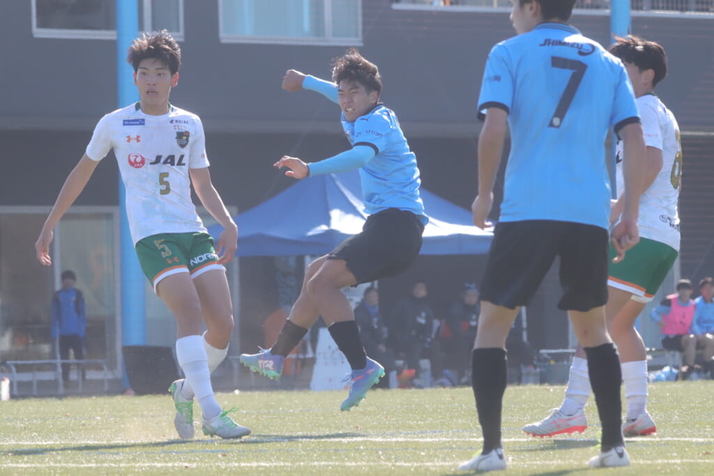 セカンドボールを拾ったフロンターレ。小川尋斗がエリア外正面でシュート。しかし、青森山田はブロック。