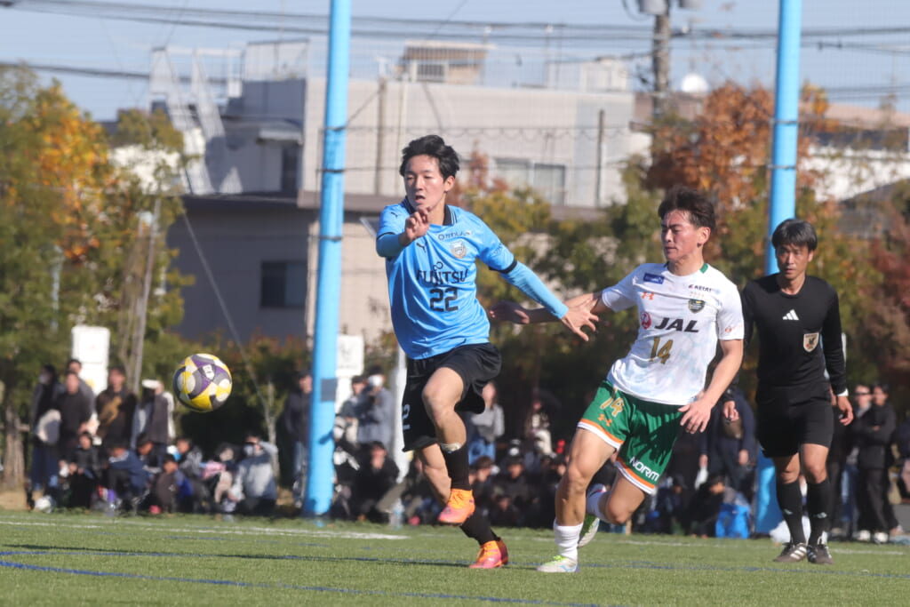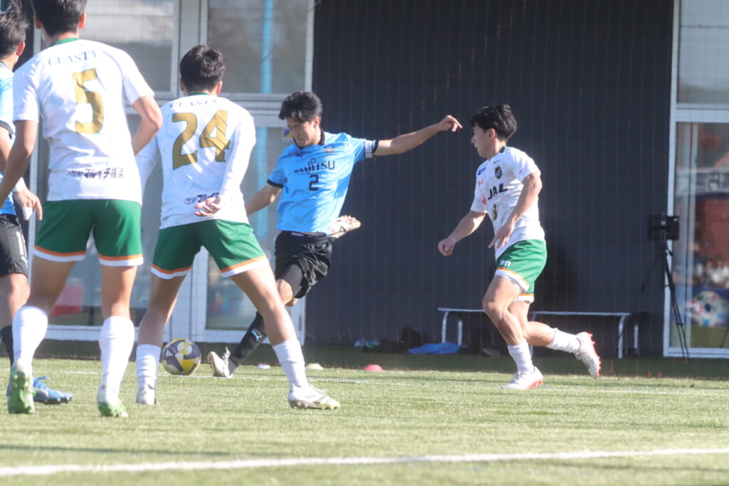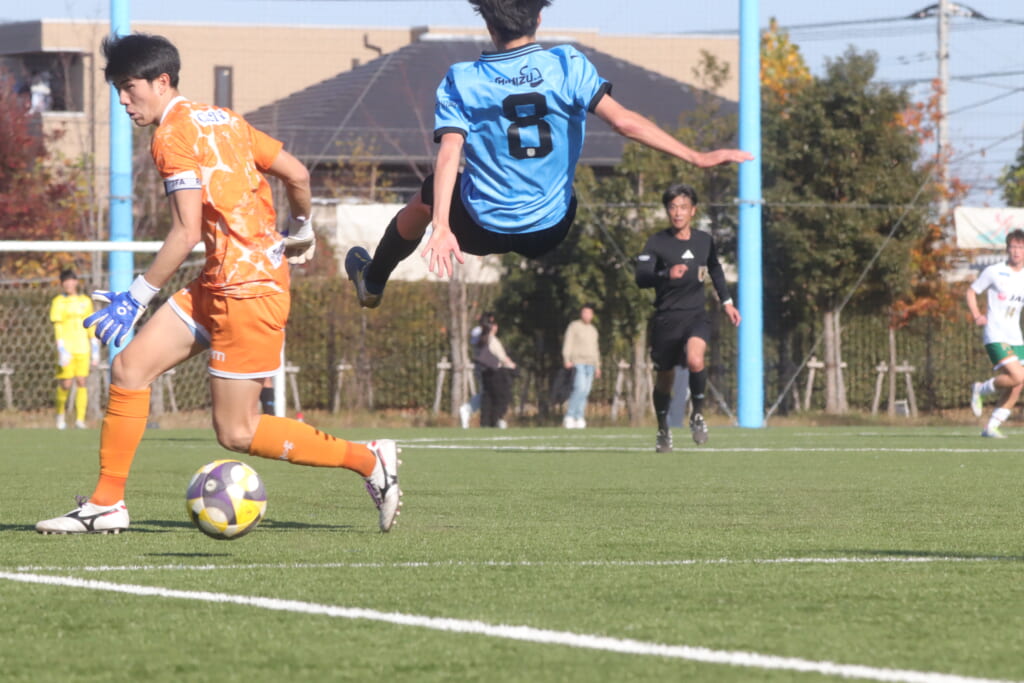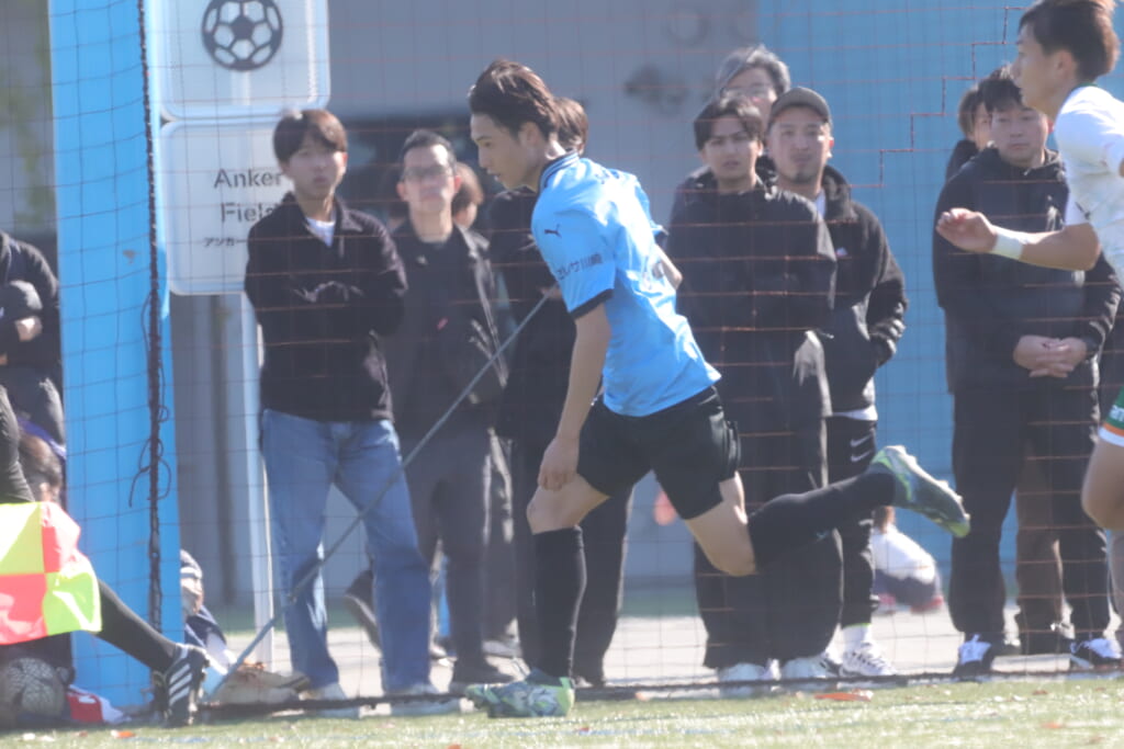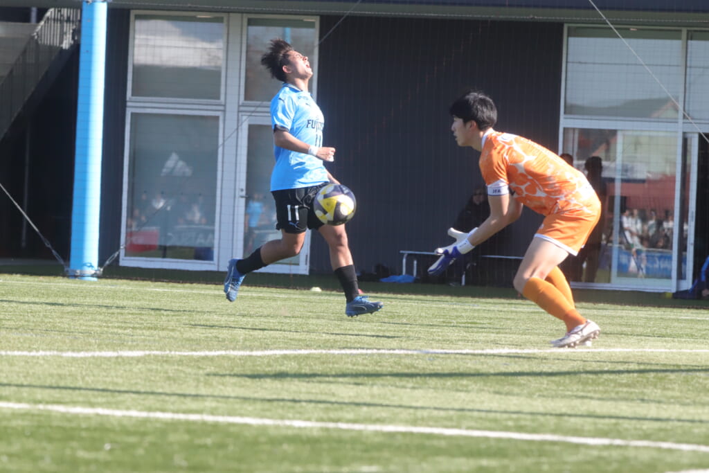 藤原が入れると、正面で深瀬がヘディング。エリア内、うまく飛び出した島津がシュートを打つとこれが決まり、1-3。