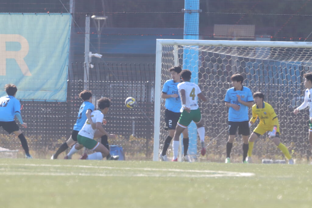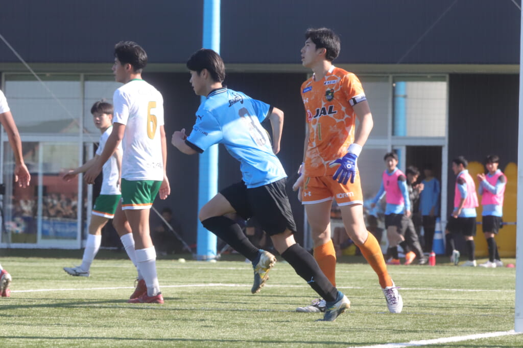 一方の青森山田も、菱田が右サイドからクロスを入れるなど、再びフロンターレのエリア前にボールを入れ、そこからゴールへ迫る時間をつくっていくと、6分には、右コーナーキックを得て、藤原が右足で入れると、遠いサイド、島津が触れますが、松澤がセーブ。