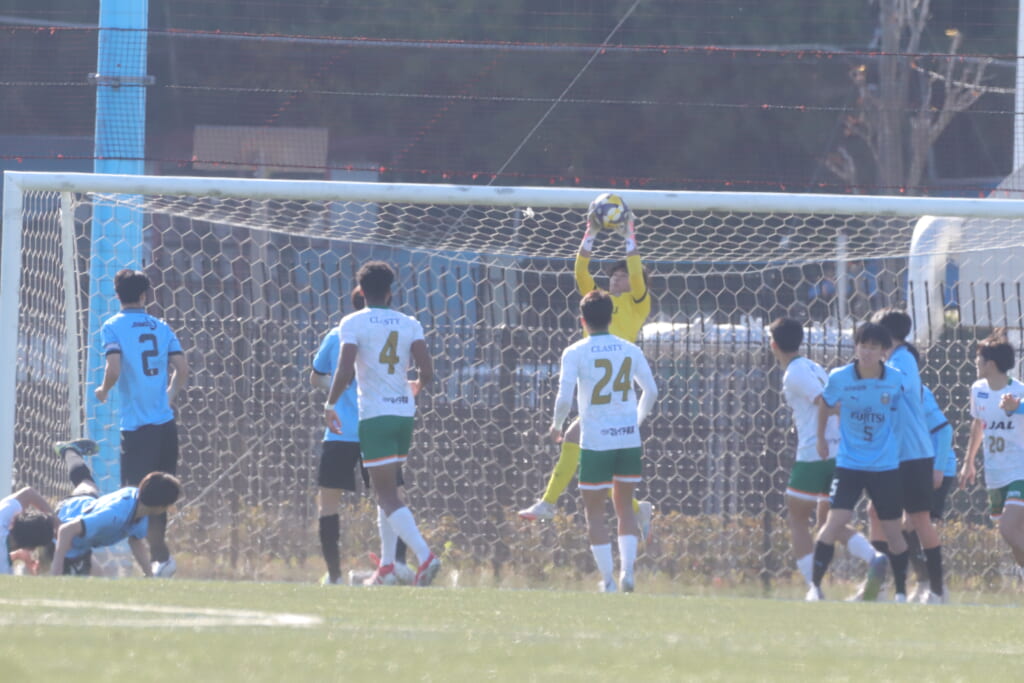 青森山田も高い位置へ持ち込み、スローインを得るとロングスローから追加点を狙っていきますが、フロンターレは松澤がセーブ。