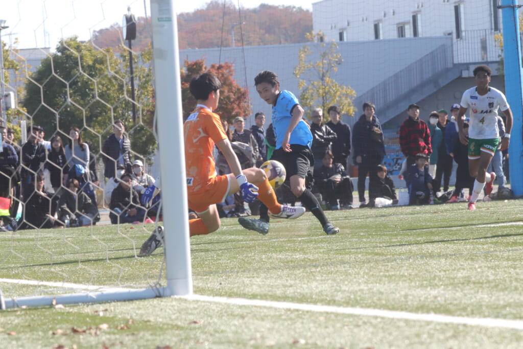 すると6分には、青森山田、藤原から麓、麓から深瀬と高い位置でつながり、正面で深瀬がシュートを打つとこれが決まり、0-2。