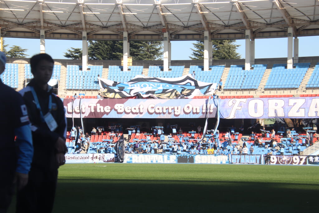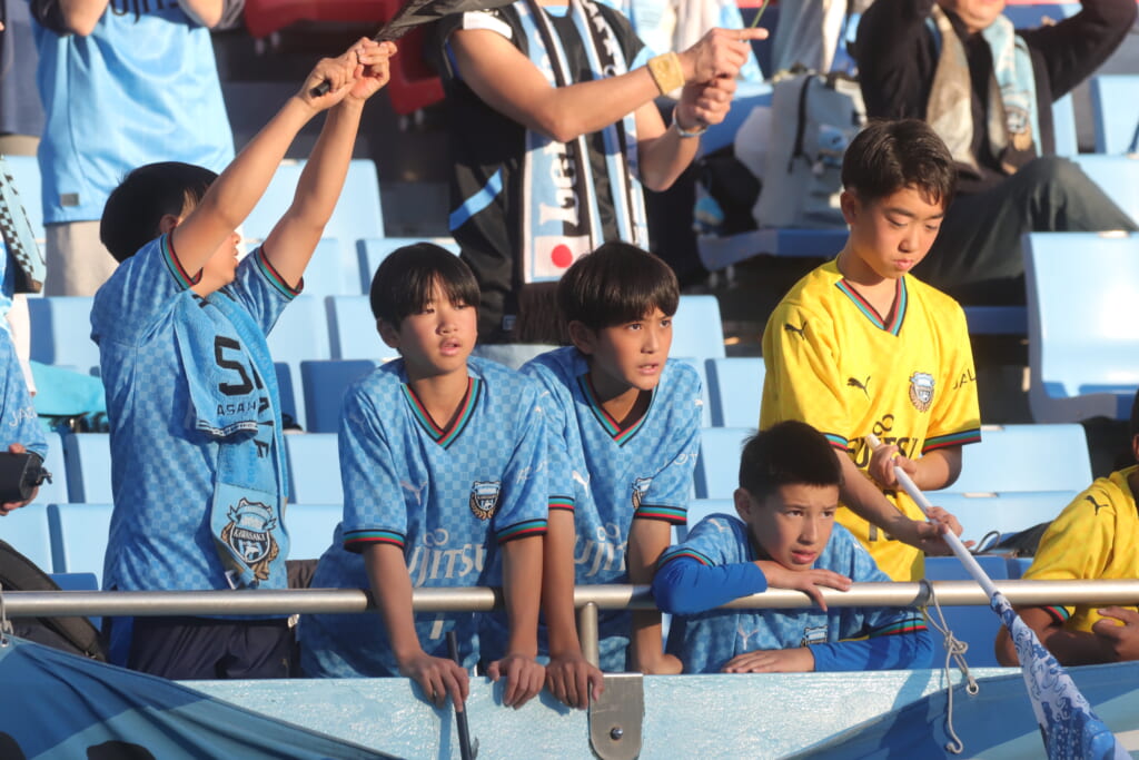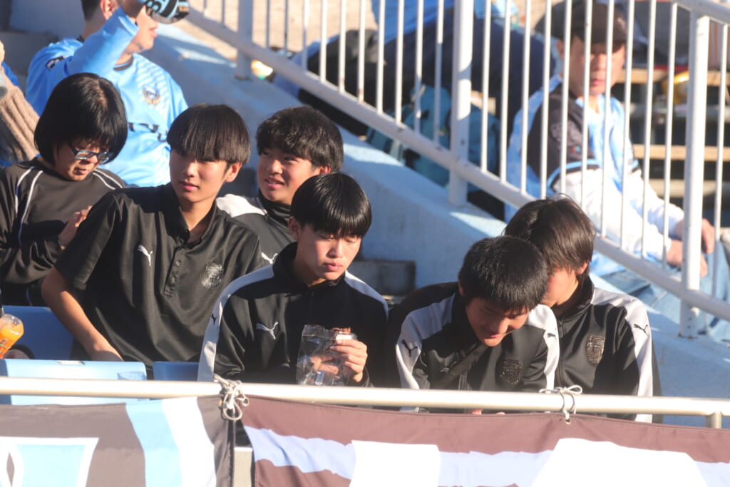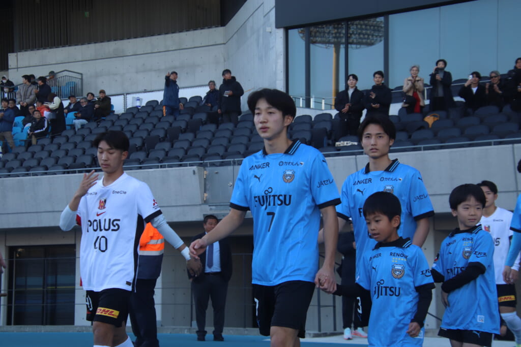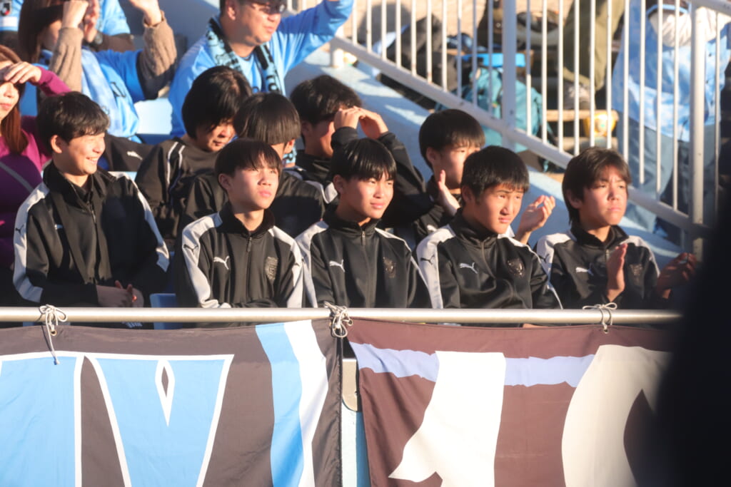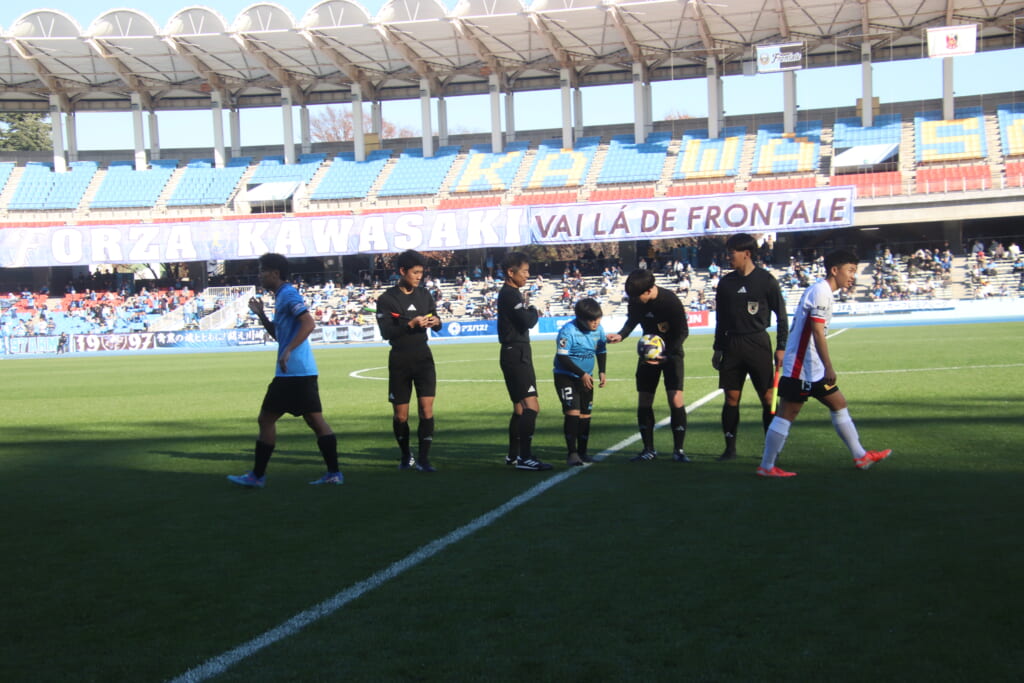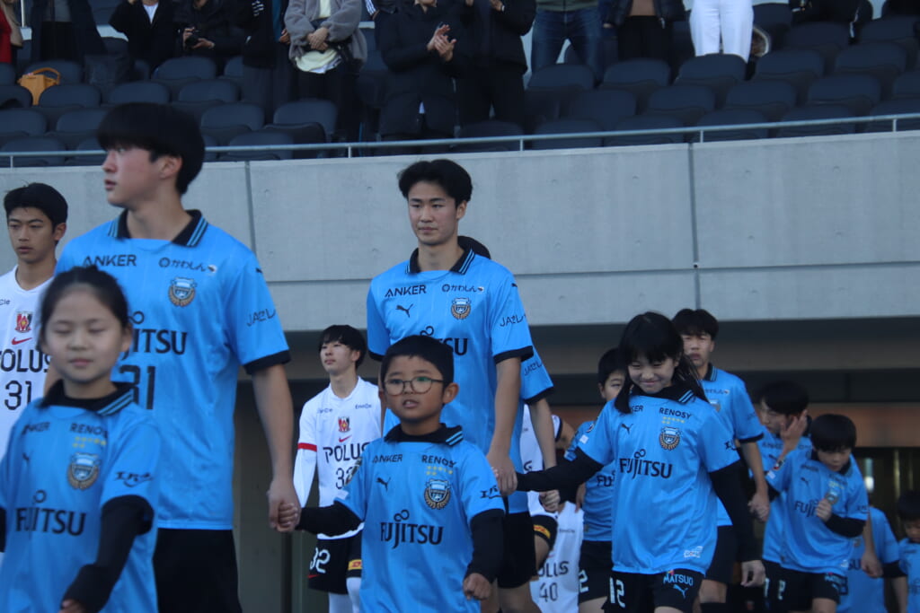 メインスタンドにも多くの人々が集い、フロンターレのサポーターらが幕を掲出し、チャントを歌えば、熱心なレッズのアカデミーのサポーターたちもゴール裏で旗を振り、選手たちを励ます。それぞれのチームへの期待のこもった雰囲気の中、キックオフの時を迎えました。