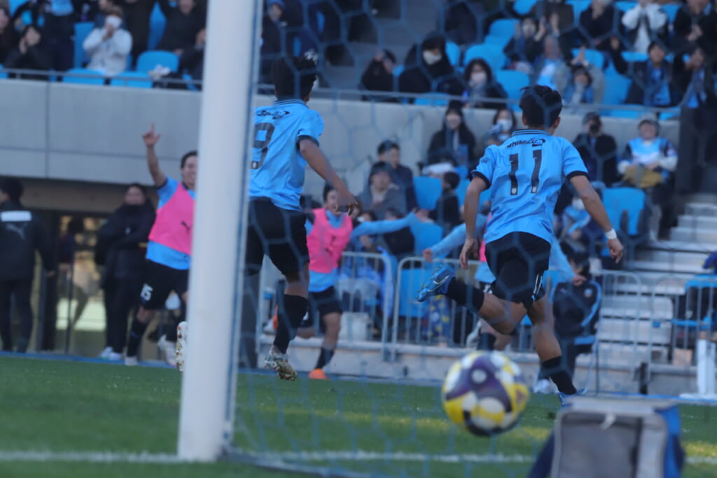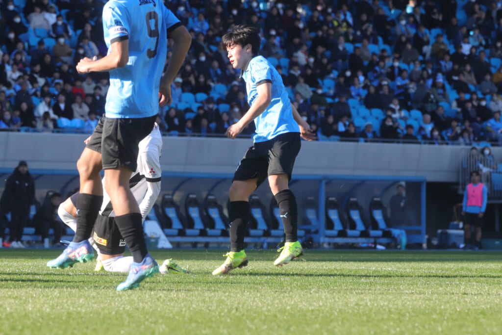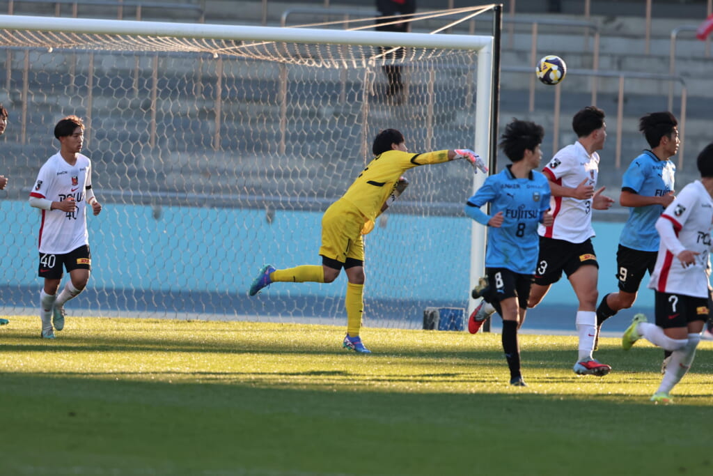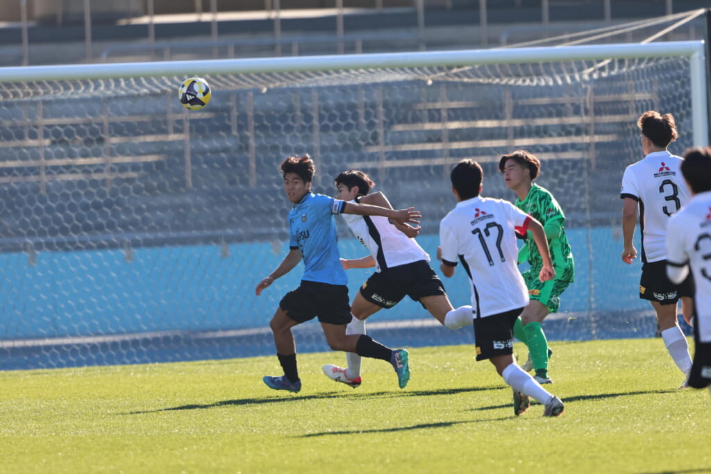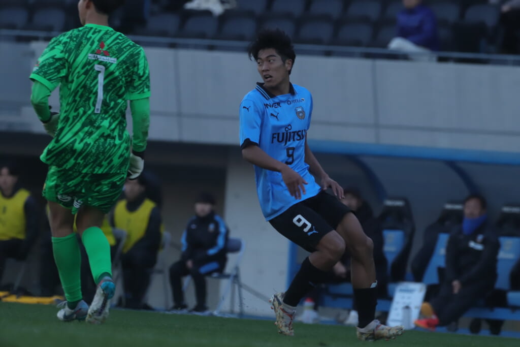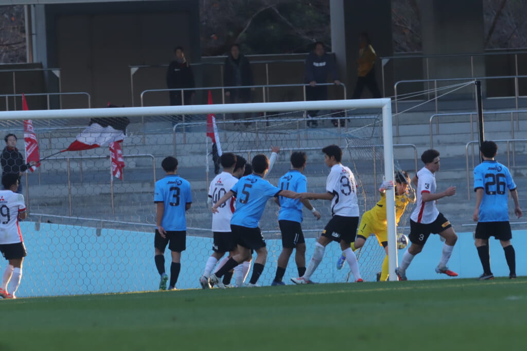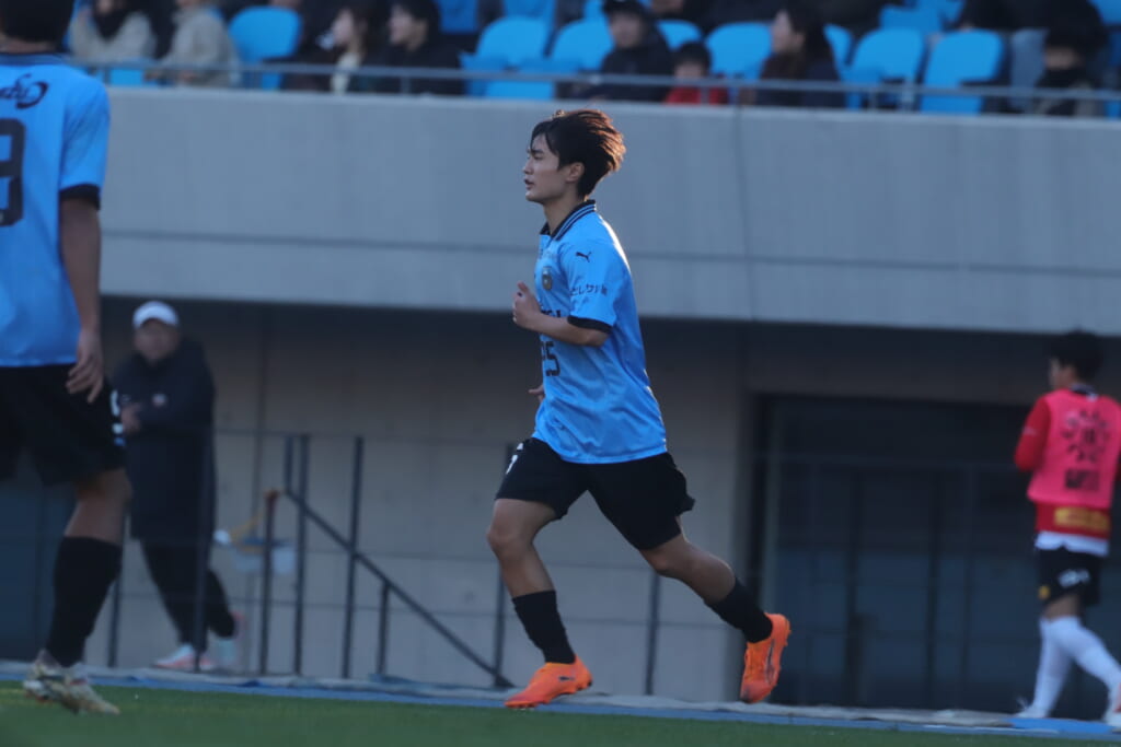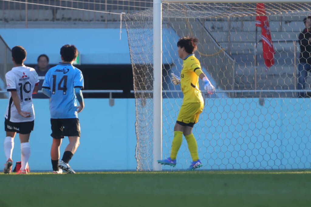 フロンターレは平塚、新堀が立ち、ショートコーナーを選択。平塚のパスにエリア外右で小川尋斗がシュートを打つと大槻がセーブするもこぼれ球に詰めたのは楠田。