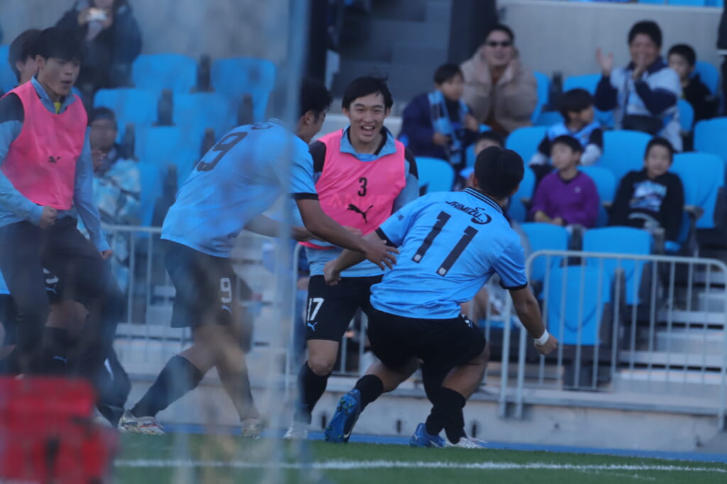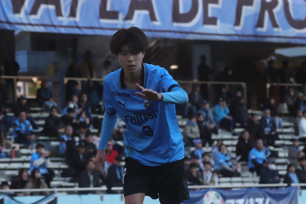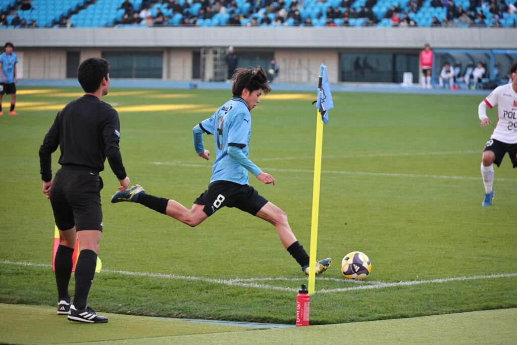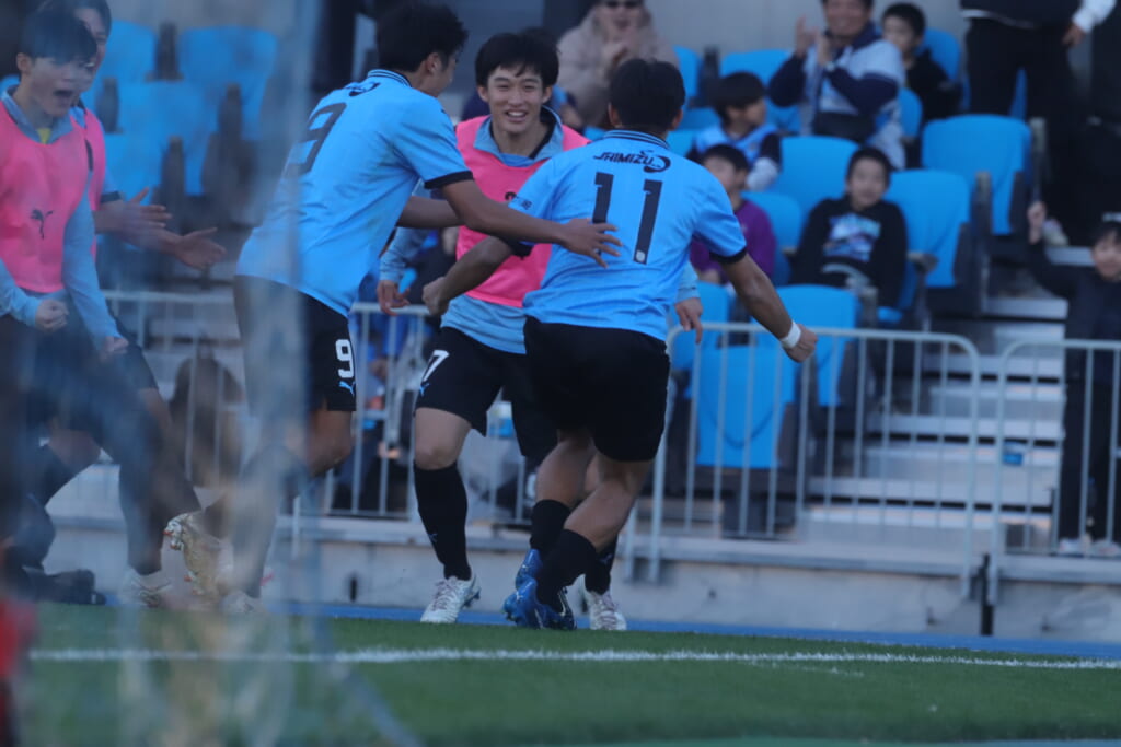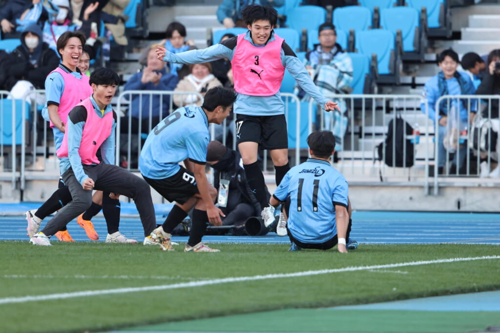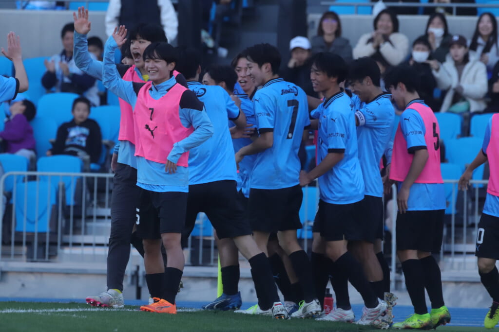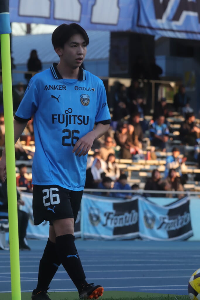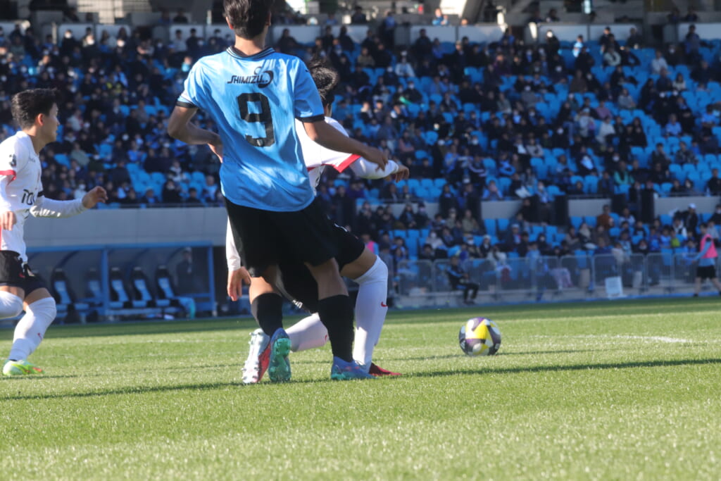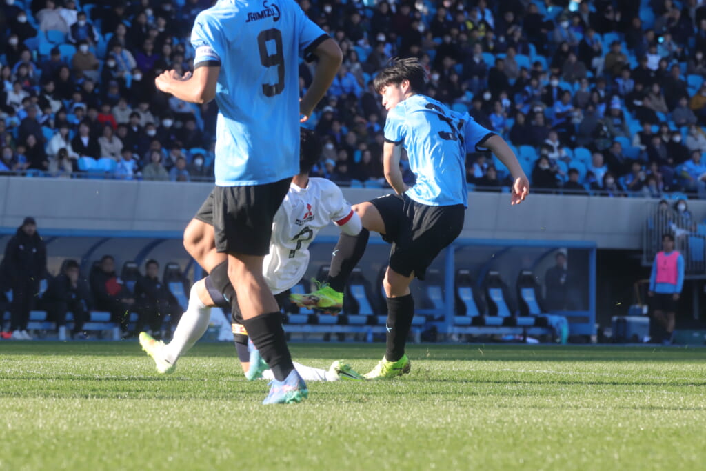 フロンターレは平塚、新堀が立ち、ショートコーナーを選択。平塚のパスにエリア外右で小川尋斗がシュートを打つと大槻がセーブするもこぼれ球に詰めたのは楠田。